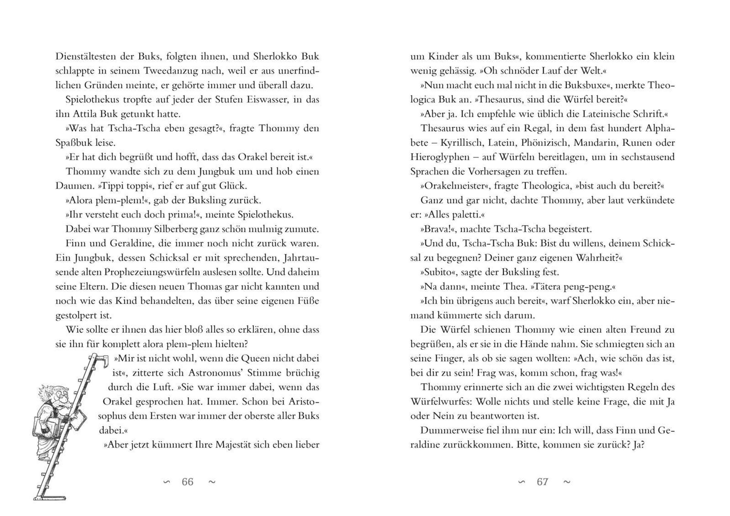 In der Magischen Bibliothek der Buks kommt ein neuer Buchschutzgeist zur Welt - doch zum Feiern bleibt den Hütern der Bücher und Nola, Thommy und Mira keine Zeit: Finn und Geraldine geraten in ein Buch ohne Ausweg und müssen mithilfe des launischen Phantánasischen Schlüssels durch Zeit und Mythen reisen. Doch der geheime Orden der Athanæer verbündet sich für seine Jagd nach genau diesem Schlüssel mit dem größten Feind der Buks, dem rachsüchtigen Lucius Degen - und der will in das Herz der Buchwelt, um es endgültig zu zerstören. Können Nola, Mira, der junge Orakelmeister Thommy und die Buks die Bibliothek verteidigen und Finn und Geraldine retten?