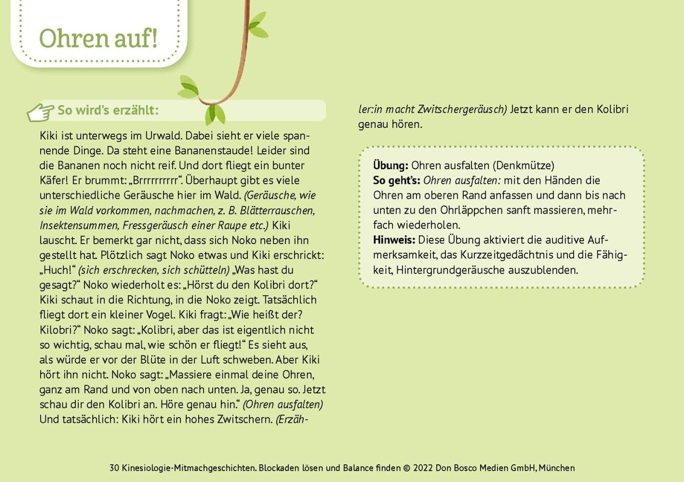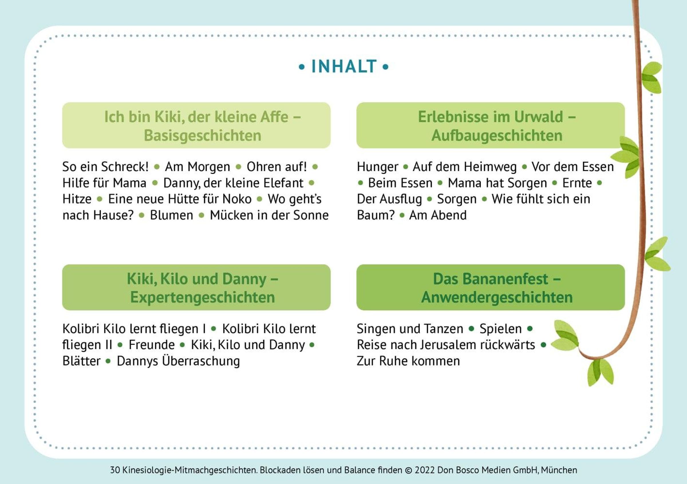 Eingebettet in die Geschichte von Kiki und seinen Freunden lernen die Kinder spielerisch die Grundübungen der Kinesiologie kennen. Dazu sind dank der ausführlichen Beschreibungen auf den Bildkarten auch bei Lehrer: innen und Erzieher: innen keine Vorkenntnisse nötig. Nach und nach kommen immer mehr Entspannungsübungen pro Einheit zum Einsatz, bis das große Bananenfest stattfindet: Eine lustige Anwendergeschichte, in der Tanz, Spiel und Gesang mit den Übungen verbunden werden.