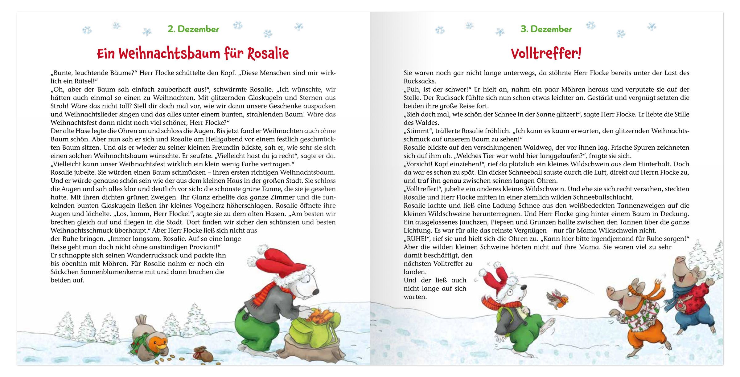 Rosalie, das kleine Rotkehlchen, hat einen großen Wunsch: einen festlich geschmückten Weihnachtsbaum, so wie sie ihn in der Stadt gesehen hat. Gemeinsam mit ihrem besten Freund, dem Hasen Herrn Flocke, macht sie sich auf den Weg, den schönsten Weihnachtsschmuck zu finden. Unterwegs begegnen die beiden vielen anderen Tieren, die ebenfalls von einem richtigen Weihnachtsfest träumen. Ob es Rosalie und Herrn Flocke gelingt, rechtzeitig bis Heiligabend einen wunderschönen Weihnachtsbaum für alle Tiere zu schmücken?