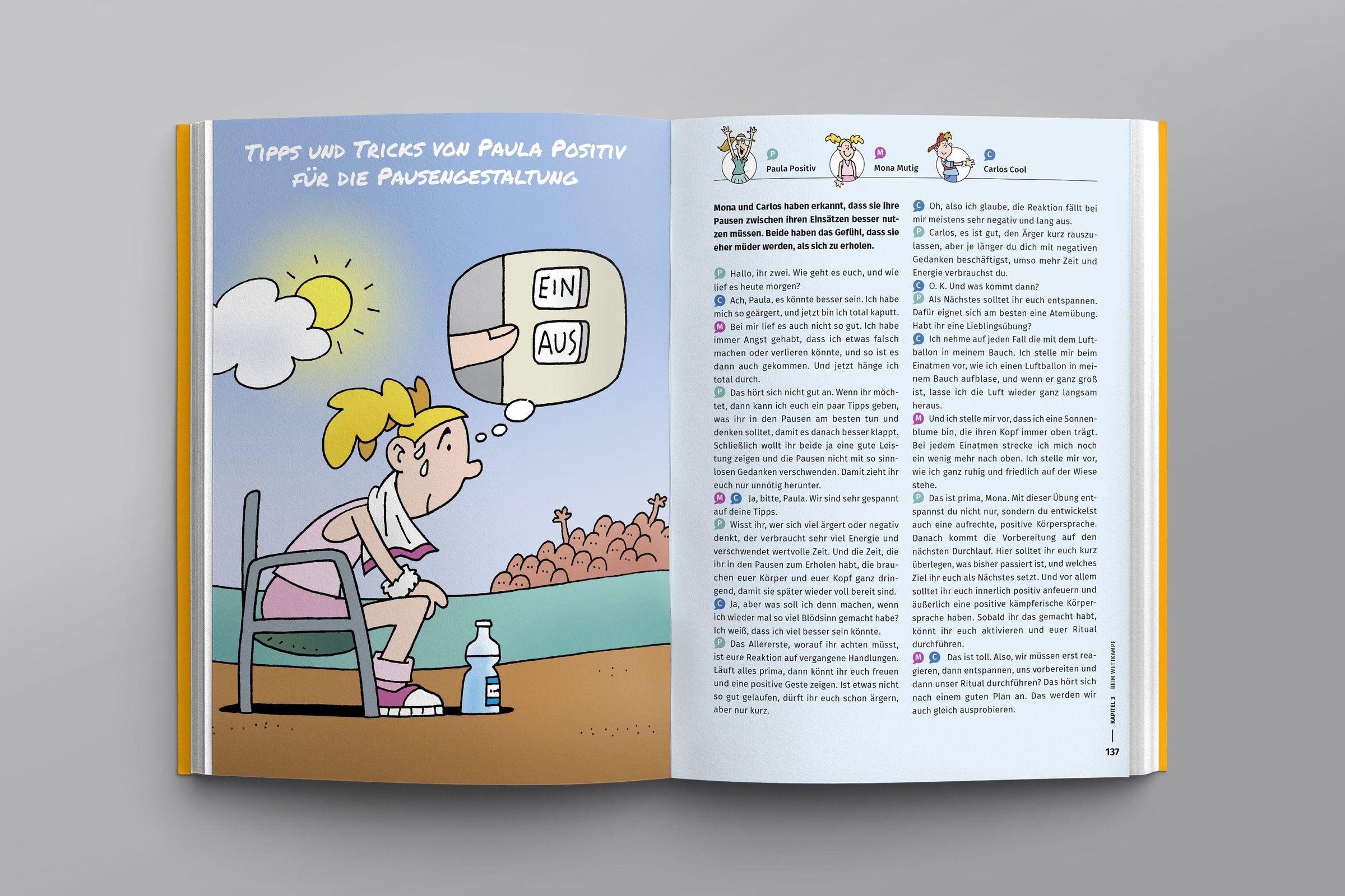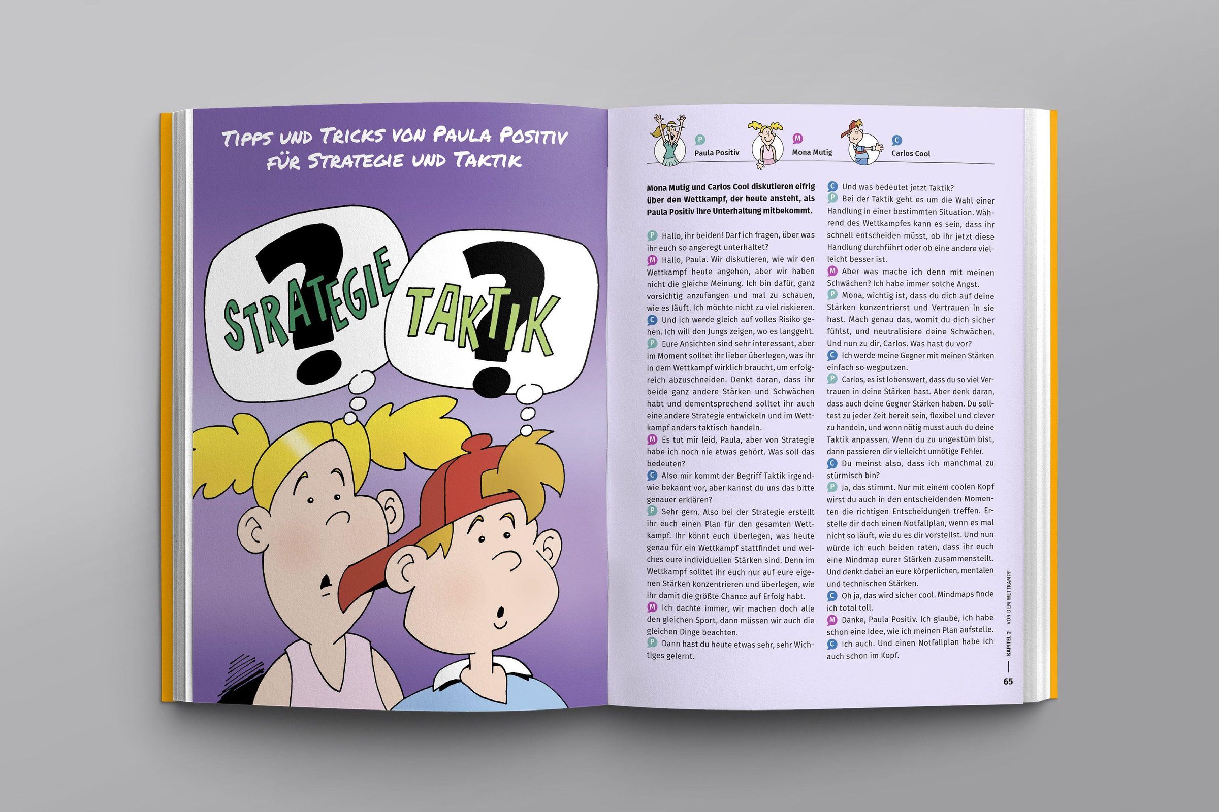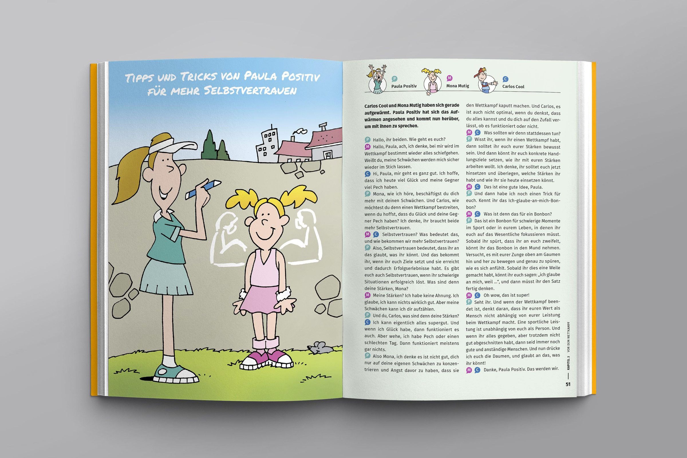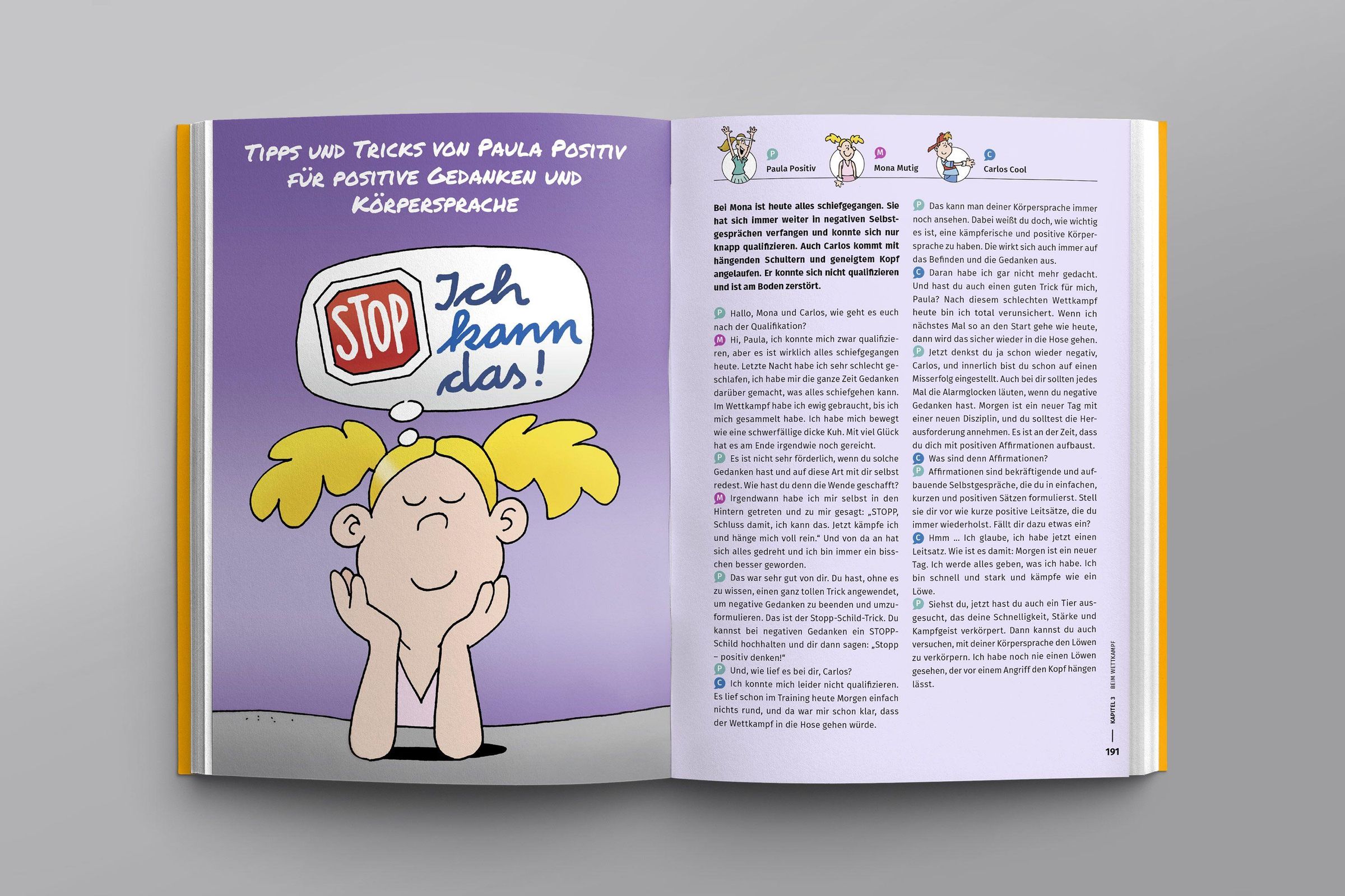 Die Comic-Geschichten mit der Mentaltrainerin Paula Positiv und ihren Sportlern Carlos Cool und Mona Mutig helfen Athleten dabei, sich mit den Charakteren und deren schwierigen Situationen zu identifizieren und die unterschiedlichsten Anforderungen in ihrem Sport zu bewältigen. Die Geschichten können in allen Altersgruppen und in verschiedenen Sportarten eingesetzt und in das Training oder den Wettkampf integriert werden.