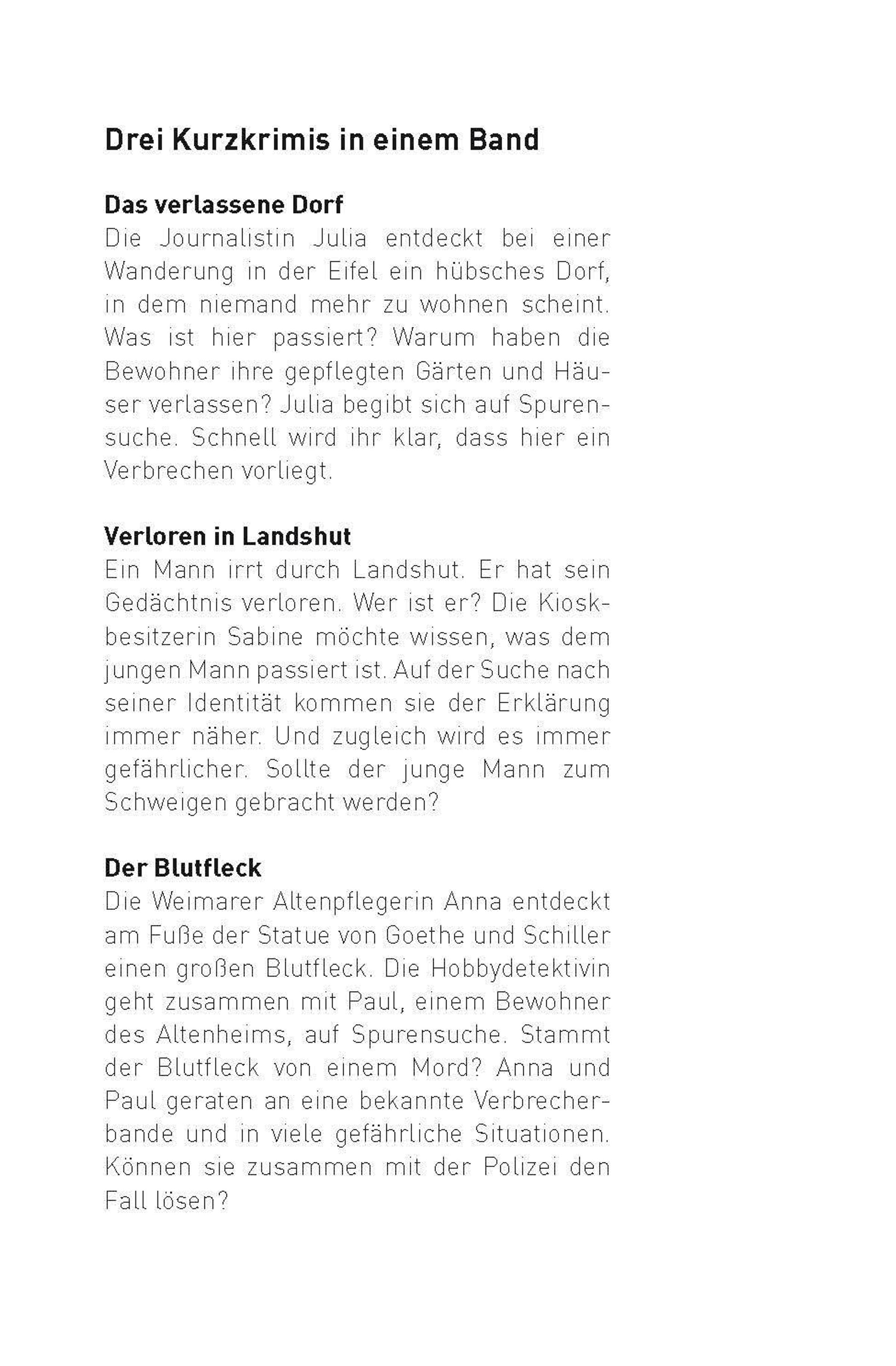 Ein mysteriöser Blutfleck im Zentrum von Weimar, der wohl von einem Mord stammt, sorgt für Aufsehen. Ein junger Mann, der sein Gedächtnis verloren hat, irrt verzweifelt durch Landshut. Und ein Dorf in der Eifel, dessen Bewohner innerhalb weniger Wochen ihr Zuhause verlassen haben, wirft unzählige Fragen auf - Hochspannung auf Deutsch!