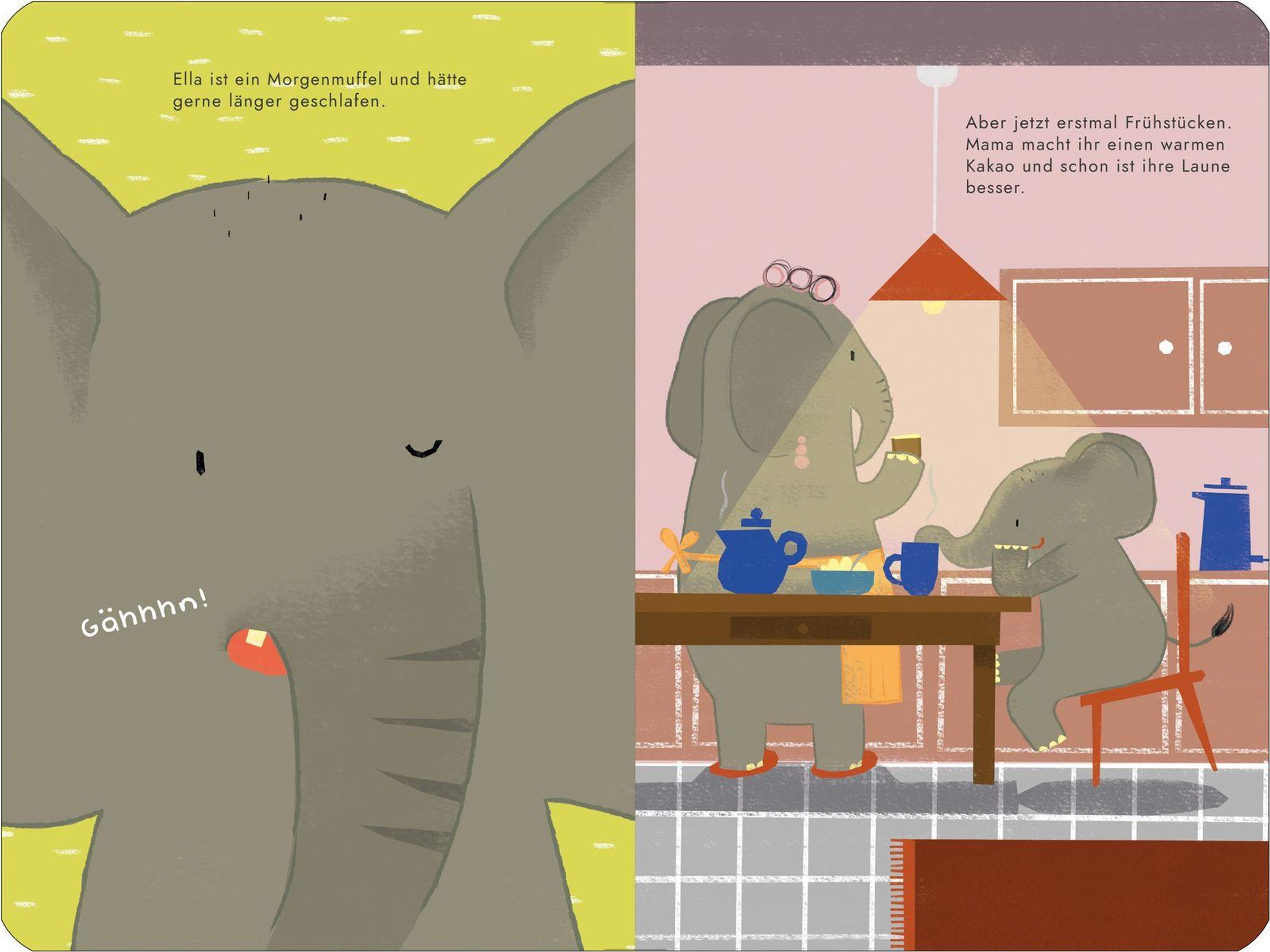 Gute-Nacht-Geschichten gibt es viele, doch wie startet man eigentlich gut gelaunt in den Tag? In diesem lustigen Pappbilderbuch zeigen uns tierische Familien ihre ganz persönlichen Morgenrituale: Während Elefantenmädchen Ella erst nach einem Kakao ansprechbar ist, braucht Siebenschläferin Lisbeth sogar eine echte Aufwachmaschine. Ob verschlafen, wuselig oder total verkuschelt - am Ende treffen sich alle Tiere munter in der Kita wieder.