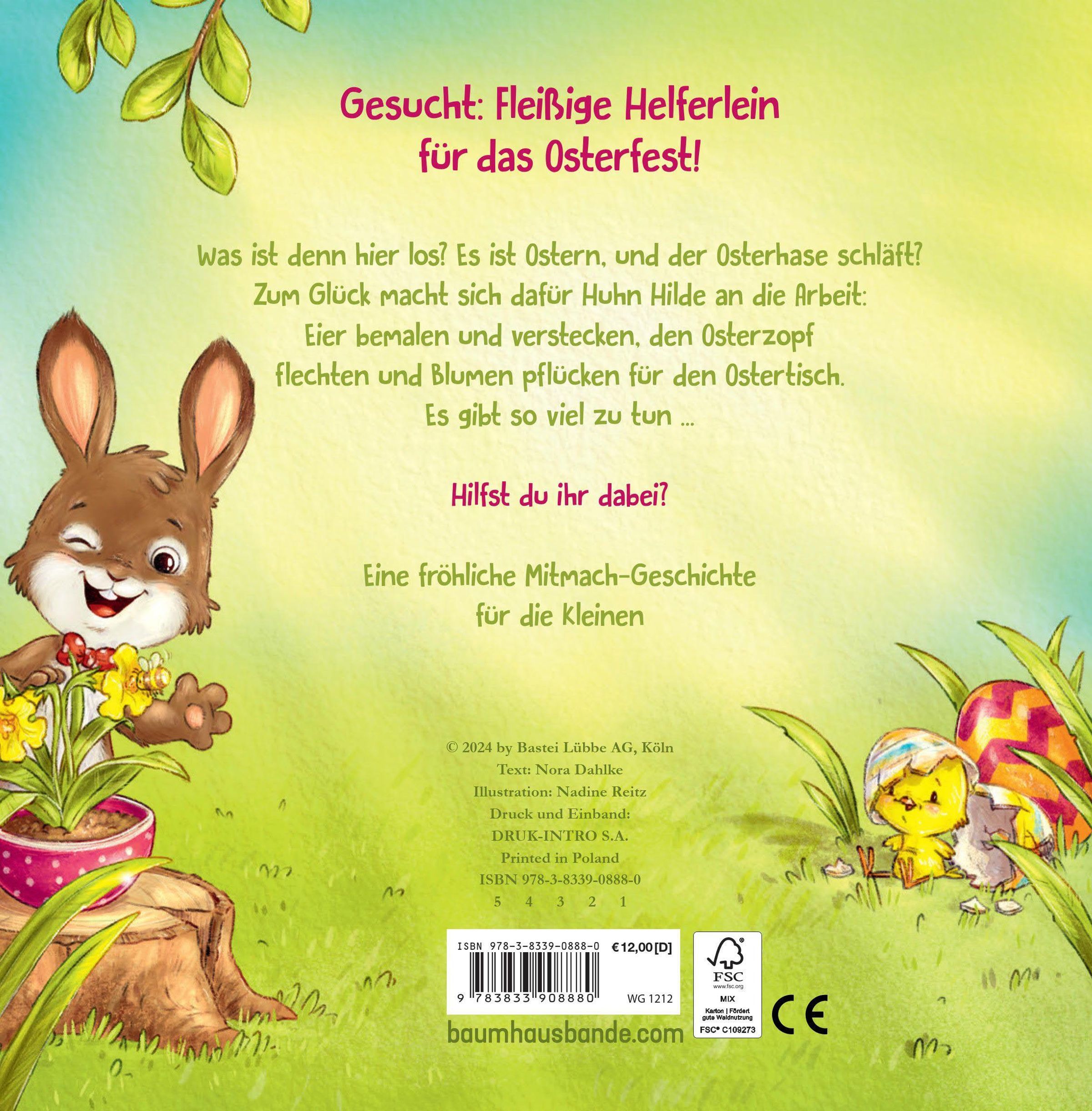 Was ist denn hier los? Es ist Ostern, und der Osterhase schläft? Zum Glück macht sich dafür Huhn Hilde an die Arbeit: Eier bemalen und verstecken, den Osterzopf flechten und Blumen pflücken für den Ostertisch. Es gibt so viel zu tun! Hilfst du ihr dabei?