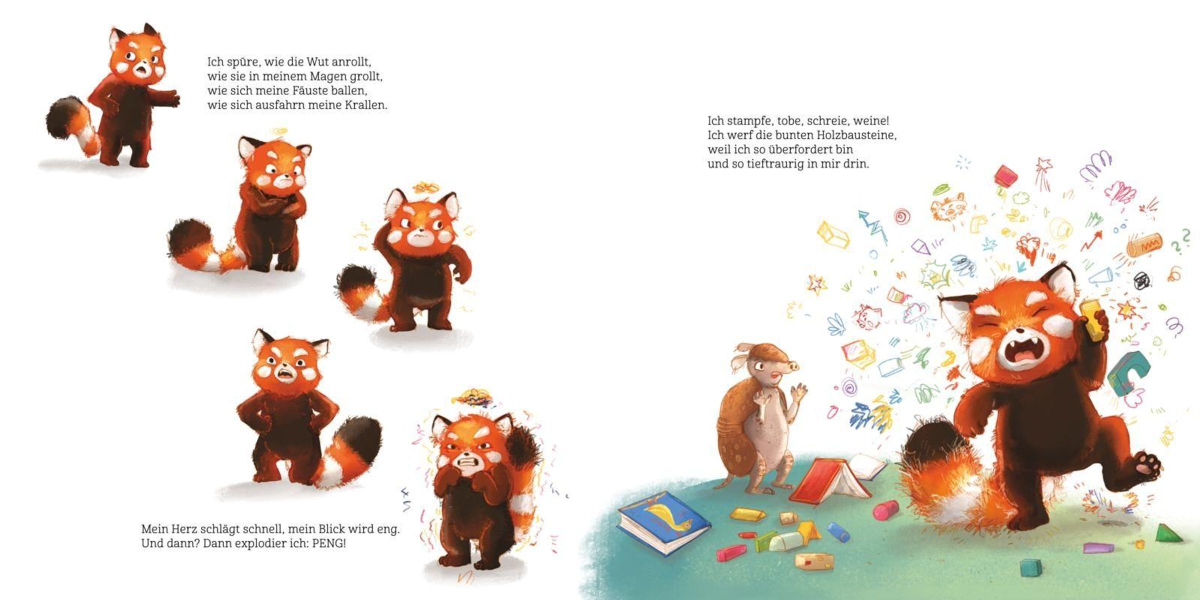 Tilly, das Pandakind, ist ein ziemlich temperamentvoller kleiner Roter Panda. Tilly kann flitzen und gut klettern, sie stürmt fröhlich und mit lautem Hallo los, sie ist mutig und zeigt, was ihr nicht passt. Tillys Wunsch nach Selbstbestimmtheit und ihr Wille sind stark, doch ihre Frustrationsgrenze noch niedrig. Immer wieder spürt sie die Wut im Bauch. Lästern die großen Geschwister, wie babyklein ihr Spielzeug sei ... Tilly wird wütend. Bittet Mama zu warten, weil der Babybruder versorgt werden muss ... Tilly wird wütend. Selbst wenn es Brot statt Pizza gibt, in der Kita gerade Bastelzeit statt Tobezeit ist ... Tilly wird wütend. Und manchmal überrollt die Wut das kleine Pandakind so sehr, dass sie stampft und schreit. Dann möchte sie kratzen, beißen und mit Dingen werfen. Doch wie gut, dass Mama weiß, wie das ist mit der Wut im Bauch. Und sie weiß auch, dass wir die Wut nicht verbieten können. Aber ihr zuhören, damit sie kleiner werden kann.