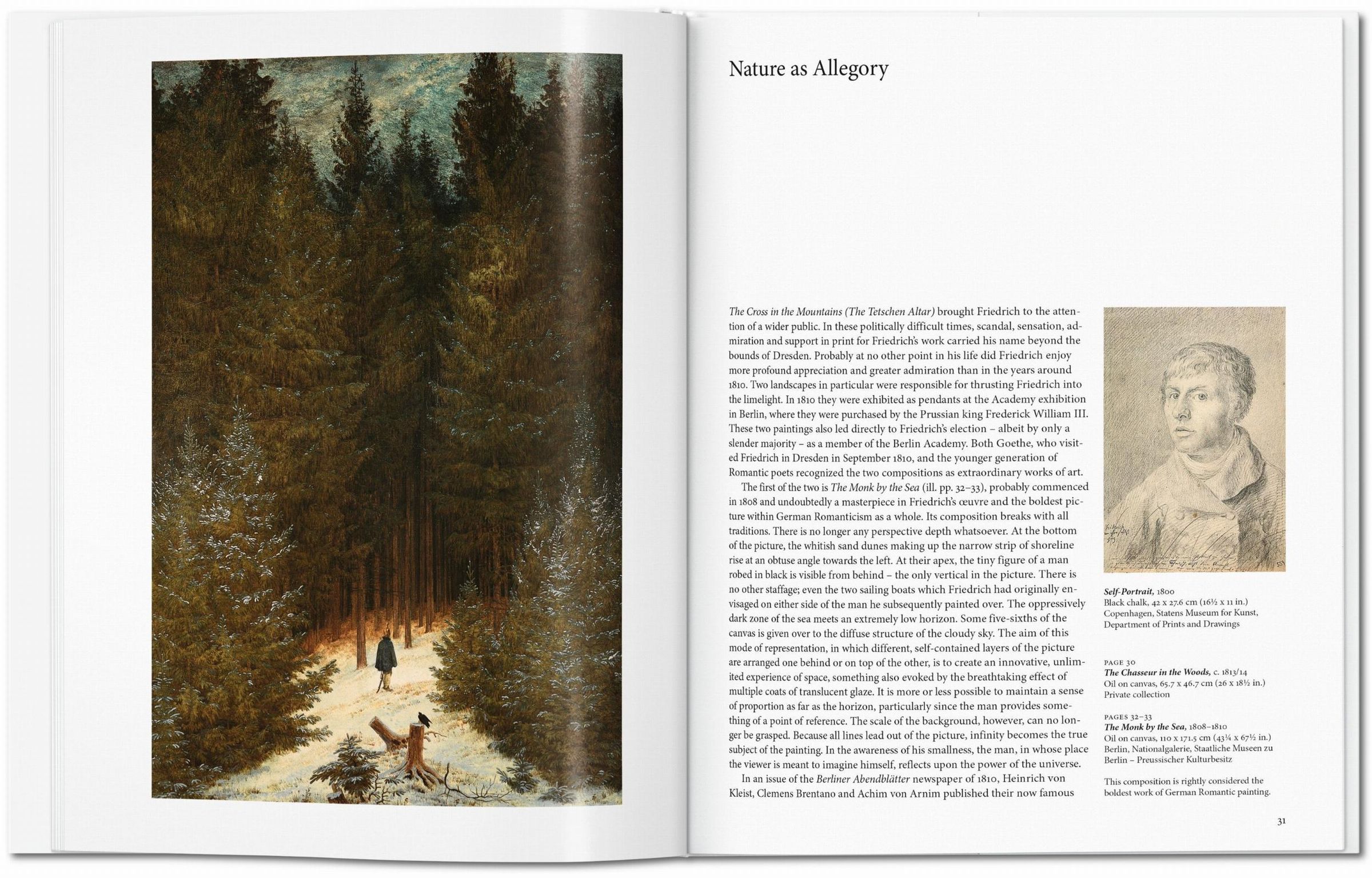Die Schönheit der Natur und menschliche Einsamkeit sind bestimmende Themen im Werk von Caspar David Friedrich (1774-1840). Häufig positioniert er eine klein dimensionierte menschliche Figur in einer weiten Landschaft, wie auf seinen berühmten Gemälden Mönch am Meer und Der Wanderer über dem Nebelmeer . Lange Zeit wurden die Bedeutung und der Einfluss des großen Künstlers der Romantik unterschätzt. Als er starb, war Friedrich von seinen Zeitgenossen bereits vergessen, erst im frühen 20. Jahrhundert entdeckte man ihn wieder. Heute gilt er als wichtigster deutscher Maler seiner Generation und als Vorläufer der Expressionisten.