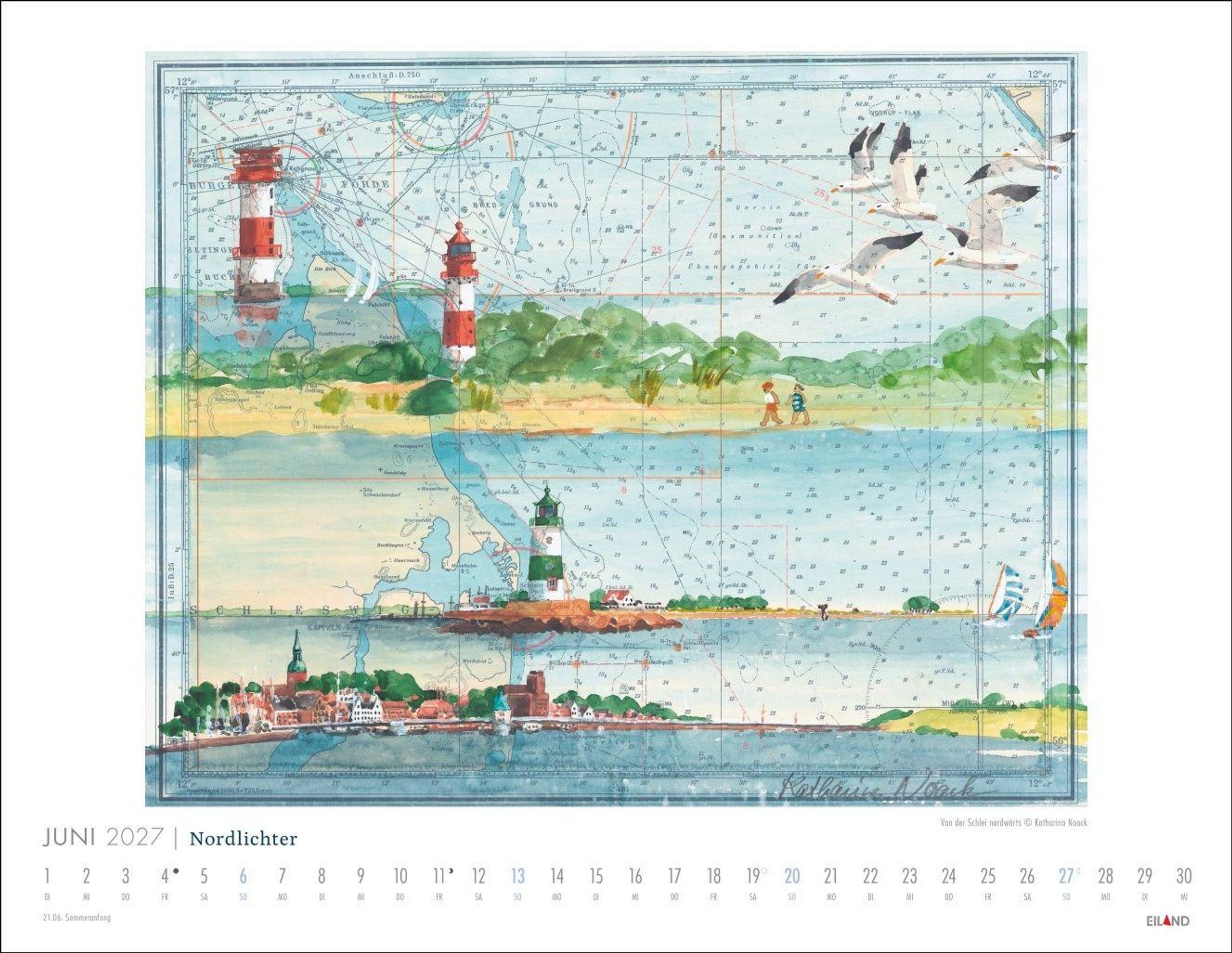 "Nordlichter" in großer Schrift, darunter "Kalender 2027" und "See(h)karten von Katharina Noack". Illustration mit Leuchttürmen, Küste und Möwen., Kalender