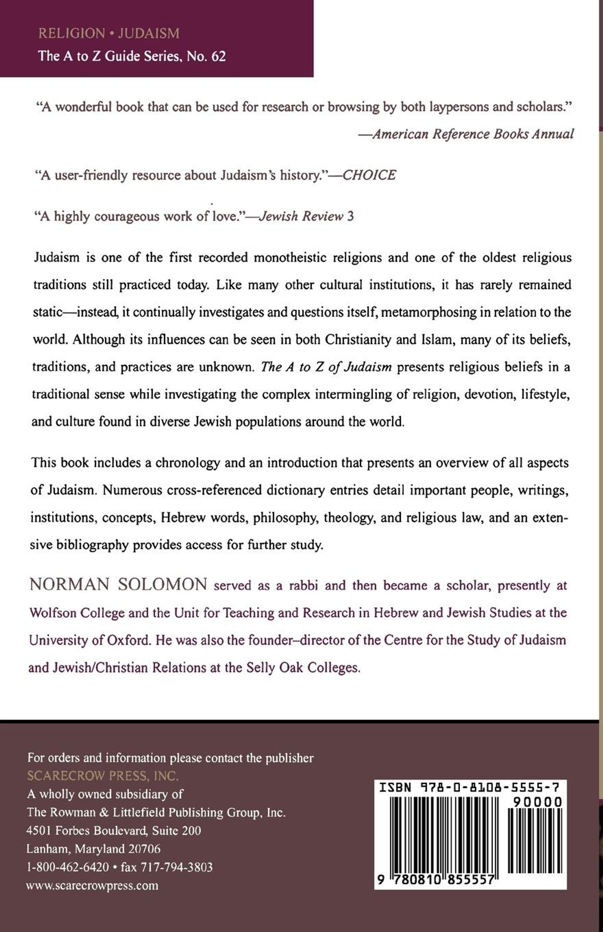 Judaism, the religion of the Jewish people, is one of the first recorded monotheistic religions, and as such is one of the oldest religious traditions still practiced today. While its influences can be seen in the religions of both Christianity and Islam, many of its beliefs, traditions, and practices are unknown. The second edition of The A to Z of Judaism doesn't just present "religious" beliefs in a traditional sense but investigates the complex intermingling of religion, devotion, lifestyle, and culture as it is found in diverse Jewish populations around the world and as it has evolved over the course of recent human history. Judaism, like many other cultural institutions, has rarely remained static-instead, continually investigating and questioning itself, metamorphosing in relation to the world.