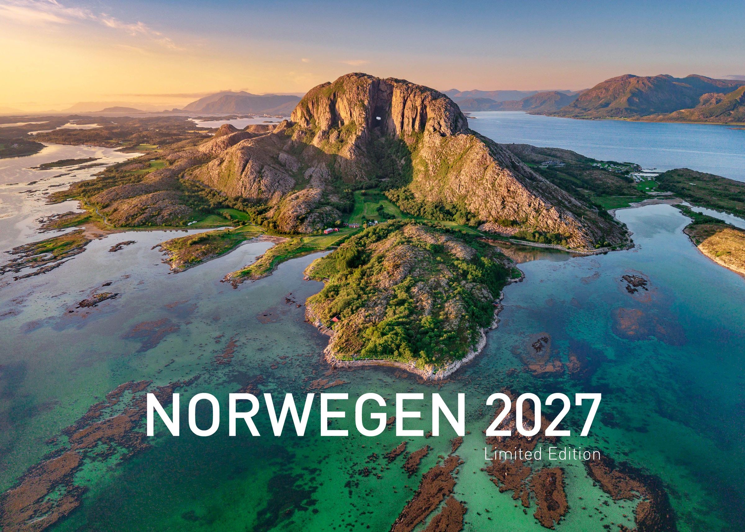 NORWEGEN 2027 Limited Edition. Luftaufnahme einer malerischen Küste mit Bergen und Wasser im Sonnenuntergang., Kalender