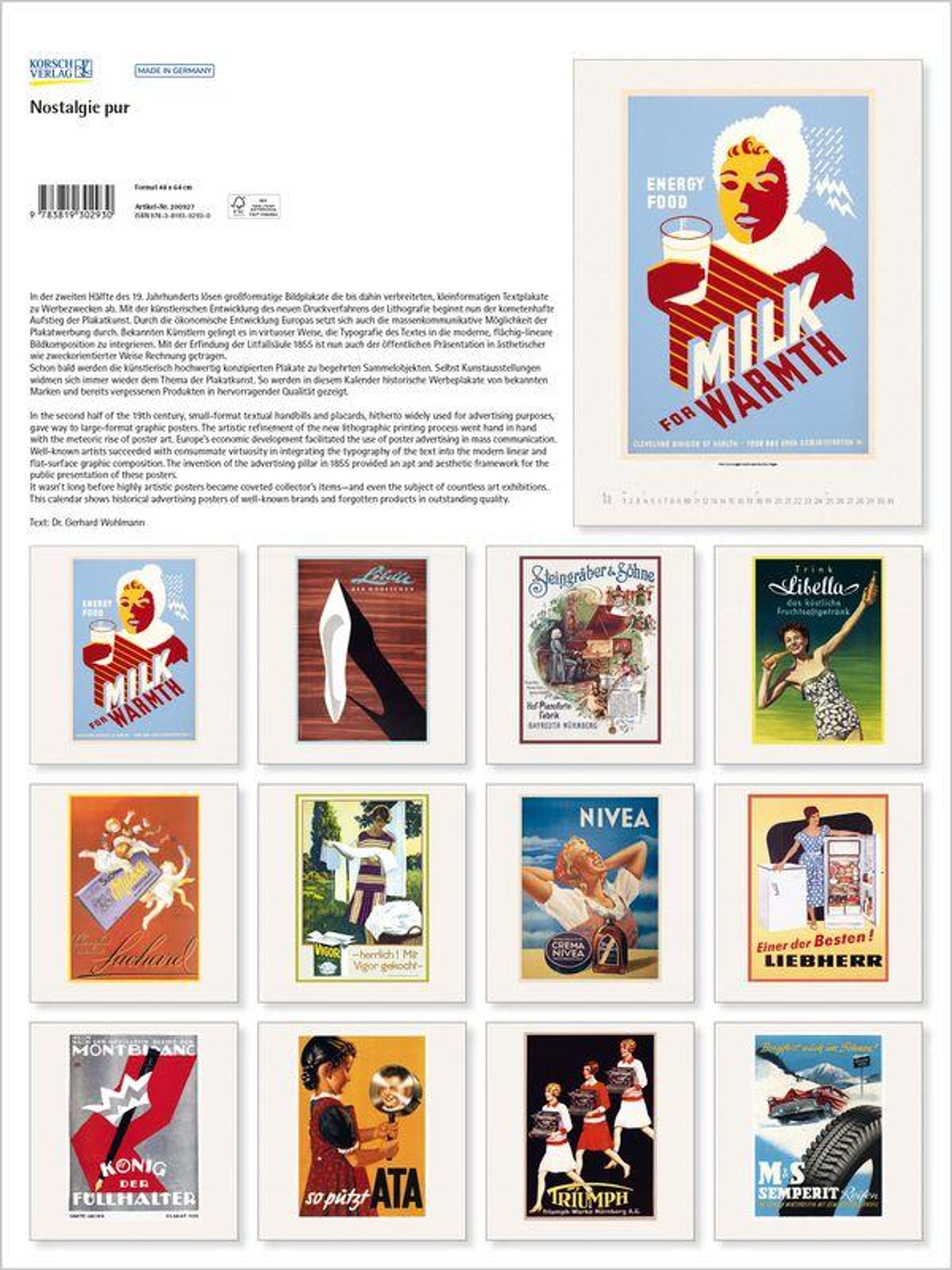 Nostalgie und eine Prise Retro-Charme zaubert dieser großformatige Kalender an die Wand. Die historischen Plakate zeigen Werbung von bekannten Marken und zum Teil in Vergessenheit geratenen Produkten in hervorragender Qualität. Bis heute haben die farbenfrohen Werbemittel nichts von ihrem Reiz eingebüßt.