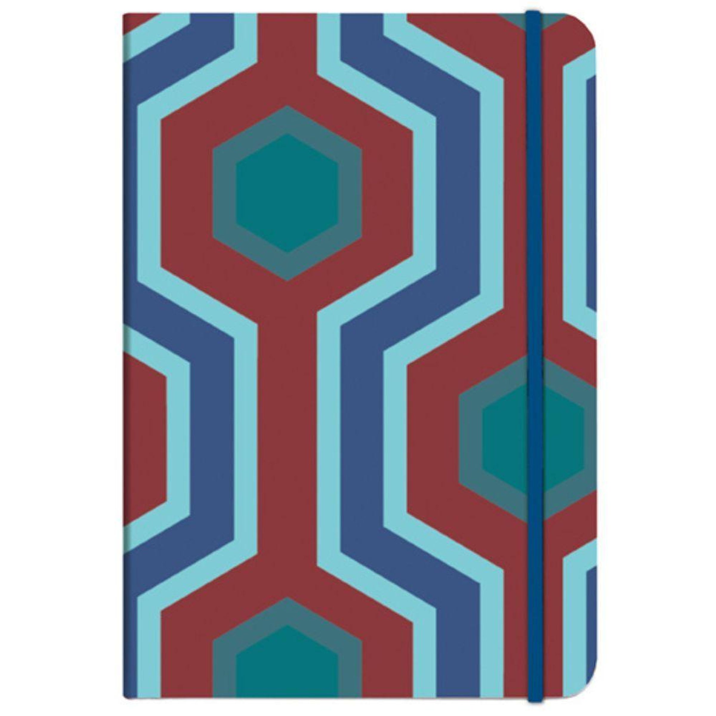 Geometrisches Muster in Blau und Rot mit sechseckigen Formen. Ein elastisches Band ist an der rechten Seite angebracht., Diverse