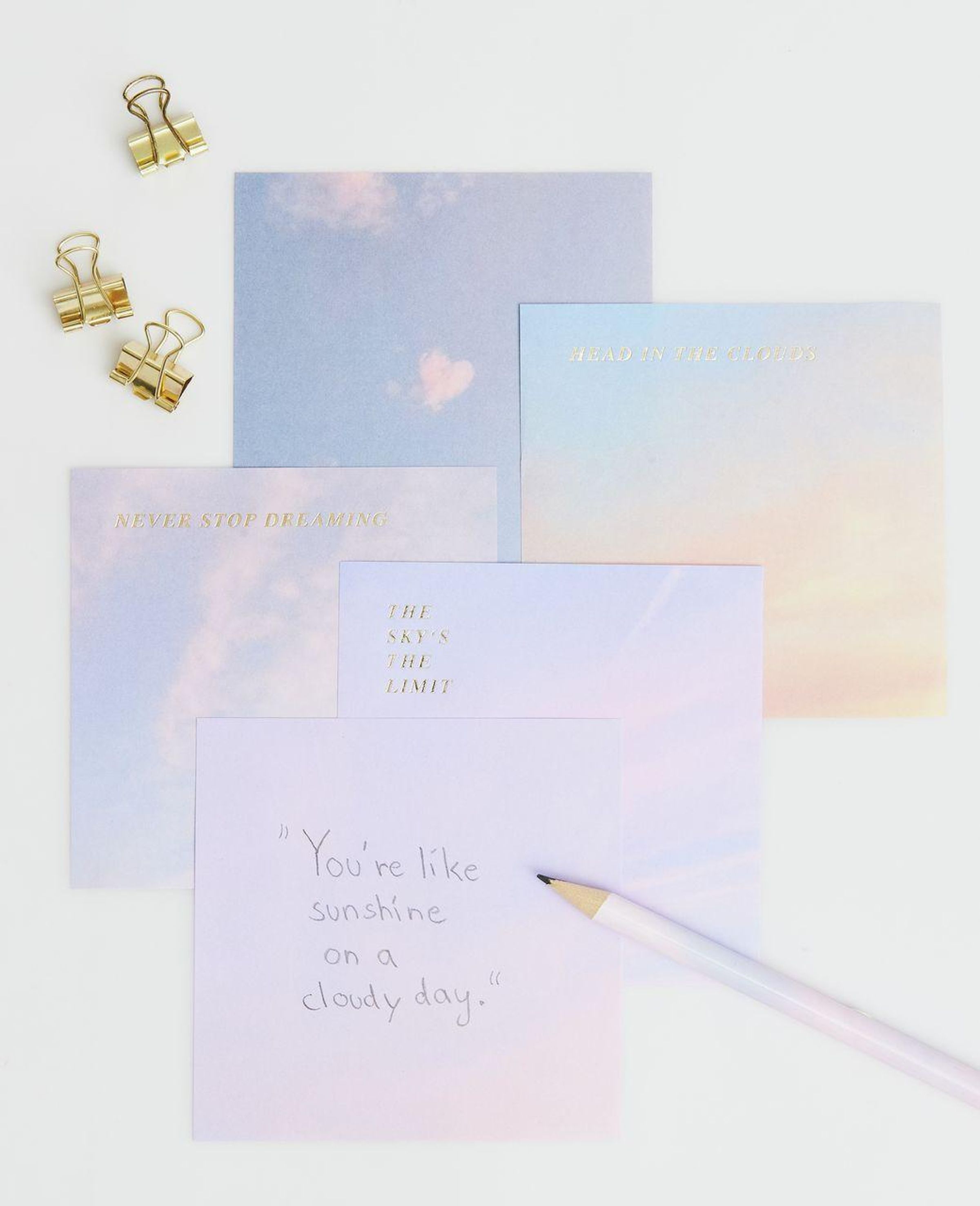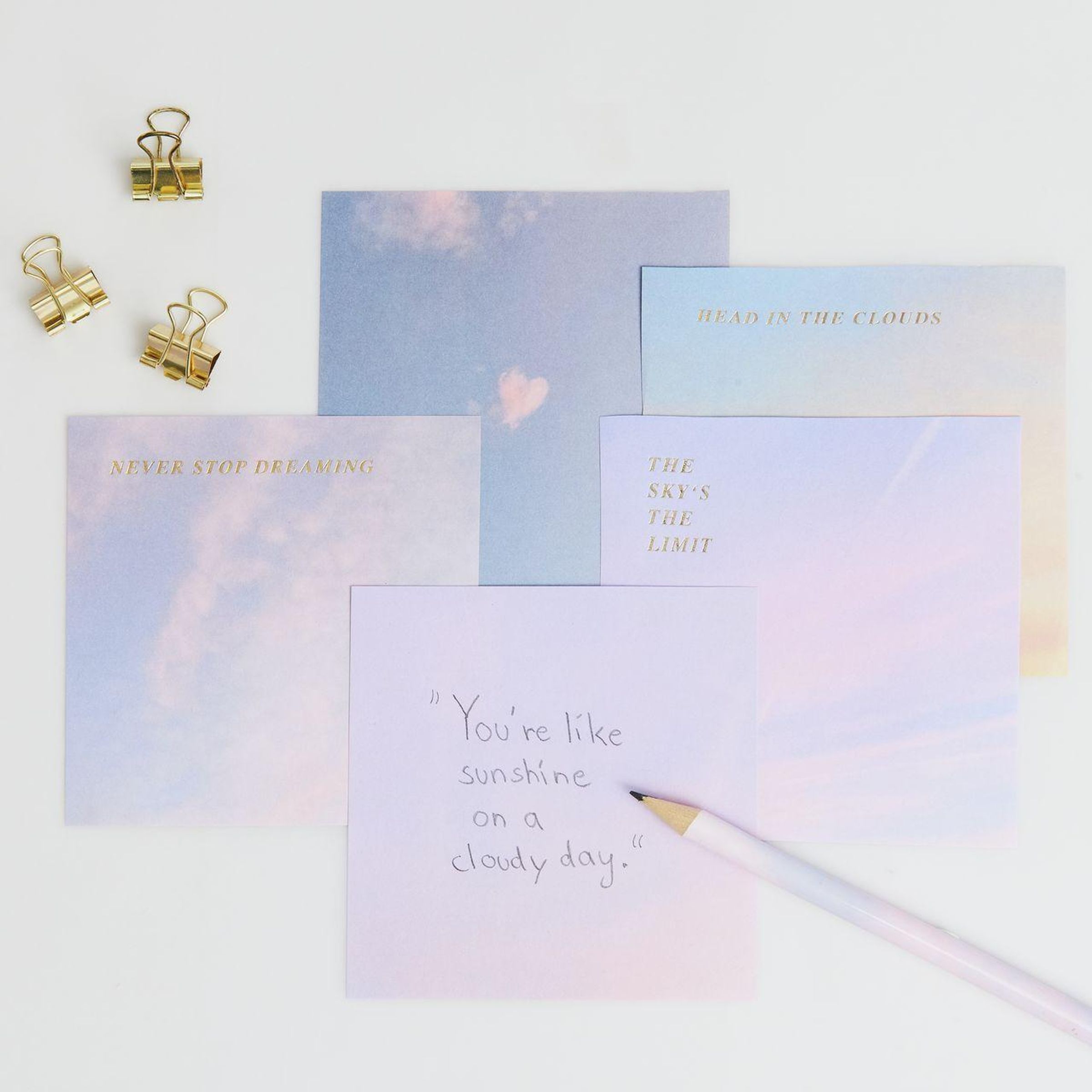 Die Notizzettel-Box "The Sky is the Limit" enthält 200 Blätter in fünf verschiedenen Designs. Einige Blätter sind zusätzlich mit englischen Schriftzügen versehen, welche aus Hot Foil Gold gefertigt sind. Die Zettel sind einseitig bedruckt und haben eine Größe von 9 × 9 cm.