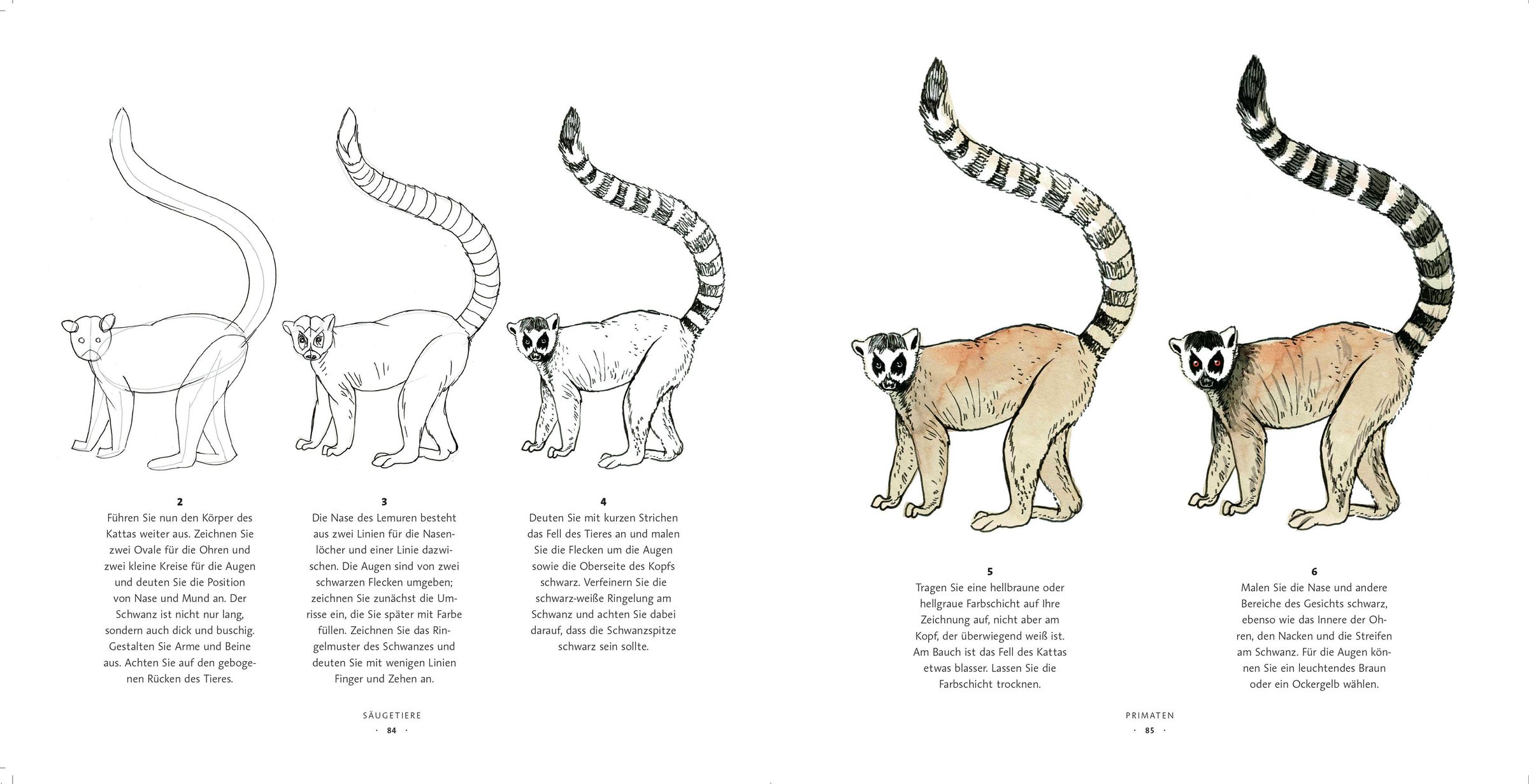 Elegante Giraffen, behäbige Faultiere oder gefährliche Krokodile: So unterschiedlich Wildtiere auch aussehen, lassen sie sich doch alle spielend leicht zeichnen. Genaue Schritt-für-Schritt-Anleitungen zeigen, wie aus einfachen Formen detaillierte Zeichnungen entstehen und mit Wasserfarben Fell oder Haut akzentuiert werden können. Zu jedem der 26 Tiere gibt es Informationen über Merkmale, Verhalten und Lebensraum, die den zeichnerischen Zugang erleichtern.