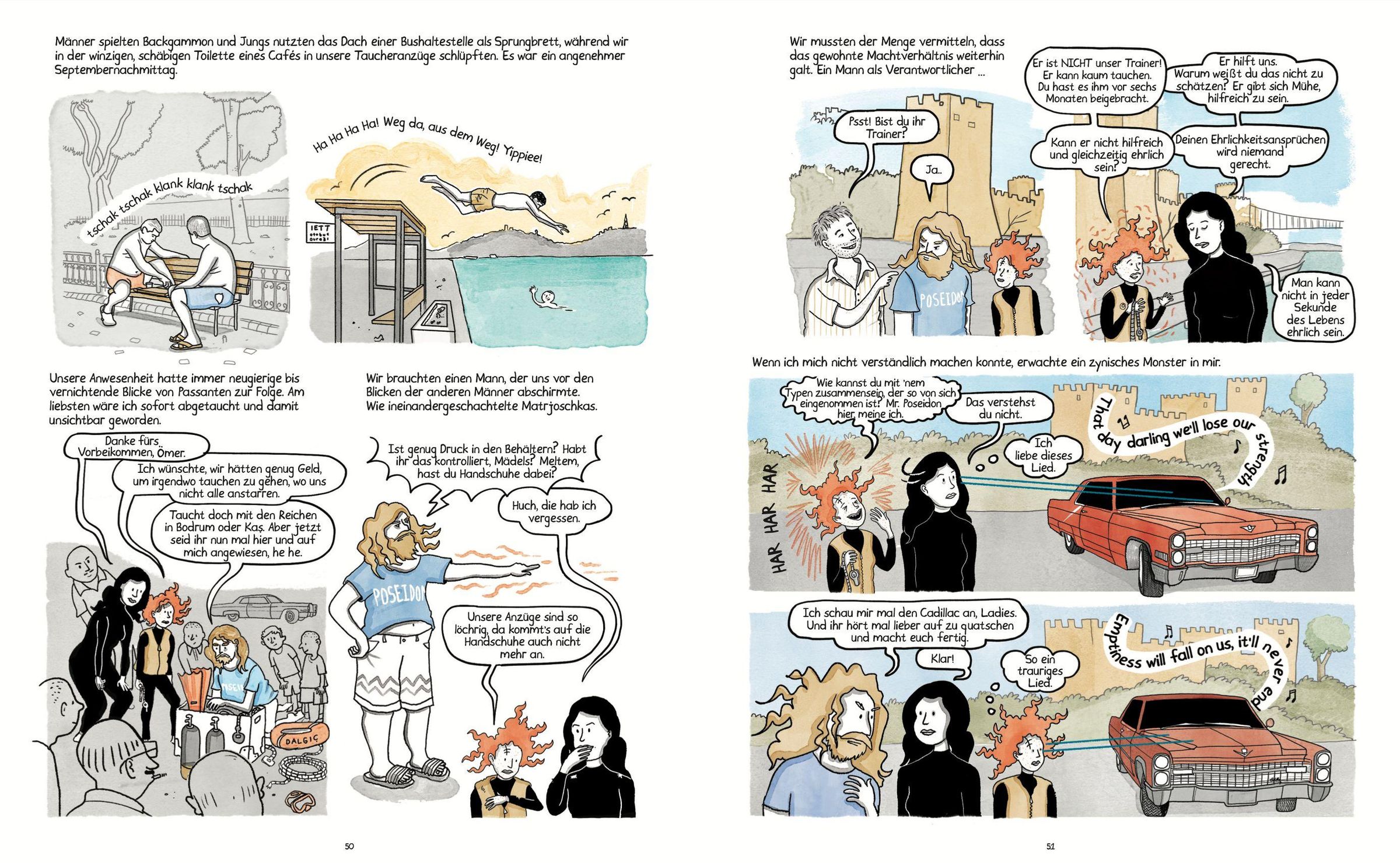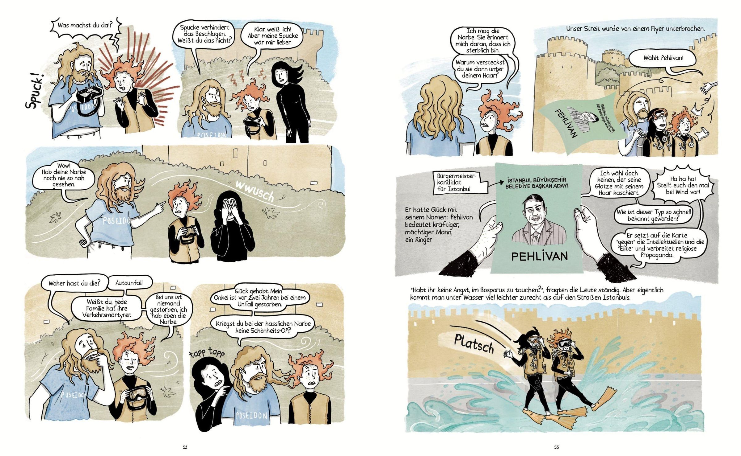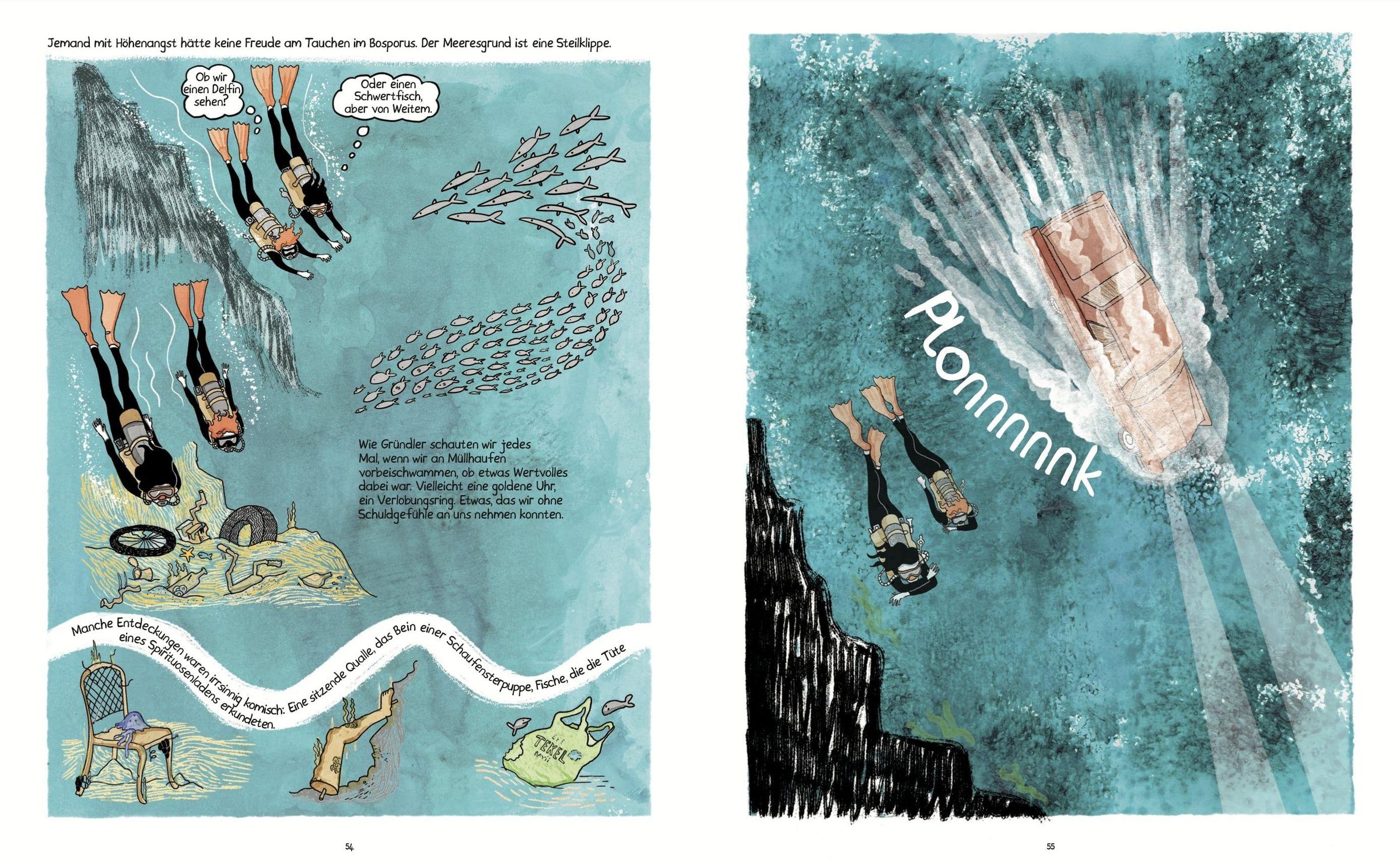 Istanbul, 1990er-Jahre, Wahlkampfzeit. Ece und Meltem, zwei mittellose Studentinnen, begeistern sich für das Tauchen. Eines Tages, als sie im Bosporus tauchen, werden sie Zeuginnen des seltsamen Todes einer Mitbewohnerin in ihrem Wohnheim. Schockiert beschließen sie, Nachforschungen anzustellen, und sehen sich dabei mit korrupten Politikern, finanziellem Druck und den Zwängen einer Gesellschaft konfrontiert, die Frauen im Alltag zu wenig Raum lässt. In den trüben Gewässern Istanbuls zeichnet ein eindrucksvolles Bild des Lebens in der Türkei in den 1990er-Jahren, zwischen Freiheitsdrang und lähmenden politischen und wirtschaftlichen Spannungen. Sowohl die Geschichte als auch die Figuren sind von den jungen Jahren der Autorin inspiriert und erinnert an ein Abenteuer à la Tim und Struppi.