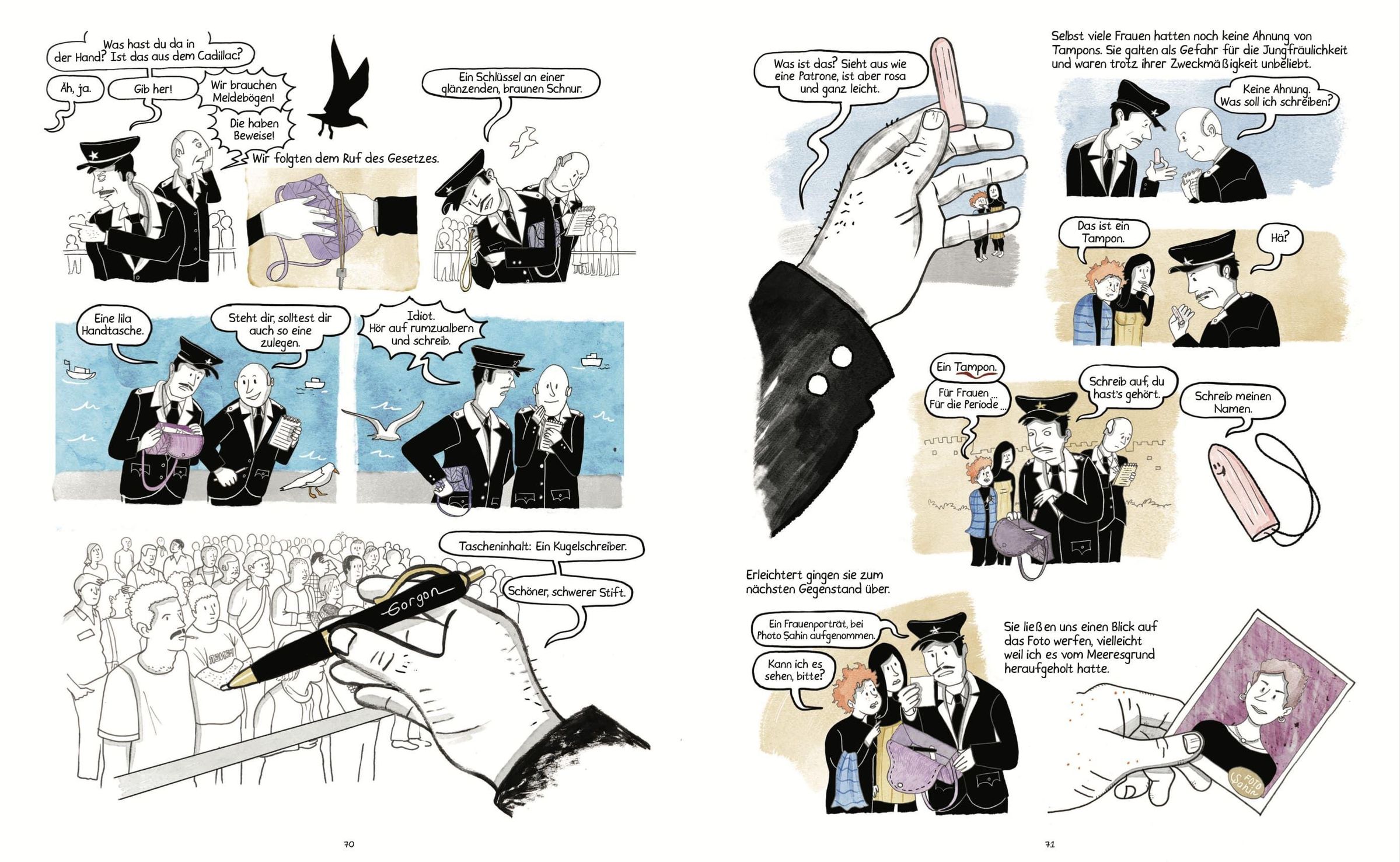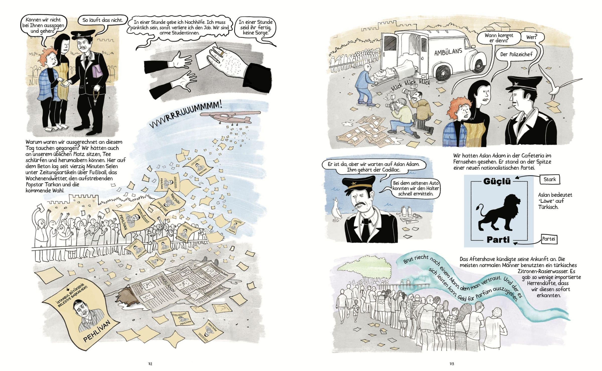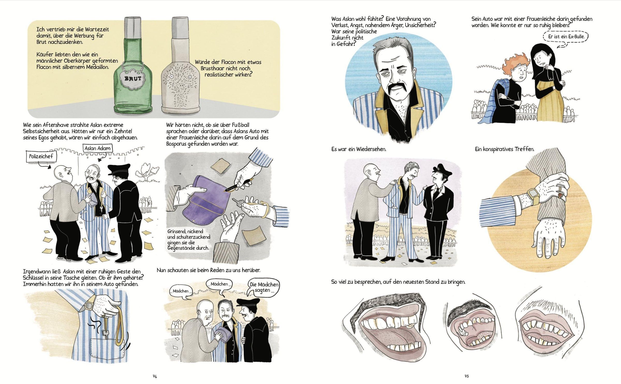 Istanbul, 1990er-Jahre, Wahlkampfzeit. Ece und Meltem, zwei mittellose Studentinnen, begeistern sich für das Tauchen. Eines Tages, als sie im Bosporus tauchen, werden sie Zeuginnen des seltsamen Todes einer Mitbewohnerin in ihrem Wohnheim. Schockiert beschließen sie, Nachforschungen anzustellen, und sehen sich dabei mit korrupten Politikern, finanziellem Druck und den Zwängen einer Gesellschaft konfrontiert, die Frauen im Alltag zu wenig Raum lässt. In den trüben Gewässern Istanbuls zeichnet ein eindrucksvolles Bild des Lebens in der Türkei in den 1990er-Jahren, zwischen Freiheitsdrang und lähmenden politischen und wirtschaftlichen Spannungen. Sowohl die Geschichte als auch die Figuren sind von den jungen Jahren der Autorin inspiriert und erinnert an ein Abenteuer à la Tim und Struppi.