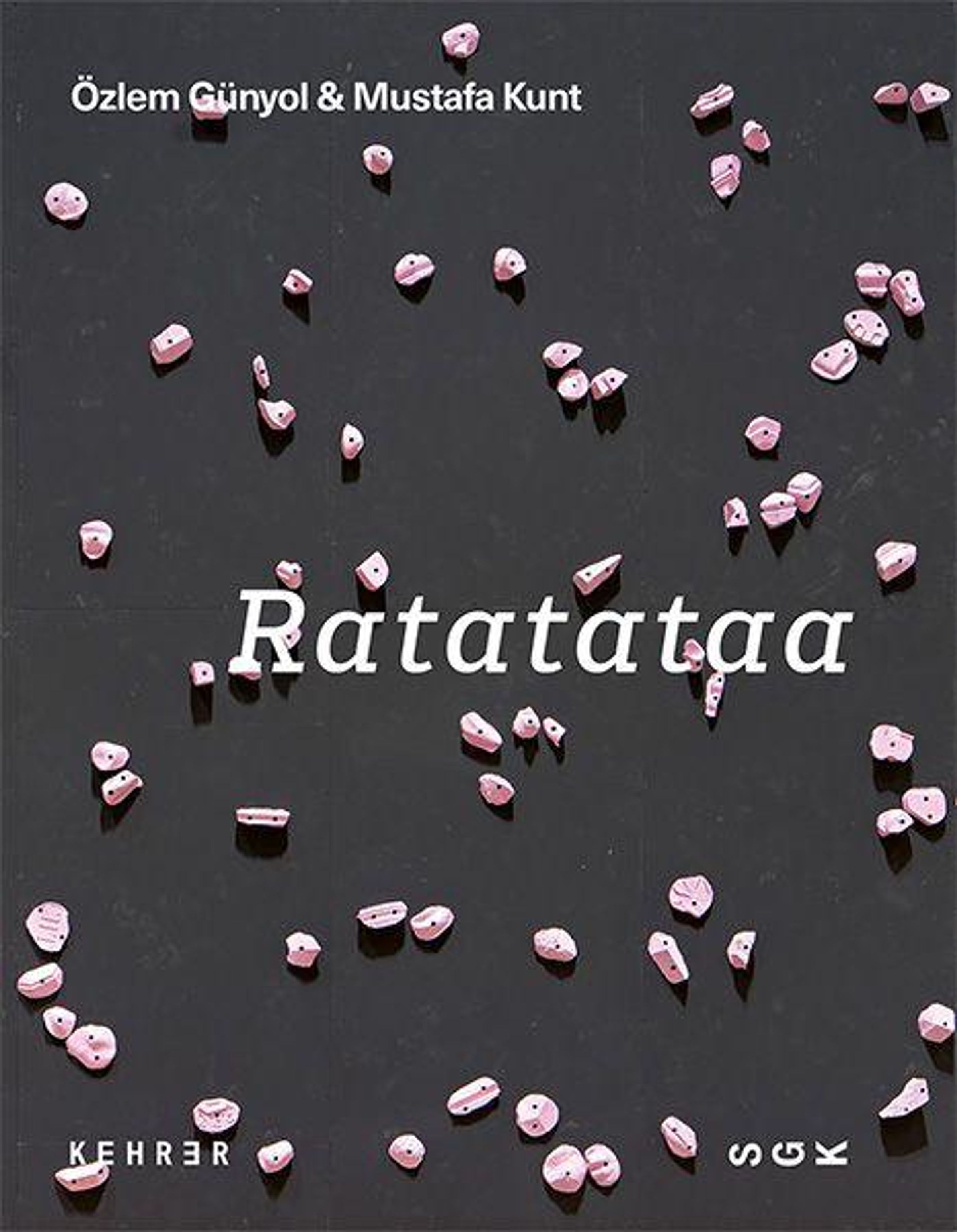 Text: "Özlem Günyol & Mustafa Kunt", "Ratatataaa". Rosa Kiesel auf schwarzem Hintergrund, minimalistisch angeordnet., Buch