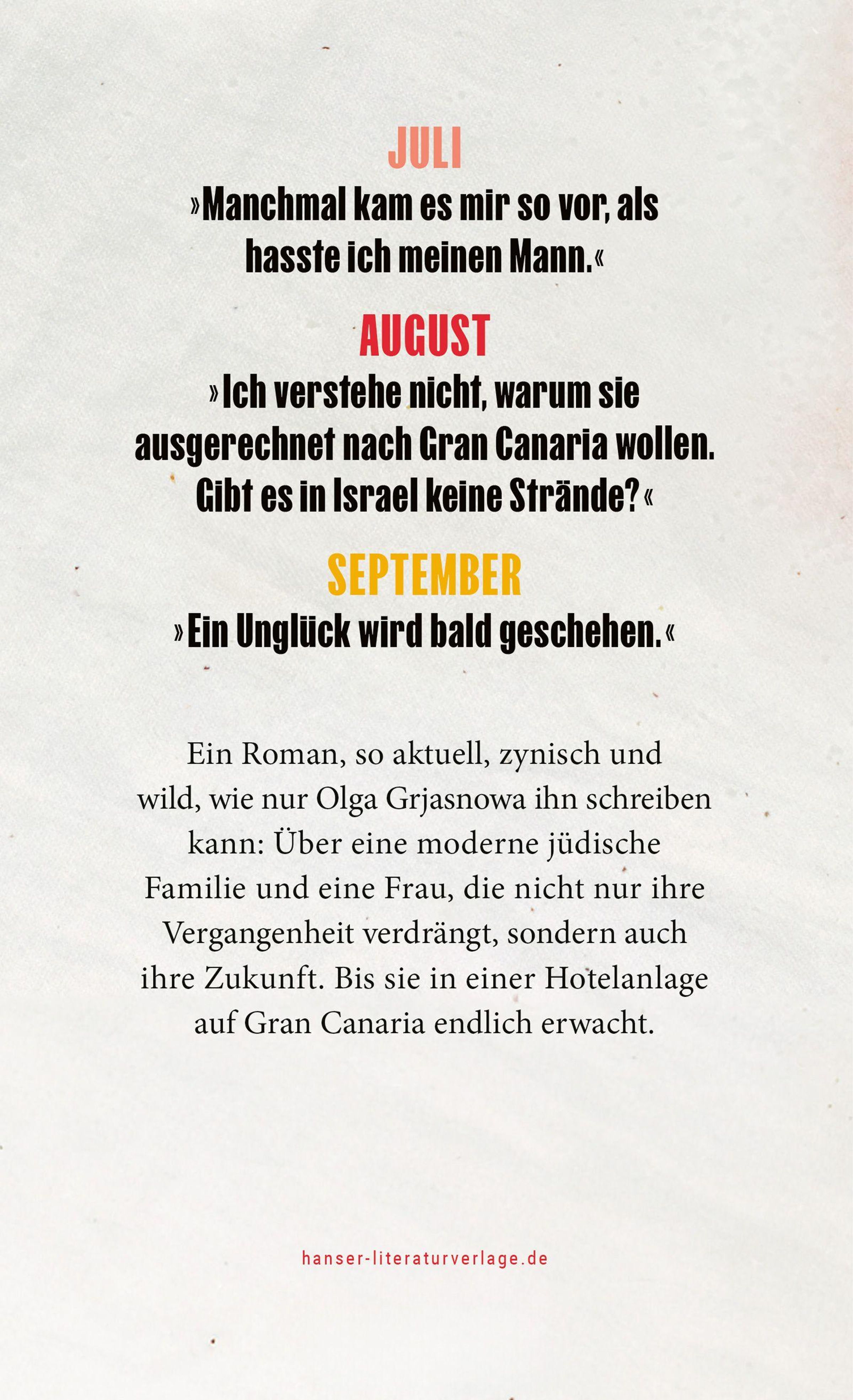 Lous zweiter Ehemann ist eine Trophäe - das muss selbst ihre Mutter anerkennen. Sergej ist Pianist und er ist jüdisch, genau wie Lou. Trotzdem ist ihre Tochter Rosa noch nie in einer Synagoge gewesen - eine ganz normale jüdische Familie in Berlin. Aber sind sie noch eine Familie, und was ist das überhaupt? Um das herauszufinden, folgt Lou der Einladung zum 90. Geburtstag ihrer Tante. In einem abgehalfterten Resort auf Gran Canaria trifft der ganze ex-sowjetische Clan aus Israel zusammen, verbunden nur noch durch wechselseitige Missgunst. Gegen die kleinen Bösartigkeiten und die vage Leere in sich trinkt Lou systematisch an und weiß plötzlich, dass die Antwort auf all ihre Fragen in der glühenden Hitze Tel Avivs zu finden ist. Ein Roman, so aktuell, zynisch und unterhaltsam, wie nur Olga Grjasnowa ihn schreiben kann, über eine Frau, deren Identität sich aus lauter Splittern zusammensetzt, die scheinbar alle nicht zusammenpassen. Bis sie es auf unerwartete Weise doch tun.