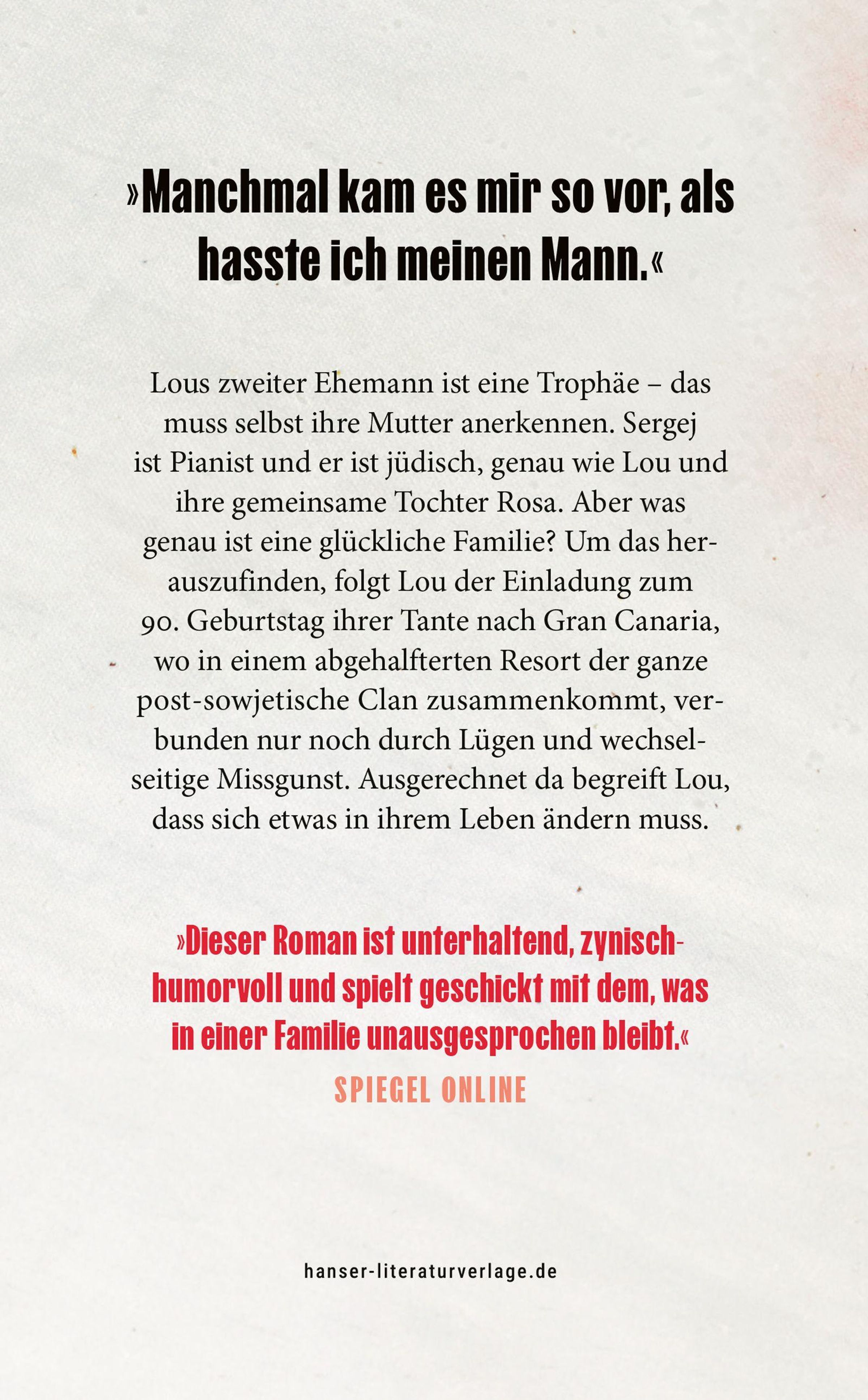 Lous zweiter Ehemann ist eine Trophäe - das muss selbst ihre Mutter anerkennen. Sergej ist Pianist und er ist jüdisch, genau wie Lou. Trotzdem ist ihre Tochter Rosa noch nie in einer Synagoge gewesen - eine ganz normale jüdische Familie in Berlin. Aber sind sie noch eine Familie, und was ist das überhaupt? Um das herauszufinden, folgt Lou der Einladung zum 90. Geburtstag ihrer Tante. In einem abgehalfterten Resort auf Gran Canaria trifft der ganze ex-sowjetische Clan aus Israel zusammen, verbunden nur noch durch wechselseitige Missgunst. Gegen die kleinen Bösartigkeiten und die vage Leere in sich trinkt Lou systematisch an und weiß plötzlich, dass die Antwort auf all ihre Fragen in der glühenden Hitze Tel Avivs zu finden ist. Ein Roman, so aktuell, zynisch und unterhaltsam, wie nur Olga Grjasnowa ihn schreiben kann, über eine Frau, deren Identität sich aus lauter Splittern zusammensetzt, die scheinbar alle nicht zusammenpassen. Bis sie es auf unerwartete Weise doch tun.