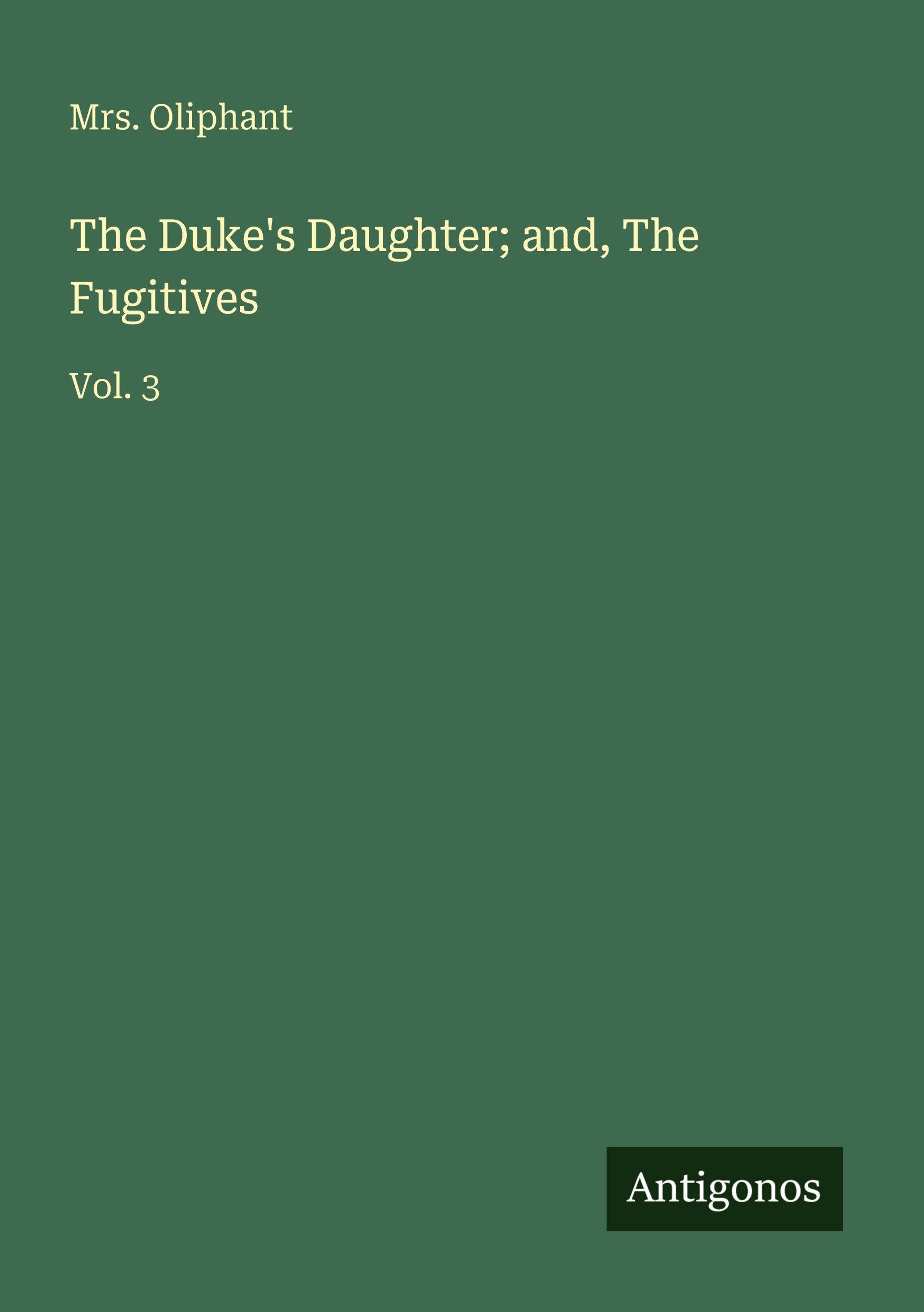 Buchtitel: "The Duke's Daughter; and, The Fugitives Vol. 3" von Mrs. Oliphant. Grüner Hintergrund. Unten "Antigonos"., Buch