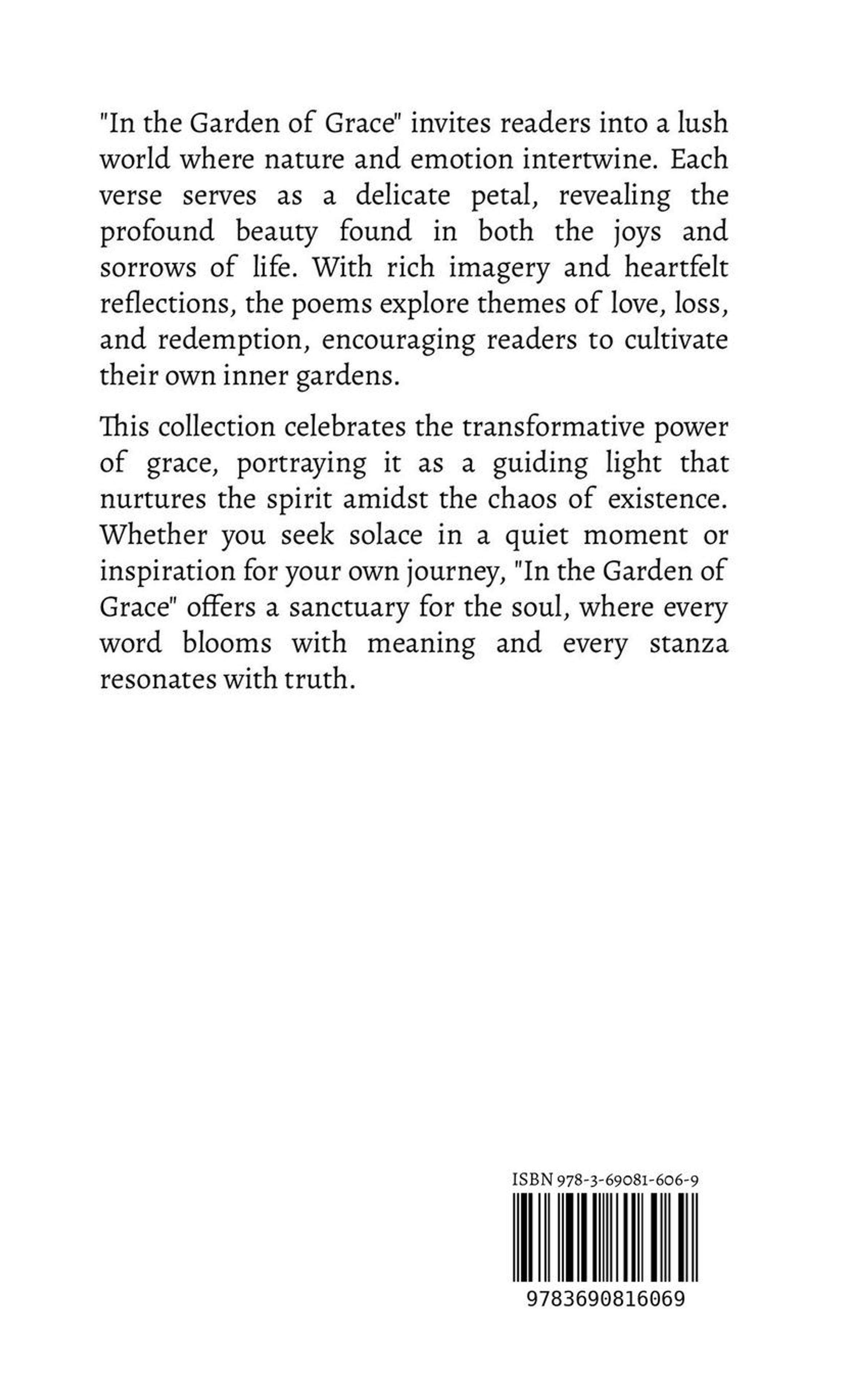 "In the Garden of Grace" invites readers into a lush world where nature and emotion intertwine. Each verse serves as a delicate petal, revealing the profound beauty found in both the joys and sorrows of life. With rich imagery and heartfelt reflections, the poems explore themes of love, loss, and redemption, encouraging readers to cultivate their own inner gardens. This collection celebrates the transformative power of grace, portraying it as a guiding light that nurtures the spirit amidst the chaos of existence. Whether you seek solace in a quiet moment or inspiration for your own journey, "In the Garden of Grace" offers a sanctuary for the soul, where every word blooms with meaning and every stanza resonates with truth.