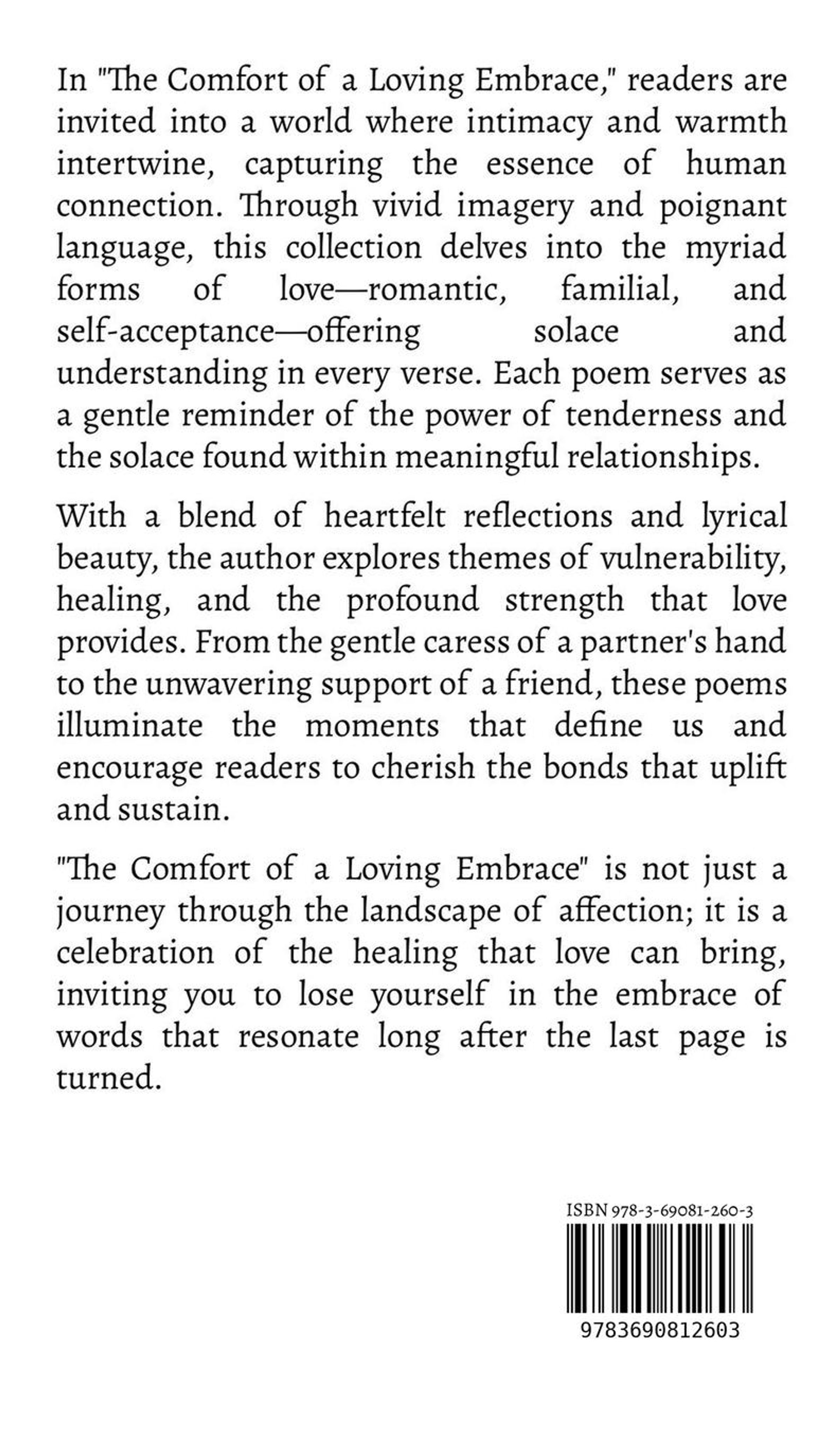 In "The Comfort of a Loving Embrace," readers are invited into a world where intimacy and warmth intertwine, capturing the essence of human connection. Through vivid imagery and poignant language, this collection delves into the myriad forms of love-romantic, familial, and self-acceptance-offering solace and understanding in every verse. Each poem serves as a gentle reminder of the power of tenderness and the solace found within meaningful relationships. With a blend of heartfelt reflections and lyrical beauty, the author explores themes of vulnerability, healing, and the profound strength that love provides. From the gentle caress of a partner's hand to the unwavering support of a friend, these poems illuminate the moments that define us and encourage readers to cherish the bonds that uplift and sustain. "The Comfort of a Loving Embrace" is not just a journey through the landscape of affection; it is a celebration of the healing that love can bring, inviting you to lose yourself in the embrace of words that resonate long after the last page is turned.