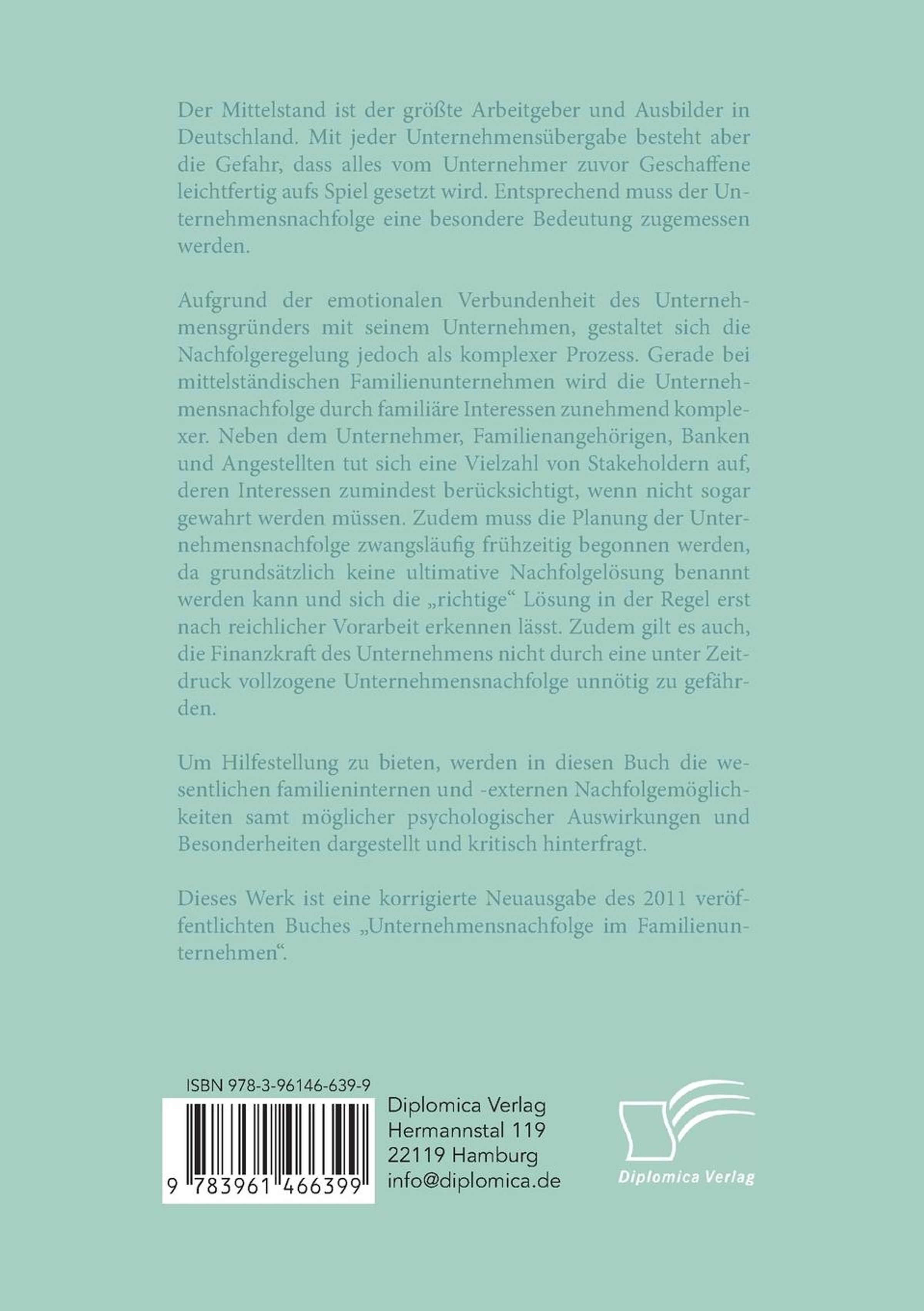 Der Mittelstand ist der größte Arbeitgeber und Ausbilder in Deutschland. Mit jeder Unternehmensübergabe besteht aber die Gefahr, dass alles vom Unternehmer zuvor Geschaffene leichtfertig aufs Spiel gesetzt wird. Entsprechend muss der Unternehmensnachfolge eine besondere Bedeutung zugemessen werden. Aufgrund der emotionalen Verbundenheit des Unternehmensgründers mit seinem Unternehmen, gestaltet sich die Nachfolgeregelung jedoch als komplexer Prozess. Gerade bei mittelständischen Familienunternehmen wird die Unternehmensnachfolge durch familiäre Interessen zunehmend komplexer. Neben dem Unternehmer, Familienangehörigen, Banken und Angestellten tut sich eine Vielzahl von Stakeholdern auf, deren Interessen zumindest berücksichtigt, wenn nicht sogar gewahrt werden müssen. Zudem muss die Planung der Unternehmensnachfolge zwangsläufig frühzeitig begonnen werden, da grundsätzlich keine ultimative Nachfolgelösung benannt werden kann und sich die richtige Lösung in der Regel erst nach reichlicher Vorarbeit erkennen lässt. Zudem gilt es auch, die Finanzkraft des Unternehmens nicht durch eine unter Zeitdruck vollzogene Unternehmensnachfolge unnötig zu gefährden. Um Hilfestellung zu bieten, werden in diesen Buch die wesentlichen familieninternen und -externen Nachfolgemöglichkeiten samt möglicher psychologischer Auswirkungen und Besonderheiten dargestellt und kritisch hinterfragt. Dieses Werk ist eine korrigierte Neuausgabe des 2011 veröffentlichten Buches Unternehmensnachfolge im Familienunternehmen.