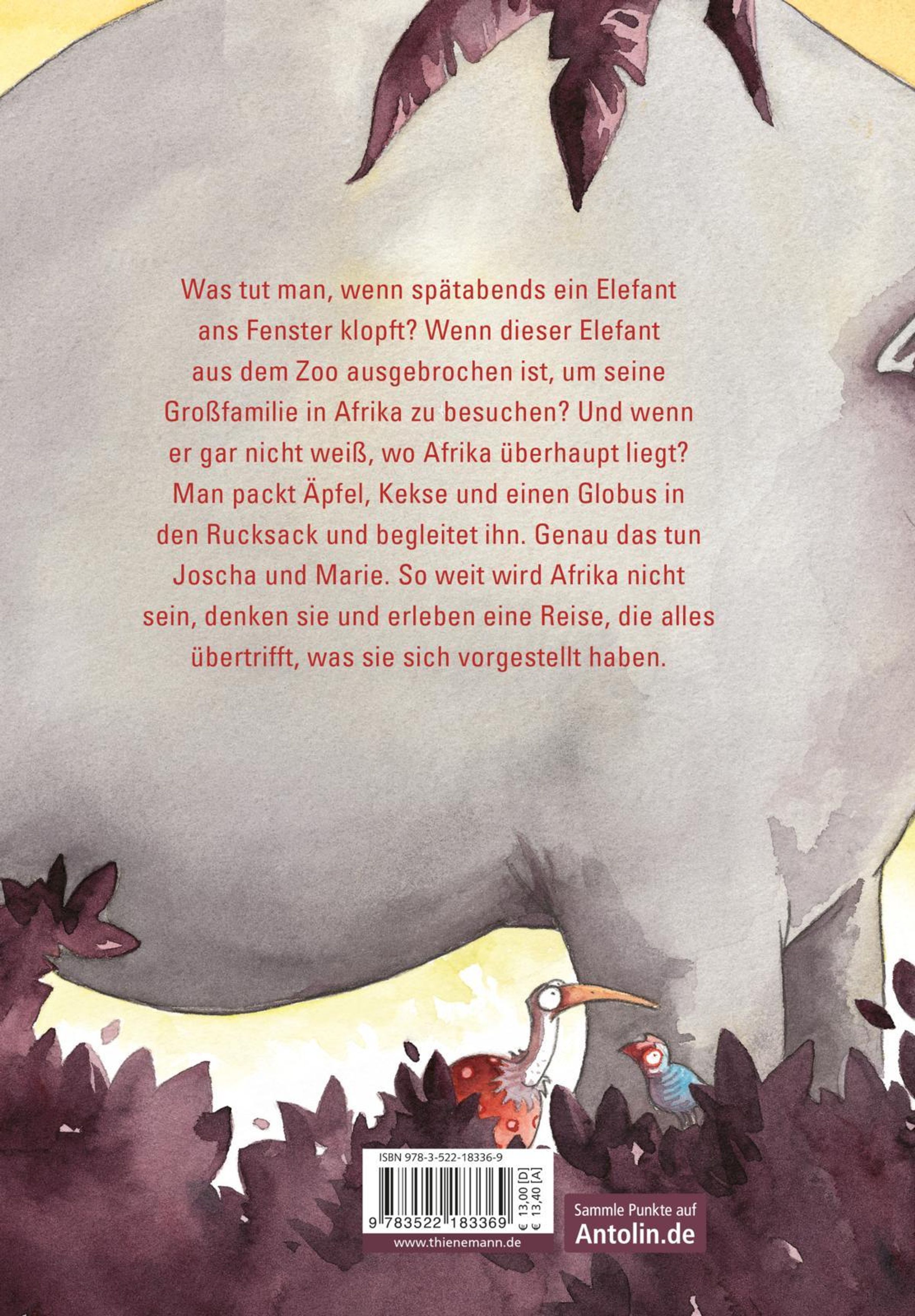 Was tut man, wenn spät abends ein Elefant ans Fenster klopft? Wenn dieser Elefant aus dem Zoo ausgebrochen ist, um seine Großfamilie in Afrika zu besuchen? Und wenn er gar nicht weiß, wo Afrika überhaupt liegt? Man packt Äpfel, Kekse und einen Globus in den Rucksack, hinterlässt einen Zettel für Mama und Papa und und begleitet ihn. Genau das tun Joscha und Marie. Weit wird Afrika nicht sein, denken sie sich und erleben eine Reise, die alles übertrifft, was sie sich vorgestellt haben.