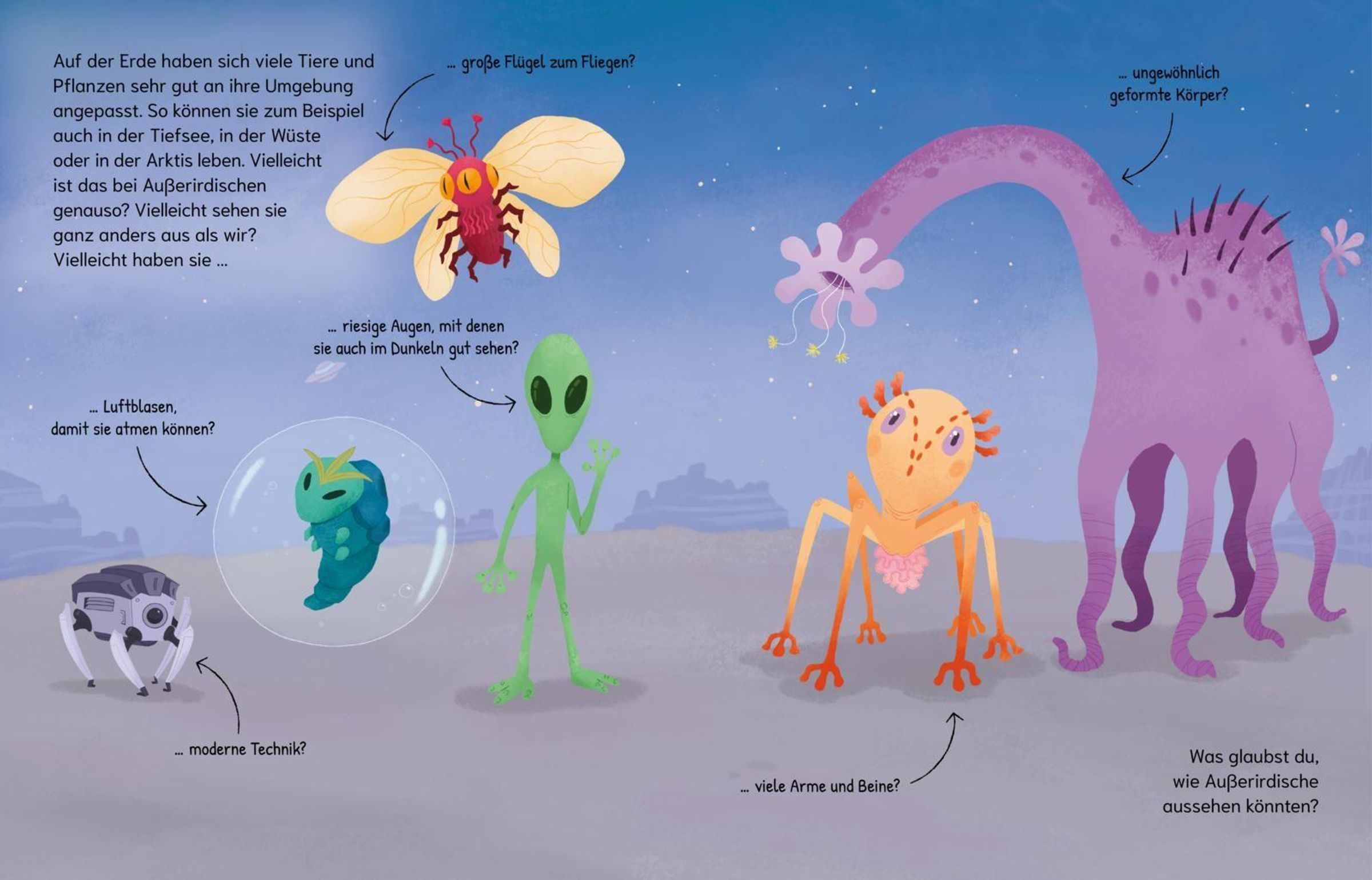 Gut möglich, dass es Lebewesen im Weltall gibt - aber wie wollen Forschungsteams ihnen auf die Spur kommen? Wo suchen sie schon und wohin wollen sie noch? Und wie könnten diese Außerirdischen aussehen: groß wie Dinosaurier oder klein wie Bakterien?