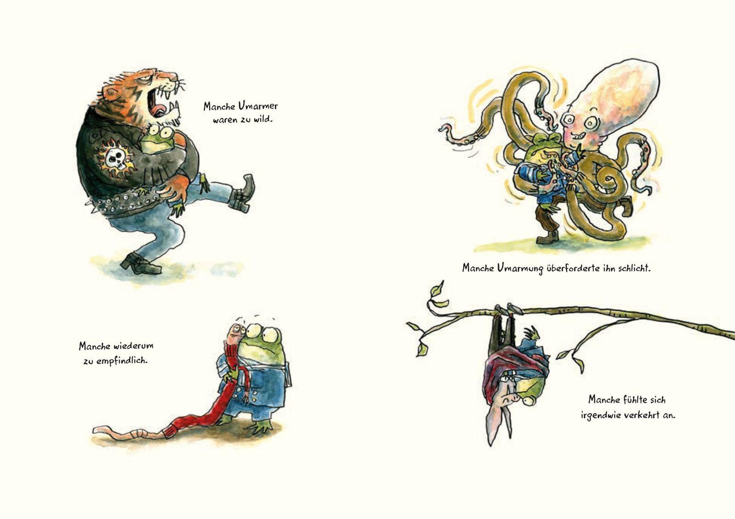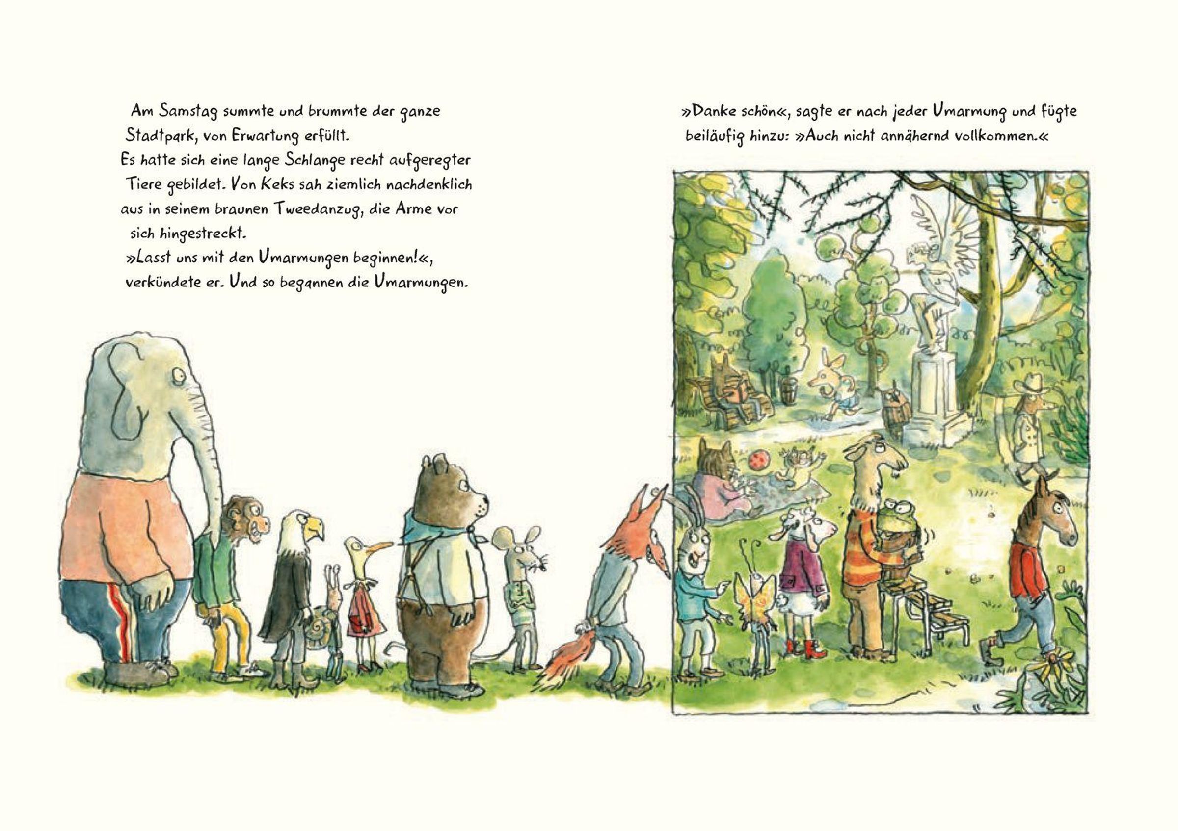 Konrad Kröterich von Keks lebt allein. Er liebt es, sich mit seinem Spiegelbild zu unterhalten und staunt, was für ein amüsanter Gesprächspartner er doch ist. Eines Tages wachter auf und ruft zu sich selbst. 'Ich habe von der schönsten Umarmung geträumt". Sofort macht er sich auf die Suche. Die Giraffe Georgette hat einen zu langen Hals, er rutscht bei der Umarmung mit ihr immer wieder von oben nach unten. Mit dem Goldfisch Geri ist es Konrad zu nass. Er versucht es mit anderen Tieren. Doch manche Umarmung ist zu weich, zu hart, zu eng, zu wild. Und manch einer kann er kaum entkommen. Am Ende des Tages ist Konrad entmutigt. Mit einer Anzeige in der Zeitung ruft er schließlich zu einer spektakulären Umarmungsaktion im Stadtpark auf. Würde er hier die vollkommene Umarmung finden? Konrads Umarmungsversuche mit den verschiedensten Bewerbern sind irgendwie ansteckend. Plötzlich beginnen alle im Park Anwesenden einander zu umarmen. Eltern ihre Kinder, Freunde ihre Freunde, ja sogar Fremde nehmen sich in die Arme. Gerade noch rechtzeitig erkennt Konrad Kröterich, dass die perfekte Umarmung auch etwas mit Loslassen zu tun hat.