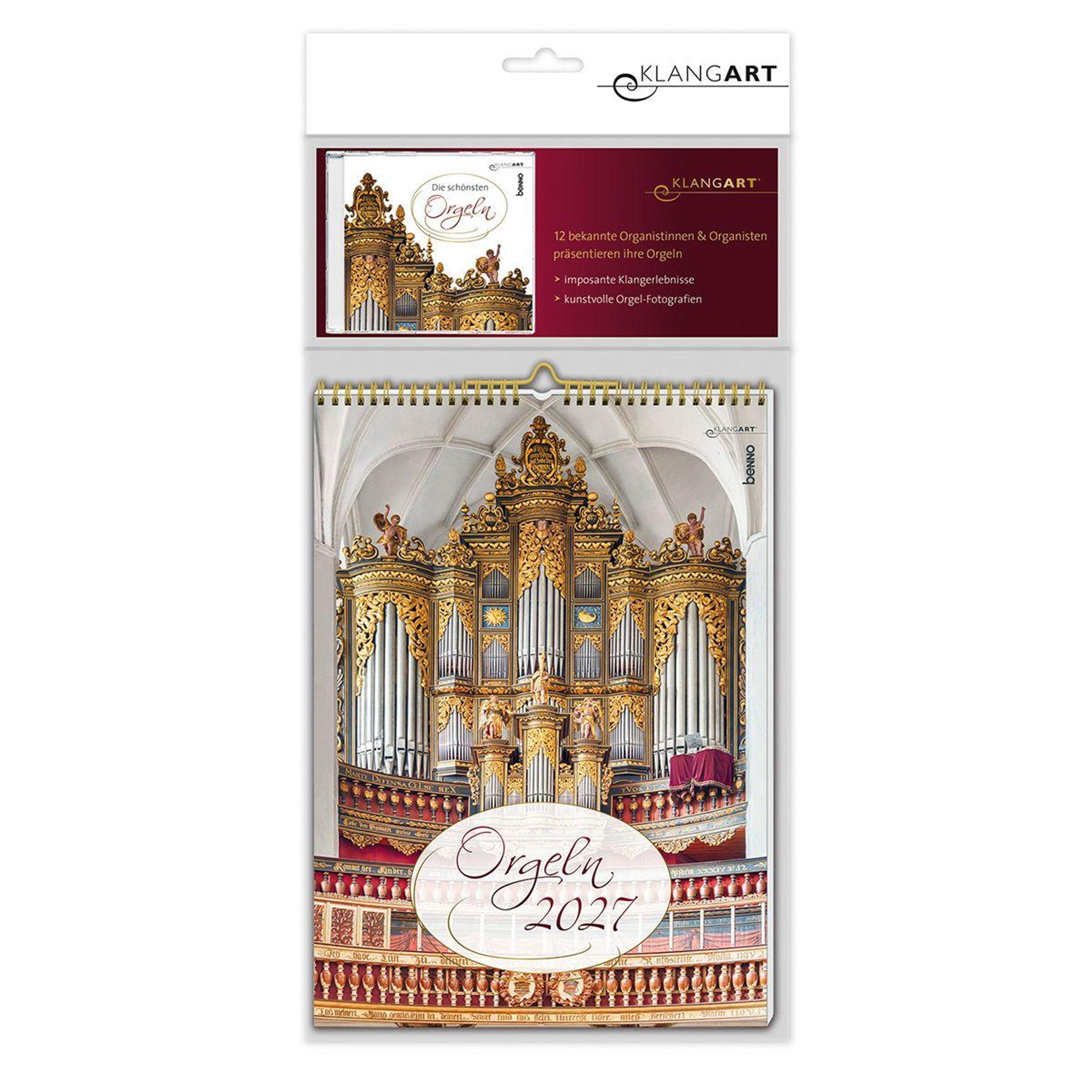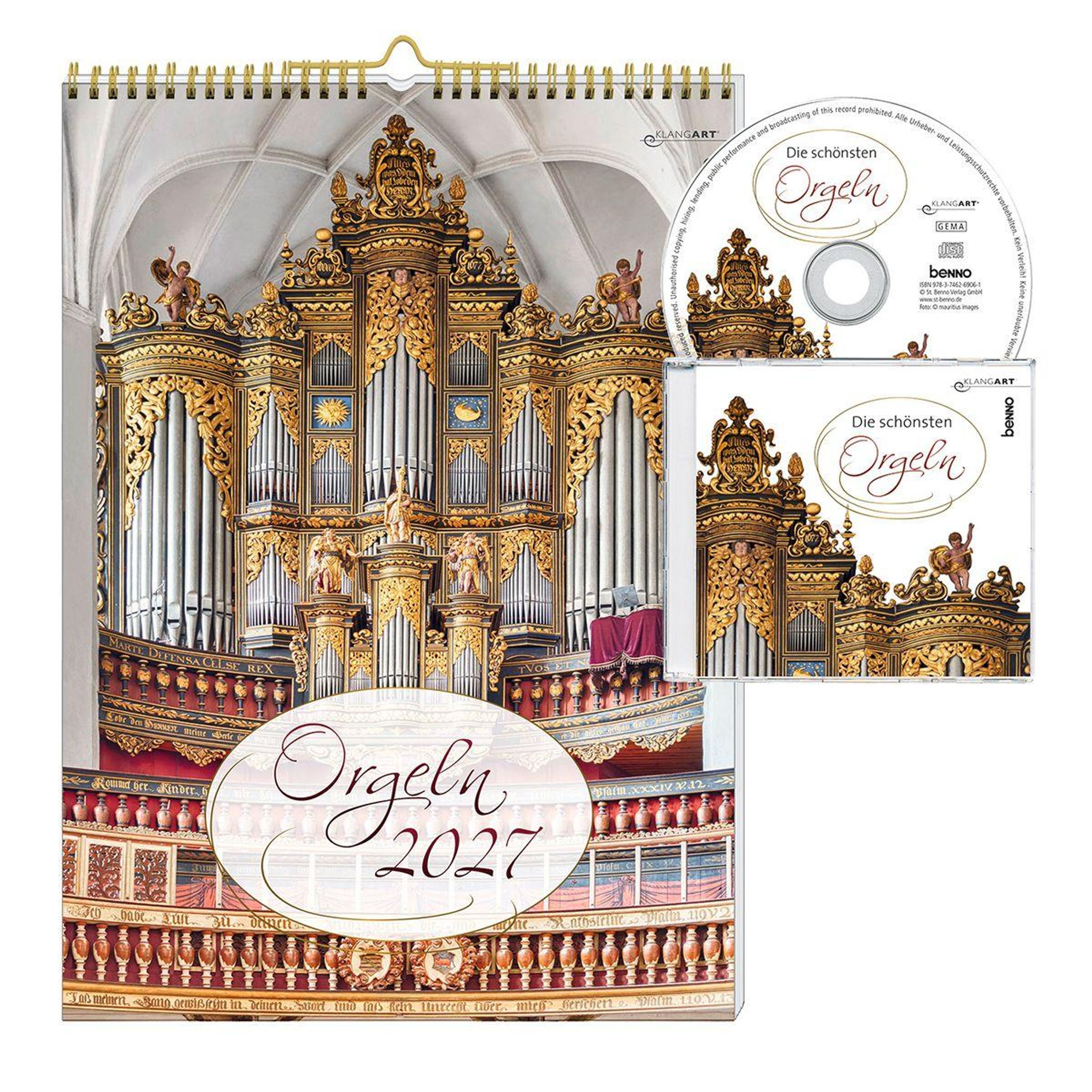 „Die schönsten Orgeln 2027“. Prunkvolle Orgel mit goldenen Verzierungen. Kalender und CD-Hülle im Hintergrund., Kalender