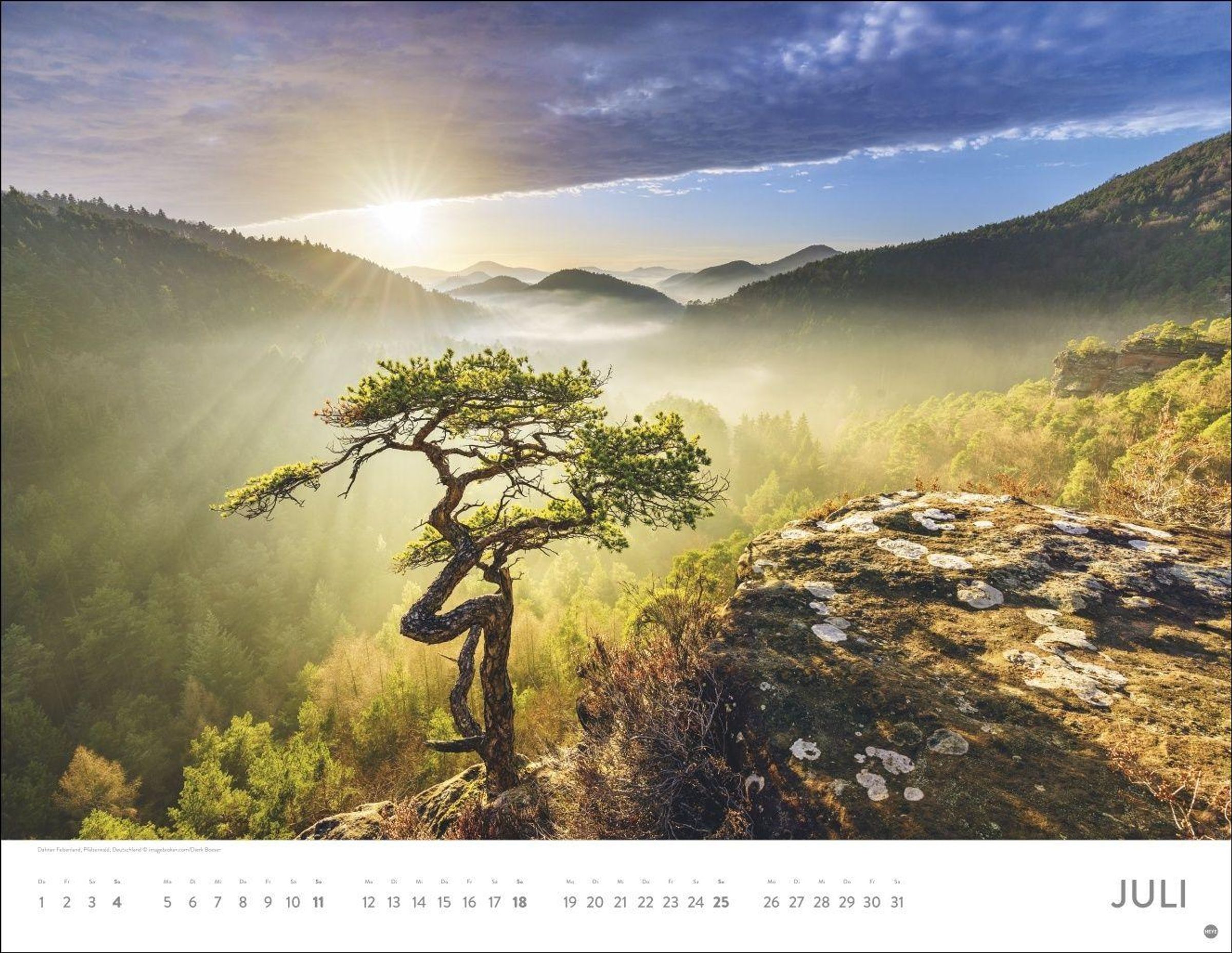 "ORTE DER KRAFT 2027", ein einzelner Baum ragt auf Felsen empor, im Hintergrund Nebel über Wäldern bei Sonnenaufgang., Kalender
