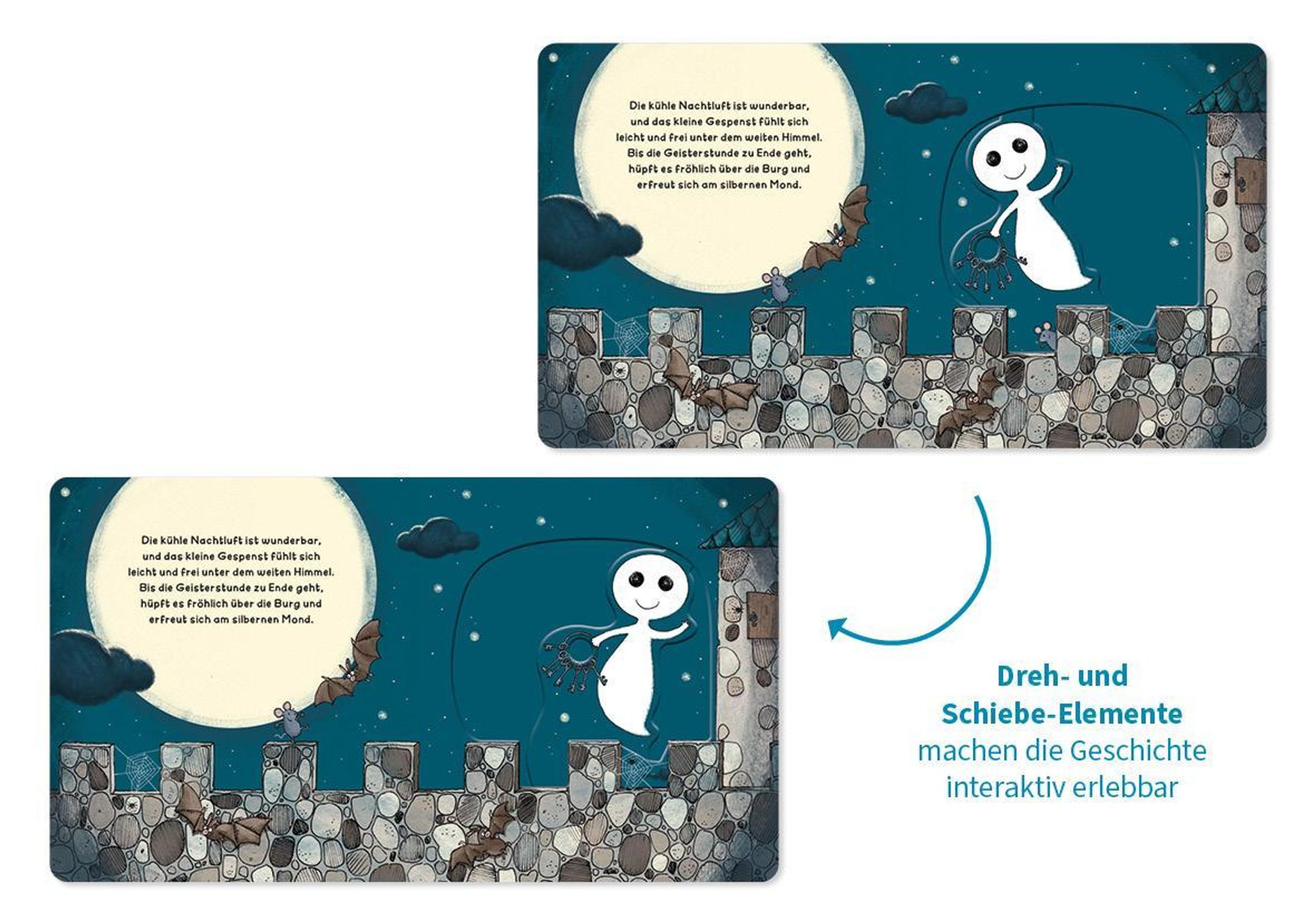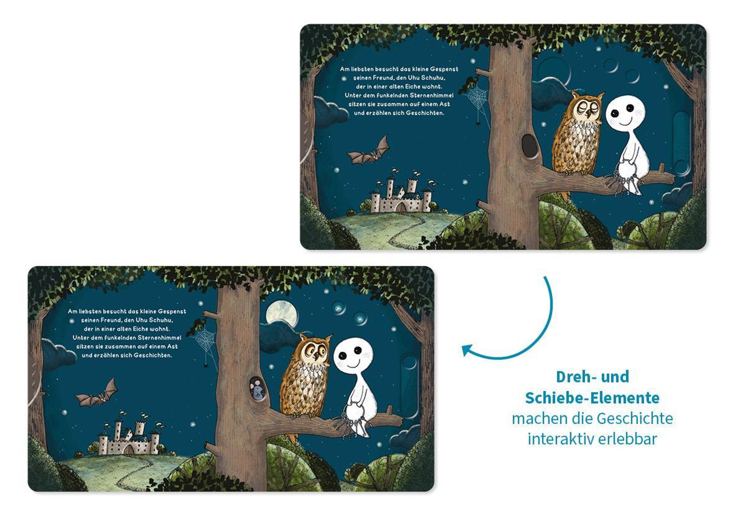 Willkommen in der zauberhaften Welt des kleinen Gespenst! Die interaktiven Schiebeelemente laden Kinder ab 18 Monaten ein, aktiv mitzuspielen und spielerisch ihre Feinmotorik zu trainieren, wenn sich das kleine Gespenst in der Burg versteckt, Fledermäuse tanzen sieht oder den Uhu Schuhu besucht. Liebevolle Illustrationen und kindgerechte Texte fördern den Spracherwerb und sorgen für ein besonderes Vorleseerlebnis. Ein hochwertiges, stabiles Mitmachbuch, das immer wieder aufs Neue begeistert!