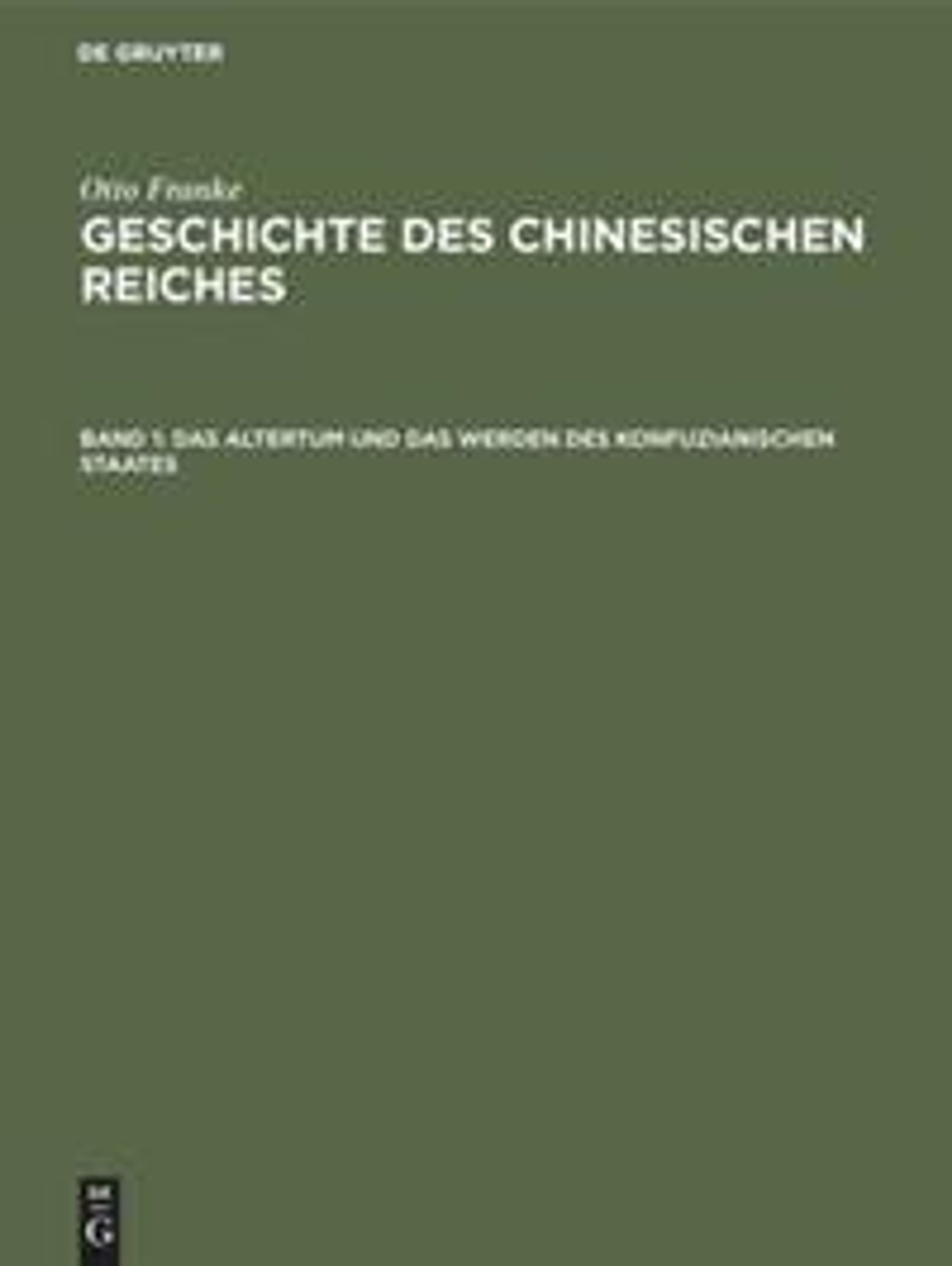 Frontmatter -- Inhaltsverzeichnis des ersten Bandes -- Vorwort -- Erster Teil: Die Grundlagen des Reiches -- Erstes Kapitel. Das Land -- Zweites Kapitel. Das Volk -- Drittes Kapitel. Die Urzeit. Entstehung des Staates. Der Staatsgedanke -- Zweiter Teil. Der universalistische Staat des Altertums -- Erstes Kapitel. Quellen. Chronologie. Gründung der Tschou-Dynastie. Gedanke und Idealform des Universalismus -- Zweites Kapitel. Entwicklung, Verfall und Ende desTschou-Reiehes -- Dritter Teil. Das Werden der neuen Form. Die Bildung des Einheitstaates und ihre Hemmungen -- Erstes Kapitel. Der neue Staat der Tscin und sein Ende -- Zweites Kapitel. Entstehung des Han-Reiches. Das Werden des konfuzianischen Staates -- Drittes Kapitel. Auswärtige Politik. Vorstöße nach allen Richtungen. Hunnenkriege. Neue Welten -- Viertes Kapitel. Der Staat, seine Verfassung und seine Krise -- Fünftes Kapitel. Aufbauende und zerstörende Kräfte. Auflösung des Han-Reiches
