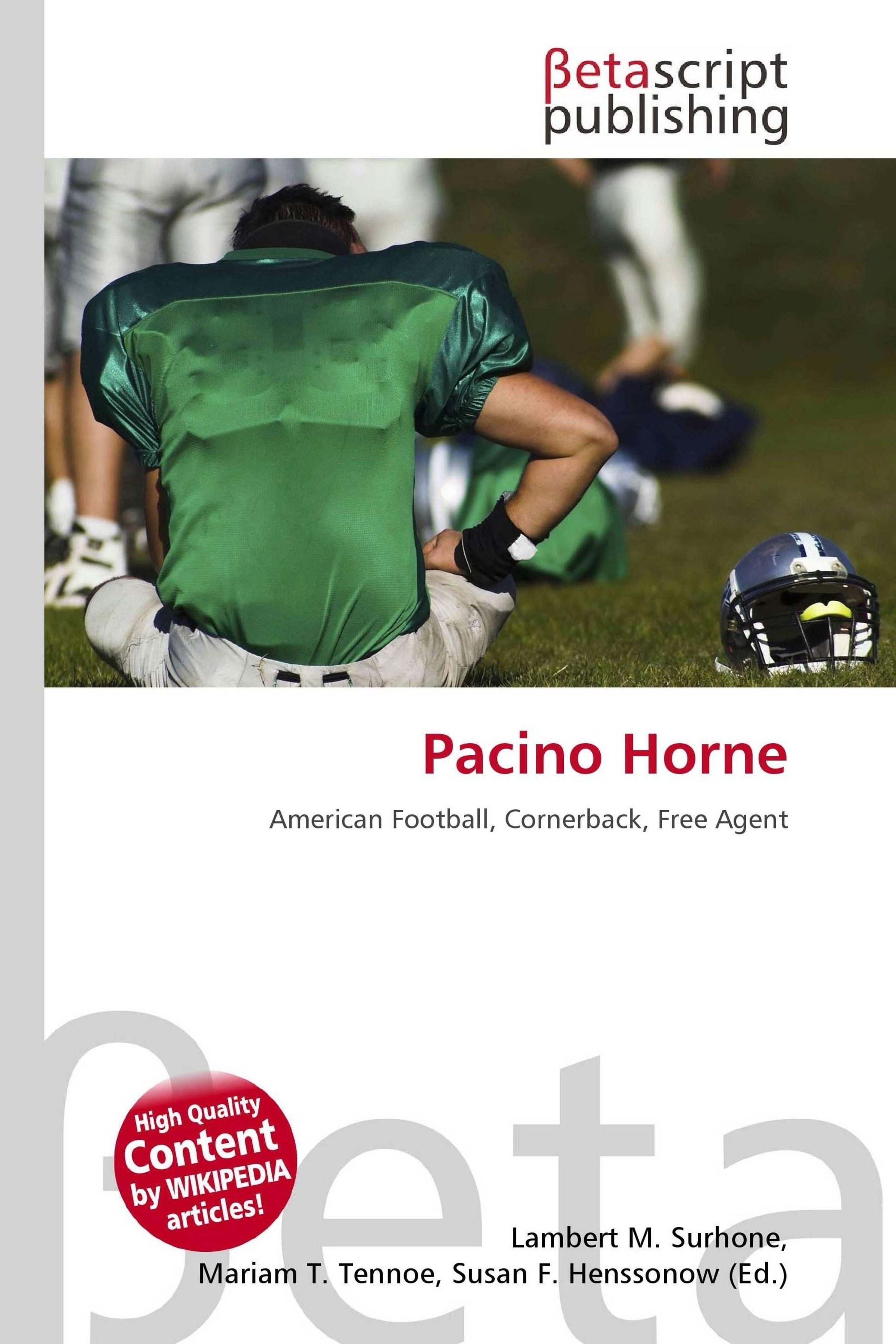 Please note that the content of this book primarily consists of articles available from Wikipedia or other free sources online. Pacino Horne (born November 25, 1983 in Ypsilanti, Michigan) is an American football cornerback who is currently a free agent. He was signed by the Lions as a street free agent in 2008. He played college football at Central Michigan. American football, known in the United States simply as football and often as gridiron outside the United States, is a competitive team sport known for combining strategy with physical play. The objective of the game is to score points by advancing the ball into the opposing team's end zone.