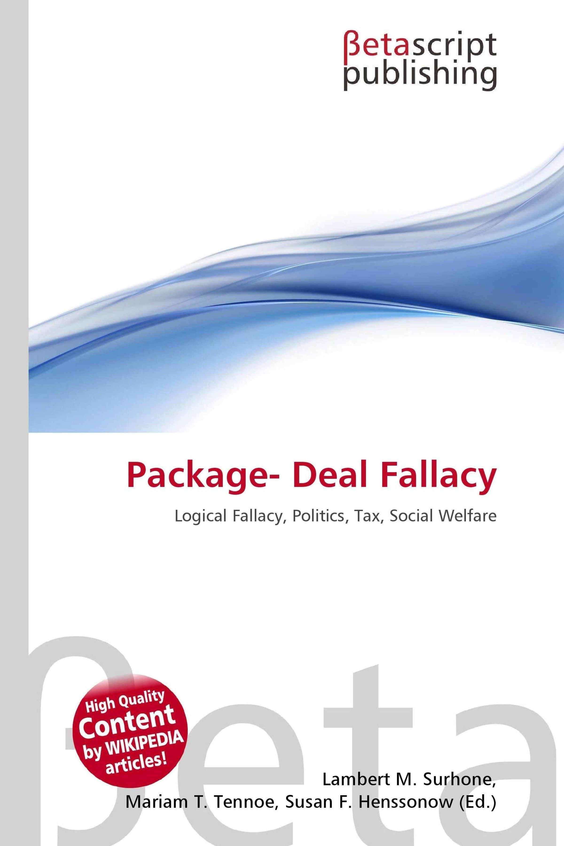 Please note that the content of this book primarily consists of articles available from Wikipedia or other free sources online. The logical fallacy of the package deal consists of assuming that things often grouped together by tradition or culture must always be grouped that way. It is particularly common in political arguments: "My opponent is a conservative who voted against higher taxes and welfare, therefore he will also oppose gun control and abortion." While those four positions are often grouped together as "conservative" in American politics, there is no reason that one cannot believe in one "conservative" idea while not believing in another. The package deal fallacy refers to misuse of the and operator. For misuse of the or operator, see false dilemma.