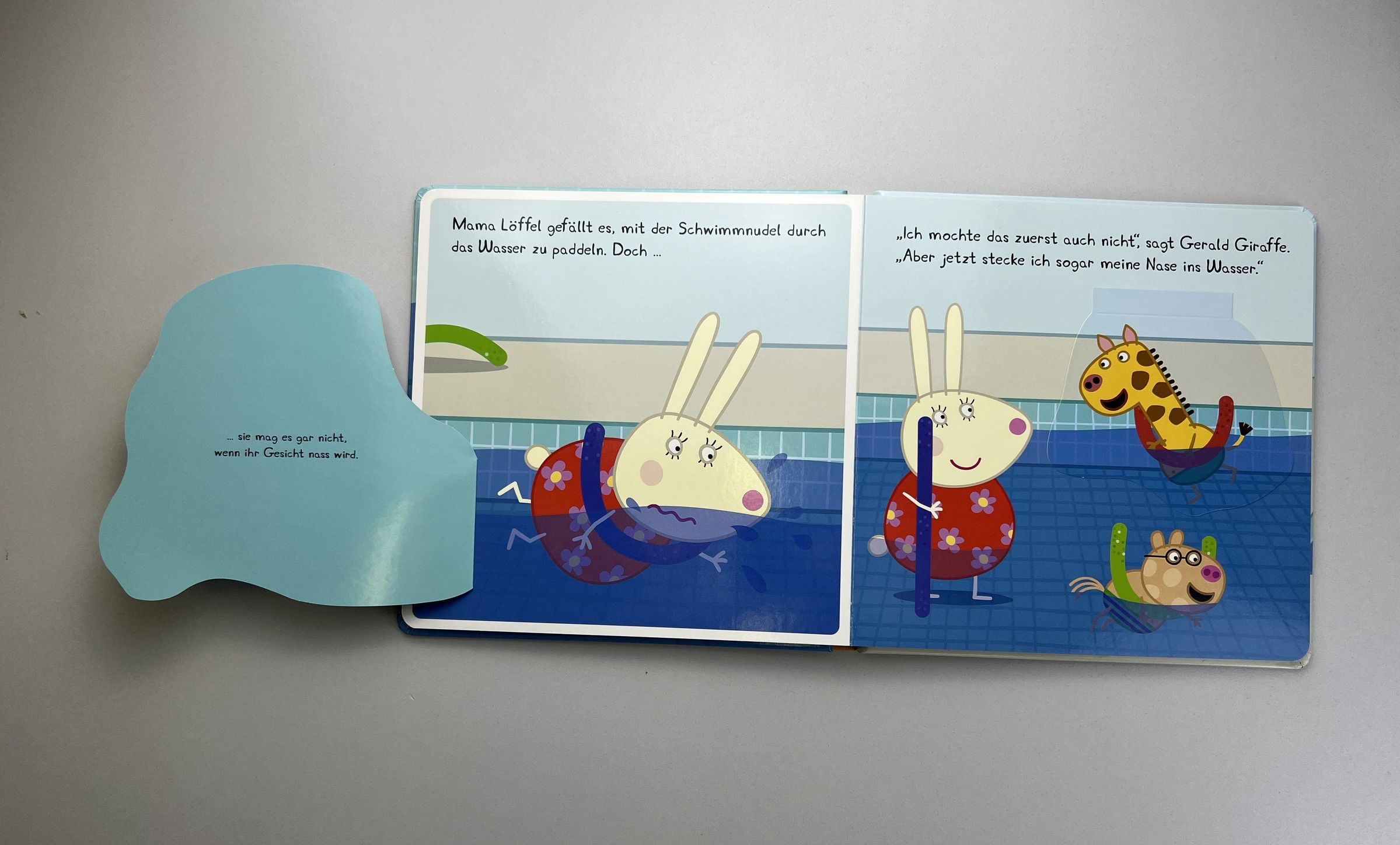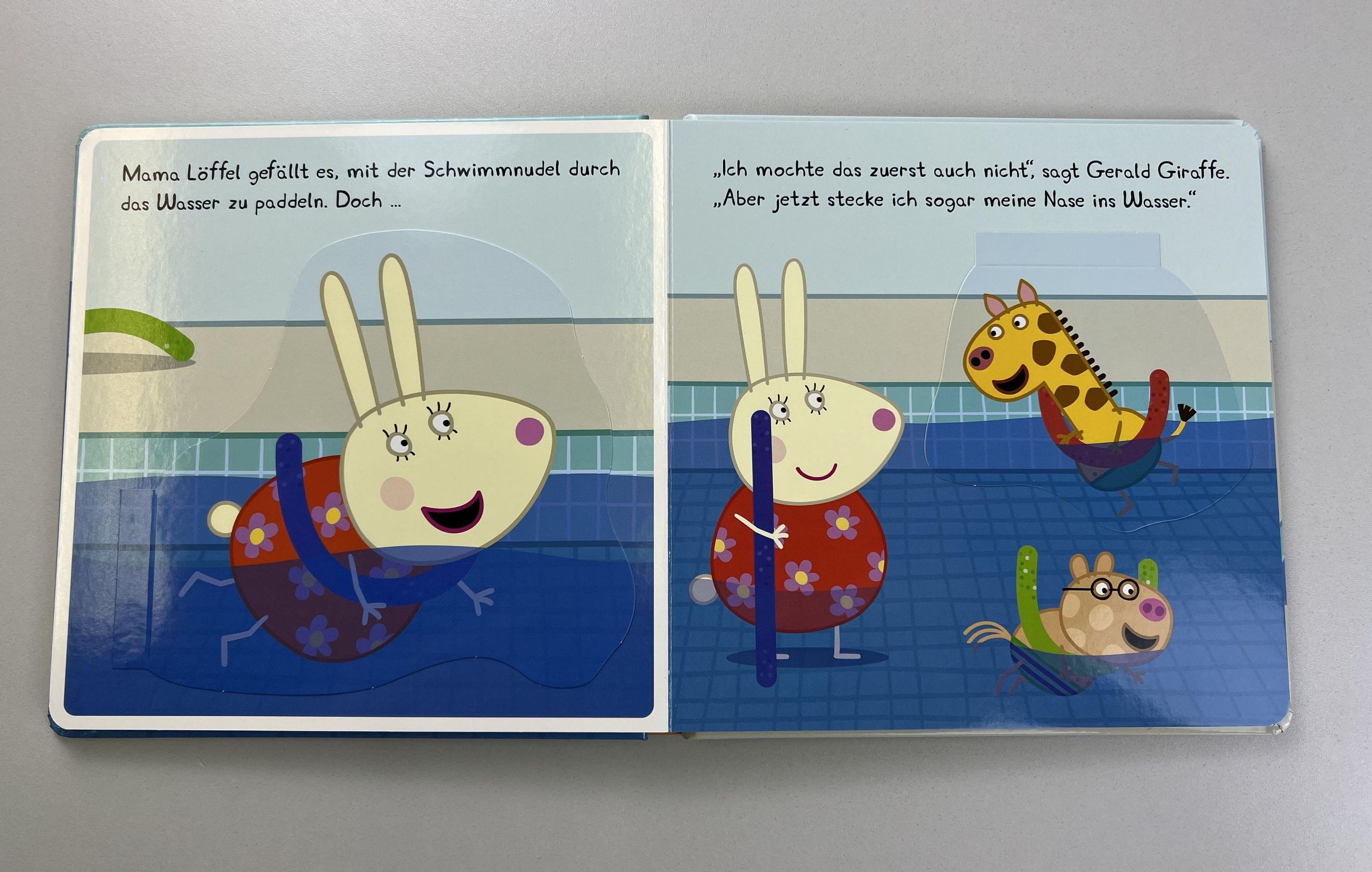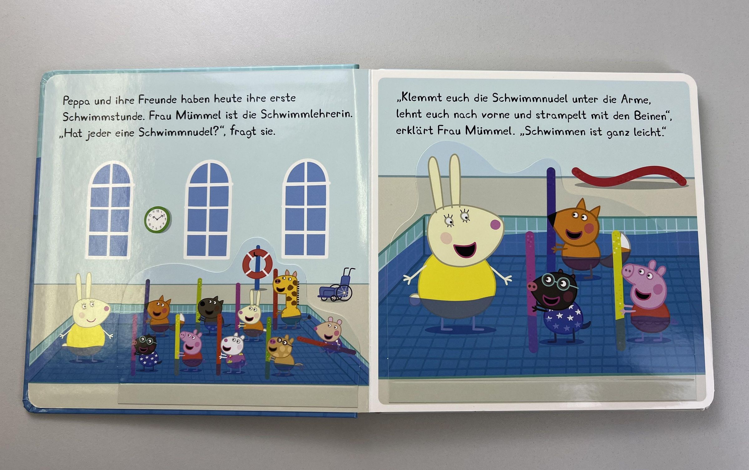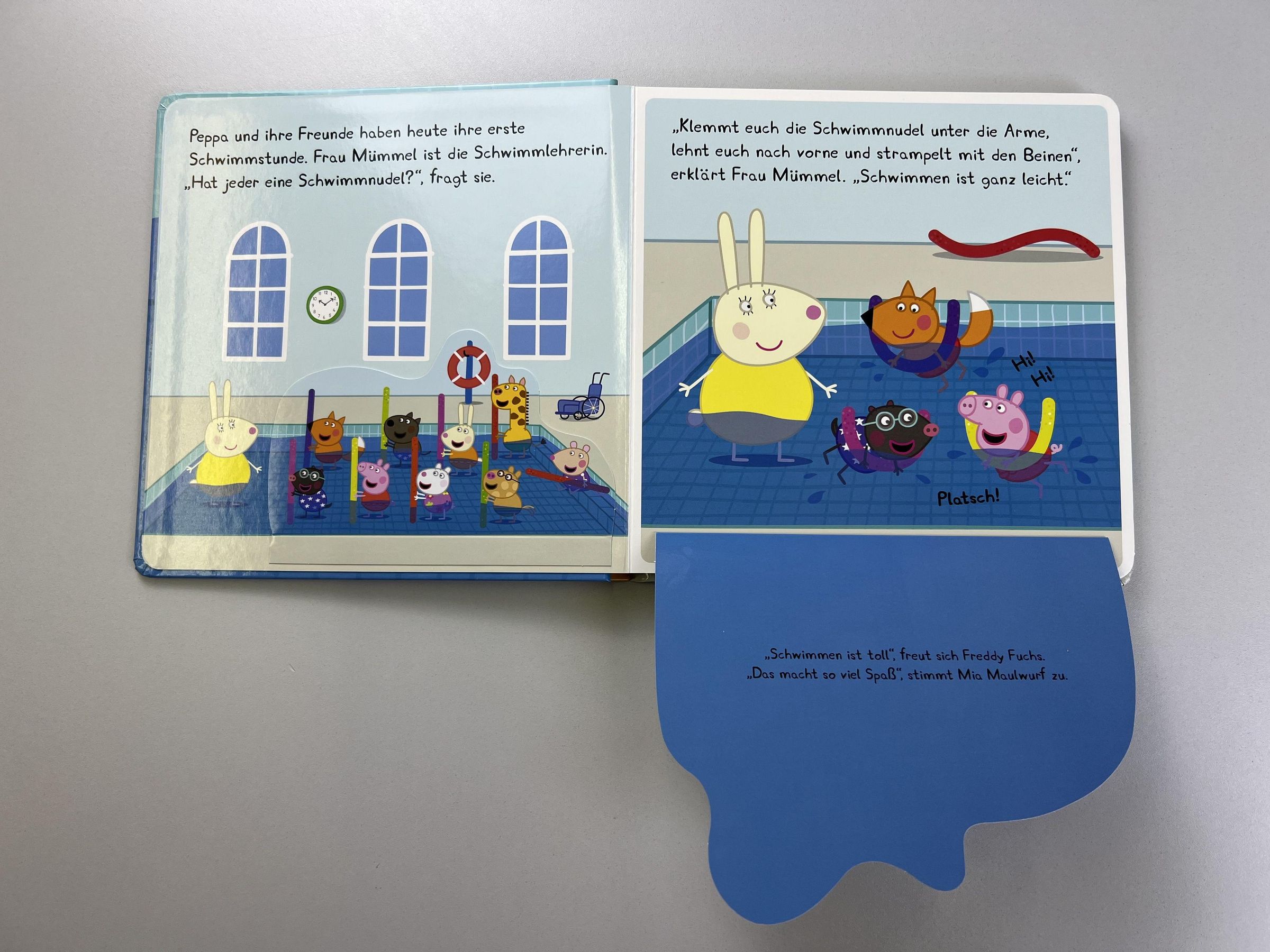 Peppa und ihre Freunde besuchen zum ersten Mal einen Schwimmkurs. Sie blubbern eifrig ins Wasser und haben sehr viel Spaß dabei, mit der Schwimmnudel durchs Becken zu strampeln. Da bekommt auch Mama Löffel Lust, schwimmen zu lernen. Peppa und ihre Freunde zeigen ihr genau, wie es geht. Schau hinter die Klappen und begleite sie bei diesem lustigen Wasser-Abenteuer!
