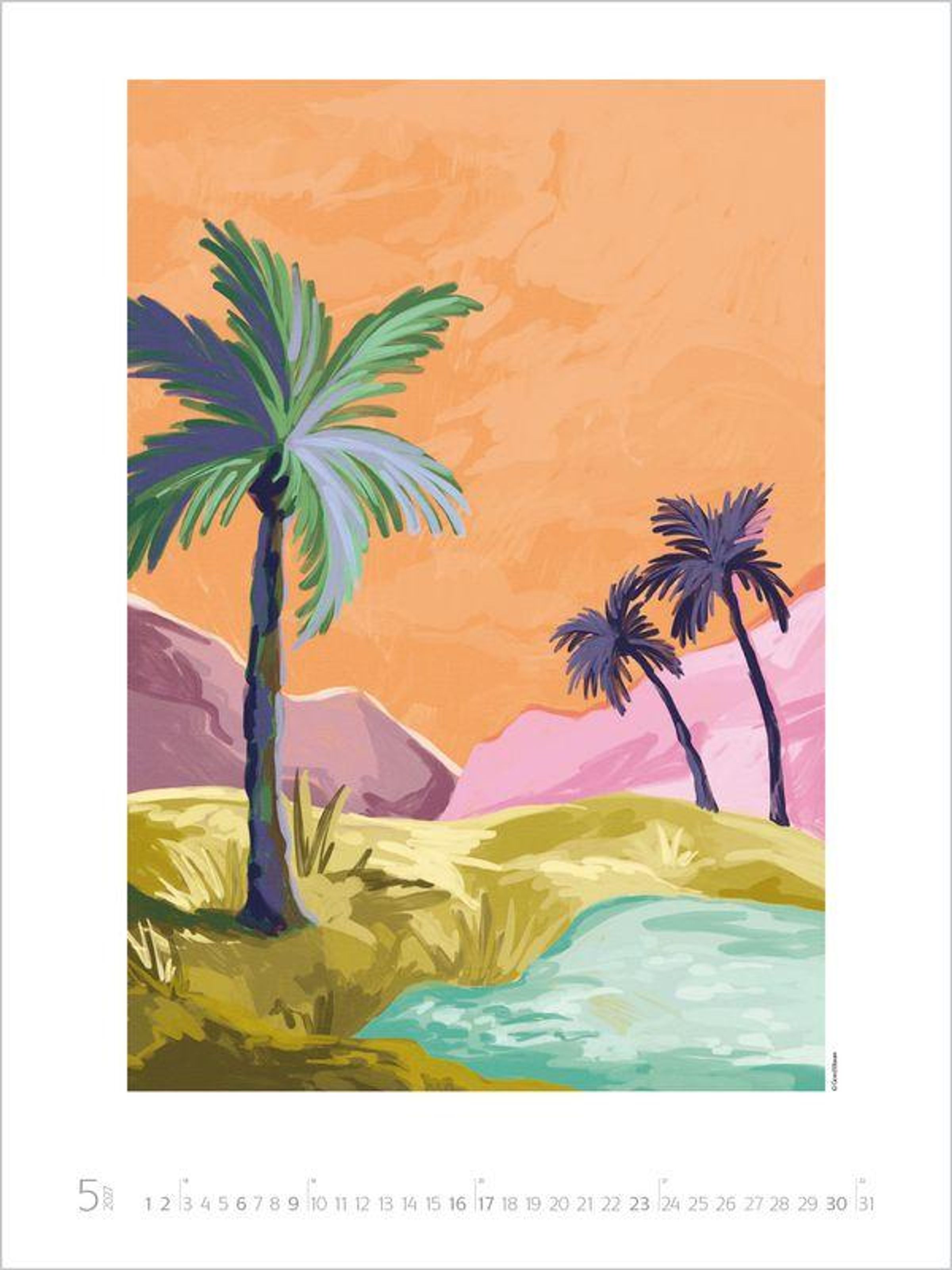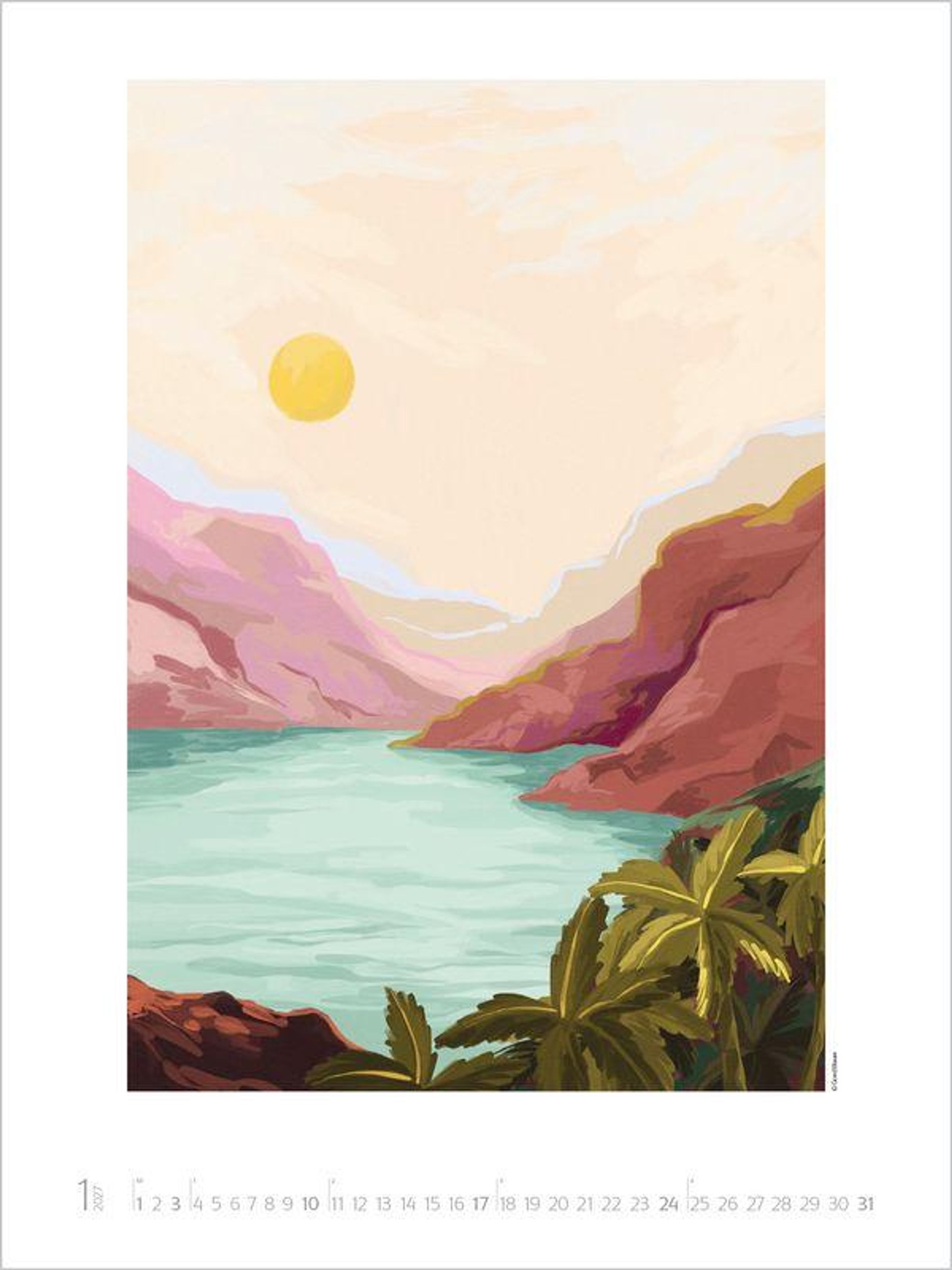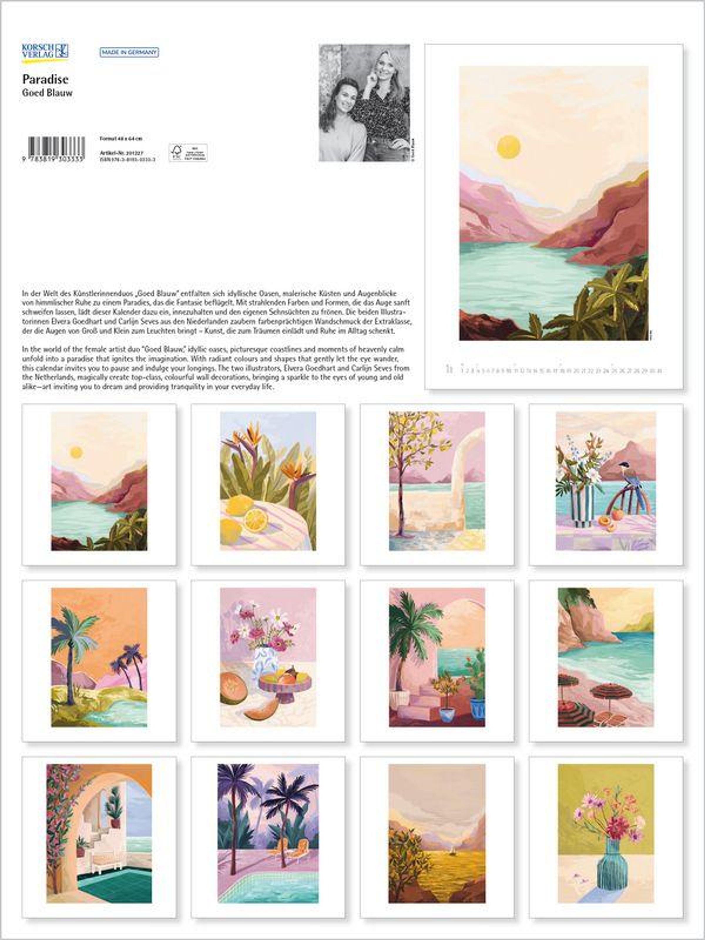 In der Welt des Künstlerinnenduos Goed Blauw entfalten sich idyllische Oasen, malerische Küsten und Augenblicke von himmlischer Ruhe zu einem Paradies, das die Fantasie beflügelt. Mit strahlenden Farben und Formen, die das Auge sanft schweifen lassen, lädt dieser Kalender dazu ein, innezuhalten und den eigenen Sehnsüchten zu frönen. Die beiden Illustratorinnen aus den Niederlanden zaubern farbenprächtigen Wandschmuck der Extraklasse, der die Augen von Groß und Klein zum Leuchten bringt - Kunst, die zum Träumen einlädt und Ruhe im Alltag schenkt.