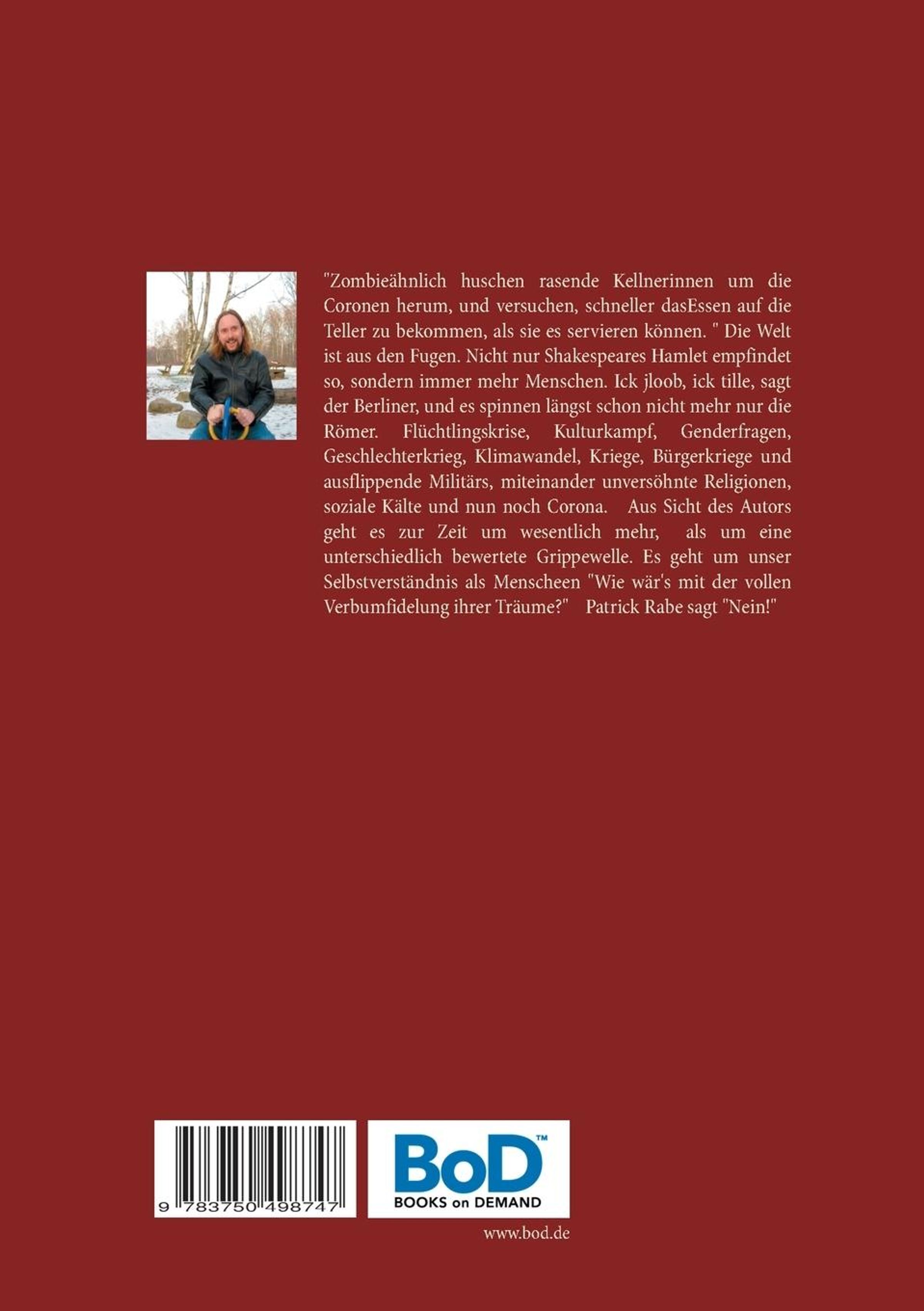 Die Welt ist aus den Fugen. Nicht nur Shakespeares Hamlet empfindet so, sondern immer mehr Menschen. Ick jloob, ick tille, sagt der Berliner, und es spinnen längst schon nicht mehr nur die Römer. Flüchtlingskrise, Kulturkampf, Genderfragen, Geschlechterkrieg, Klimawandel, Kriege, Bürgerkriege und ausflippende Militärs, Religionen, die sich unversöhnlich gegenüberstehen, unbefriedigende Arbeitssituationen und Arbeitslosigkeit, soziale Kälte, staatliche Überwachung und ein zunehmend neuralgisches Verhältnis unzähliger Menschen zu Themen wie Fake News, Weltdeutung und Deutungshoheit in Wahrheitsfragen und nun noch Corona. Die Welt um uns herum bekommt zunehmend surrealistische Züge, und kaum noch einer findet sich zurecht. Der vorliegende Gedichtband von Patrick Rabe trägt dem Rechnung. Er ist ein Versuch, eine Sprache und eine Ausdrückbarkeit für das zu finden, was uns umgibt. Ein Versuch, unsere kulturellen Werte von Poesie, Philosophie und Musik wieder in unsere bewusste Gegenwart zu rücken und zu zeigen: Das ist das Fundament Europas, das Fundament menschlichen Zusammenlebens, nicht Kapitalismus, Hedonismus und Geld. Aus Sicht des Autors geht es zur Zeit um wesentlich mehr, als um eine unterschiedlich bewertete und eingeschätzte Grippewelle. Als Deutsche, Europäer, Weltbürger, Menschen. ringen wir momentan um eine neue, tragfähige Standortbestimmung. Das vorliegende Werk stellt sich dem mutig, radikal, poetisch, schockierend und provokativ.