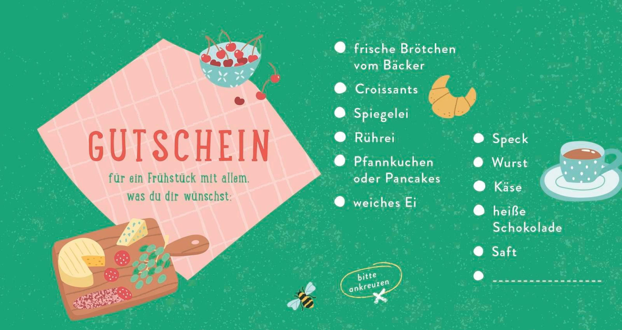 Von Eis essen nach der Schule über Kino oder Zoo-Besuch am Wochenende bis zu Hilfe beim Zimmeraufräumen: Mit dem kleinen Gutschein-Buch verschenken Sie 12 wunderbare Glücksmomente für Grundschulkinder. Alle Gutscheine sind ohne großen Aufwand oder Kosten umsetzbar und werden den kleinen ABC-Schützen noch lange in schöner Erinnerung bleiben.