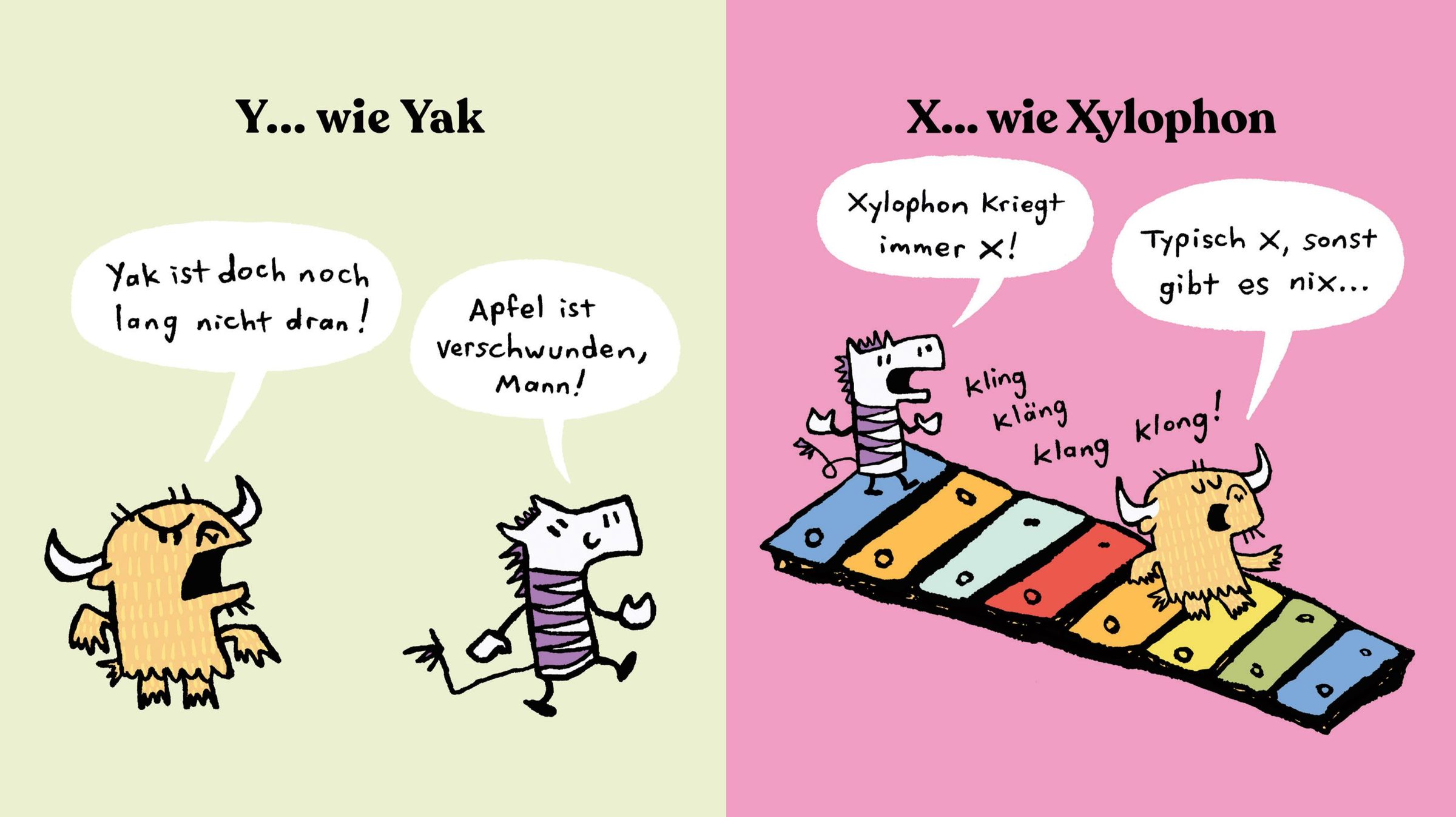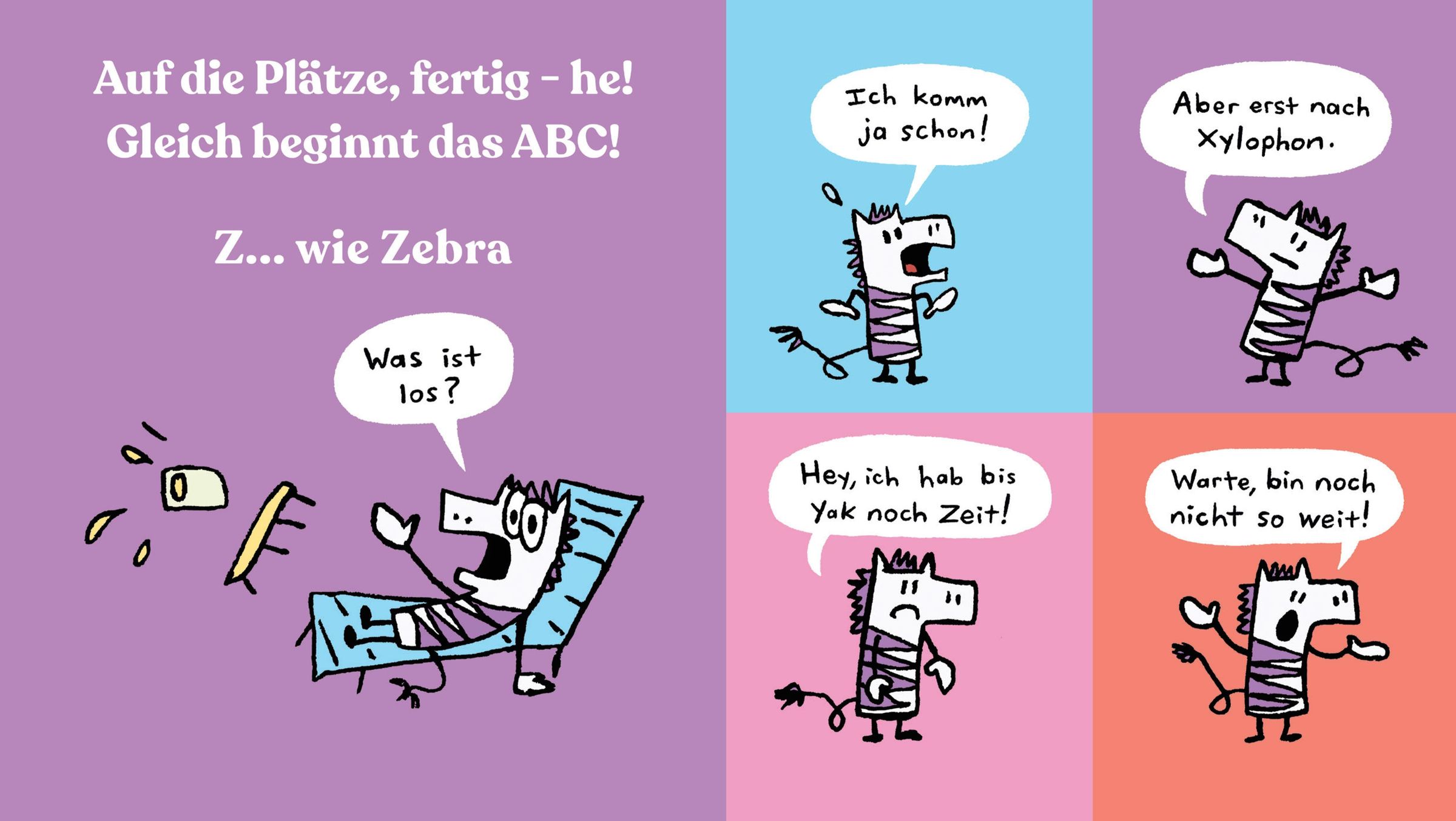 Von Z bis A - das lustigste ABC aller Zeiten Was ist denn hier los?! Zebra und Yak trauen ihren Augen kaum: Das ABC beginnt plötzlich bei Z statt bei A - und Apfel, der doch eigentlich den Anfang machen müsste, ist einfach verschwunden! Ihnen bleibt nichts anderes übrig, als sich - holderdipolter - von hinten ins Alphabet zu stürzen! Auf ihrer abenteuerlichen Reise begegnen ihnen fliegende Popel, wilde Mumien und lustige Dackel. Ob sie Apfel noch rechtzeitig finden, bevor das Buch zu Ende ist? Dieses rasant gereimte Bilderbuch voller schräger Charaktere und lustiger Illustrationen macht riesengroße Lust aufs Buchstabenlernen.