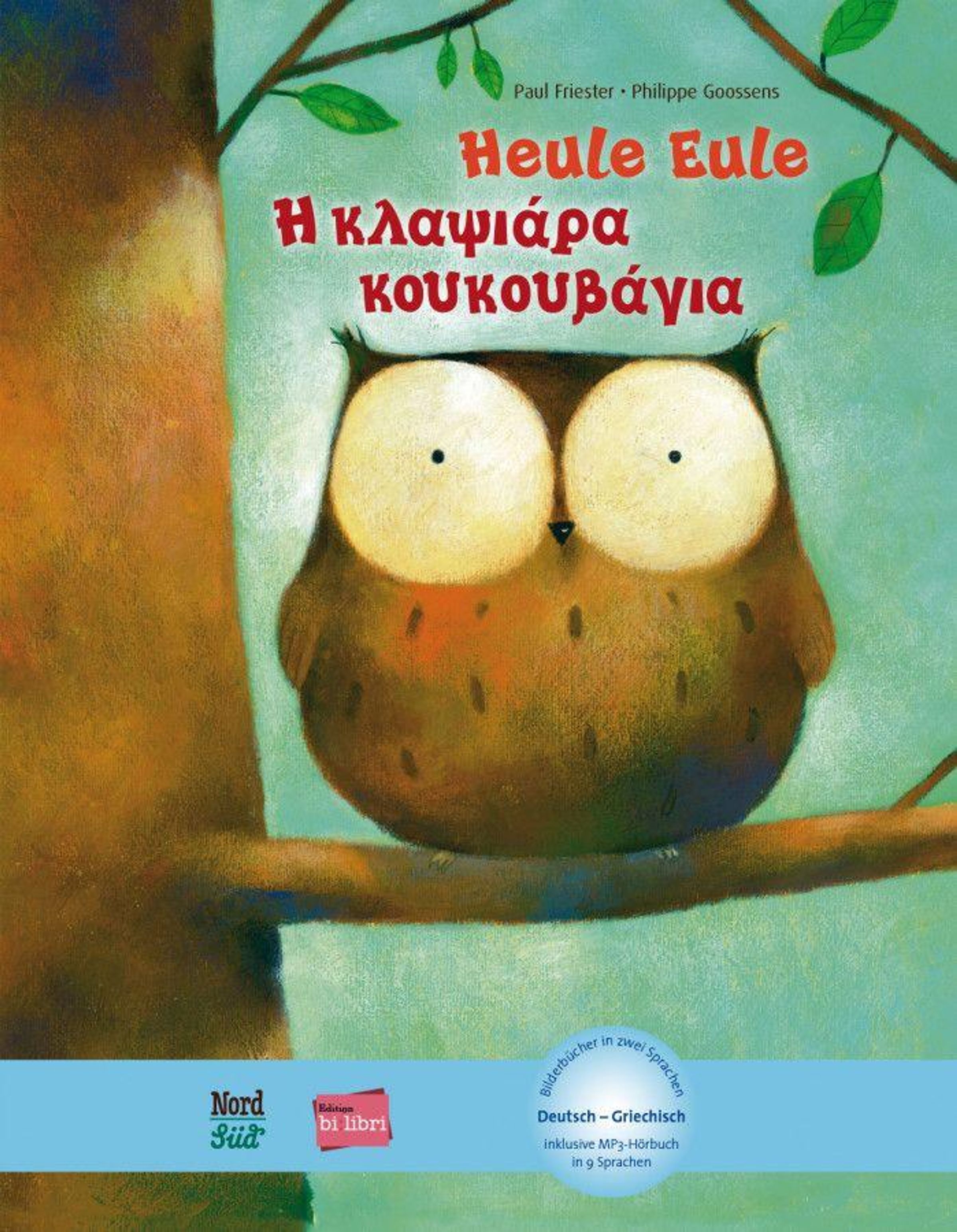 Text: "Heule Eule" und griechischer Text darunter; Illustration einer Eule auf einem Ast, bunte Blätter im Hintergrund., Buch