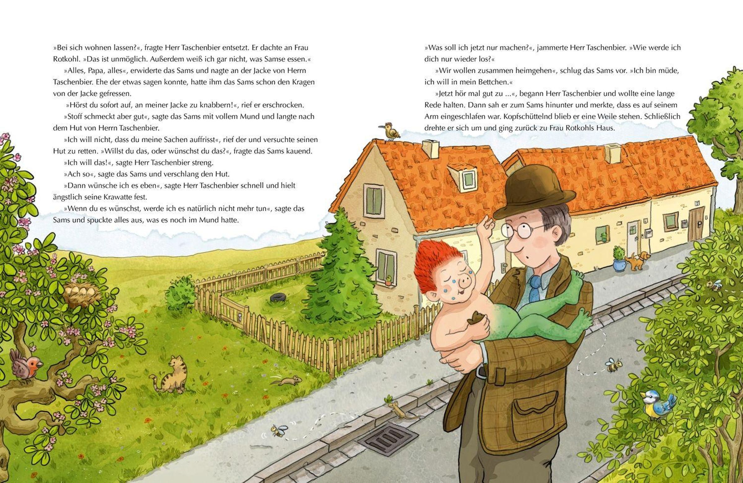 Herr Taschenbier erlebt eine seltsame Woche: Am Sonntag scheint die Sonne, am Montag kommt Herr Mon, am Dienstag hat er Dienst, Mittwoch ist Mitte der Woche, am Donnerstag donnerts, und am Freitag hat er frei ... Was passiert dann wohl am Samstag? Na klar, am Samstag kommt das Sams. Dieses ungewöhnliche, vorlaute Wesen mit Rüssel und merkwürdigen Punkten sagt "Papa" zu Herrn Taschenbier und will bei ihm bleiben - und Herr Taschenbier ist davon erst mal alles andere als begeistert. Doch schnell wird klar: Das Sams bringt Chaos, aber auch jede Menge Spaß ...