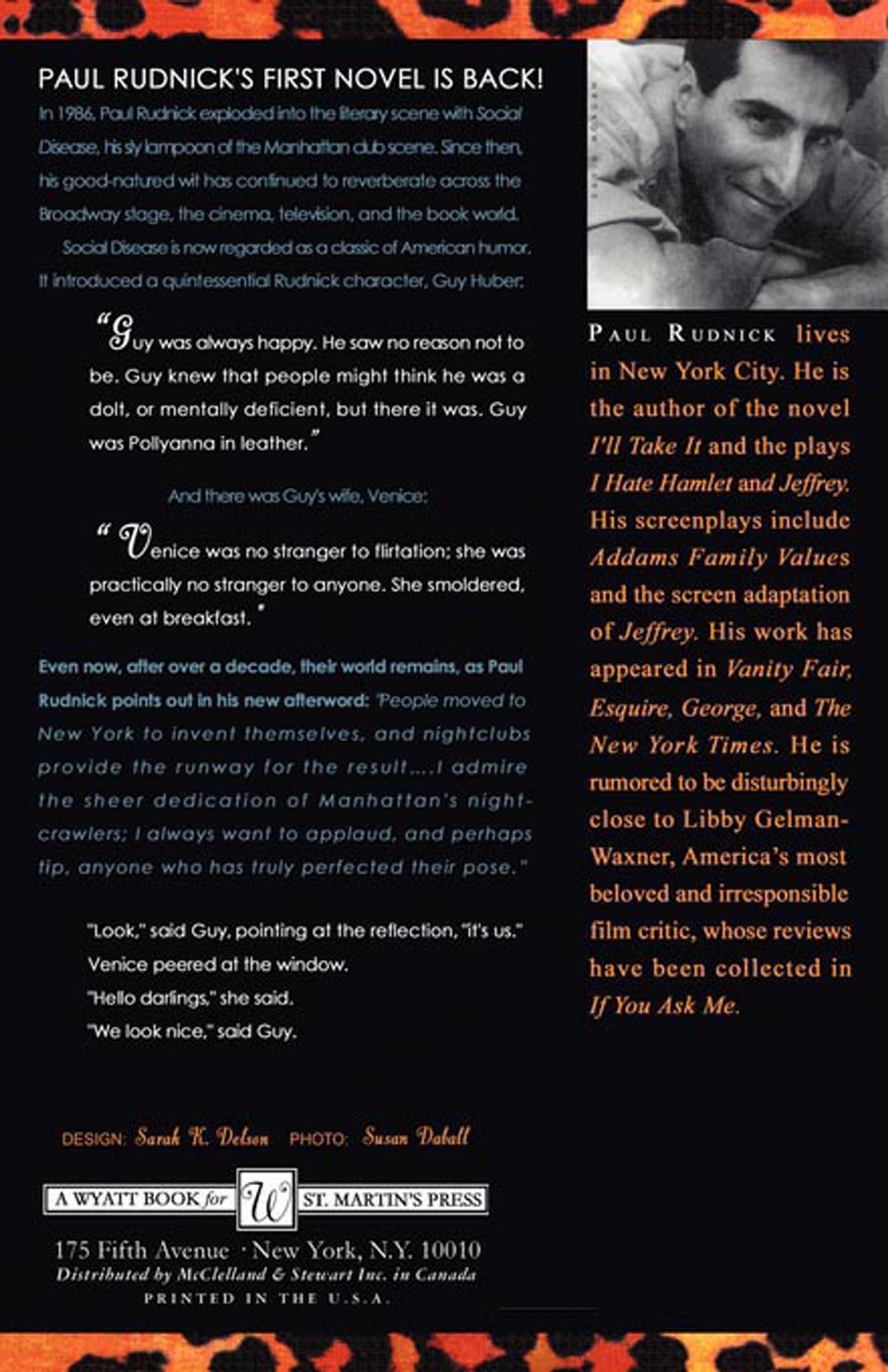 In this comic novel by one of America's funniest writers, "the travails of (the) protagonist, a trust-funded trendoid named Guy, his ditzy clubland bride Venice, and their transvestite housekeeper, Licky Barnes, are very perky indeed. . . . "Social Disease" . . . is really about the three major issues of our time: sex, hair, and the telephone" (Paul Rudnick, "New York Magazine").