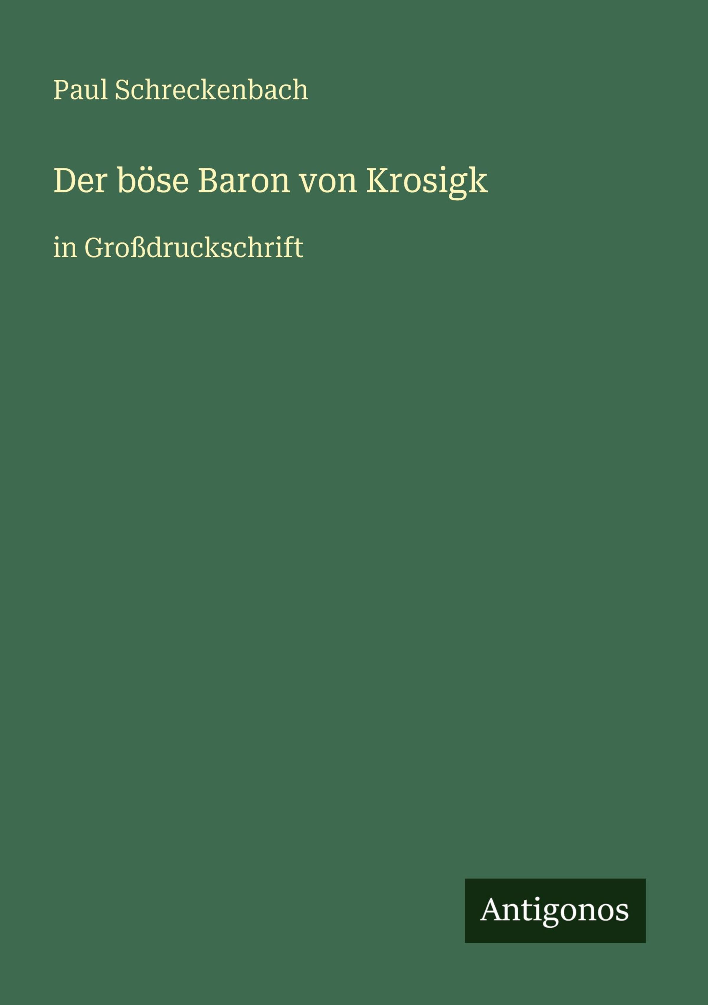Buchtitel "Der böse Baron von Krosigk" von Paul Schreckenbach, in Großdruckschrift, unten rechts "Antigonos"., Buch