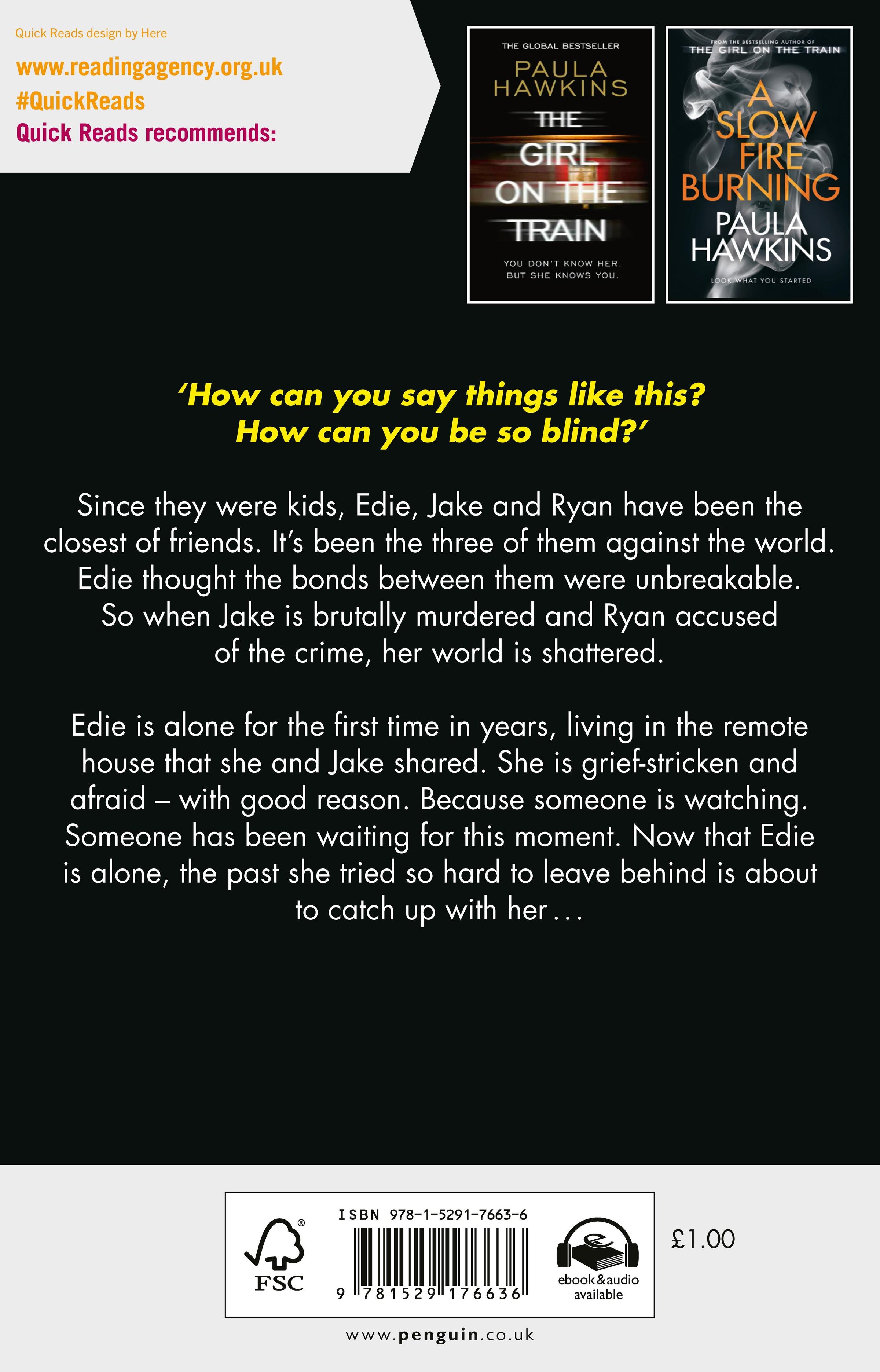 So when Jake is brutally murdered and Ryan accused of the crime, her world is shattered. Edie is alone for the first time in years, living in the remote house that she and Jake shared. ***Praise for Paula Hawkins:'Twists and turns galore .