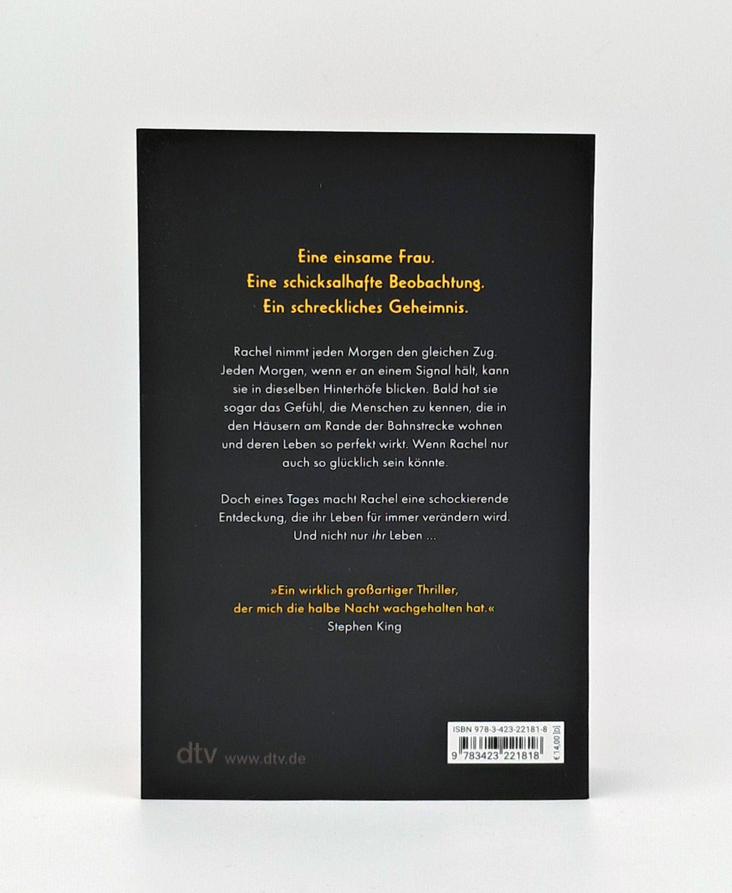 Rachel nimmt jeden Morgen den gleichen Zug. Jeden Morgen, wenn der Zug an einem Signal hält, kann sie in dieselben Hinterhöfe blicken. Bald hat sie sogar das Gefühl, die Menschen zu kennen, die in den Häusern am Rande der Bahnstrecke wohnen und deren Leben so perfekt wirkt. Wenn Rachel nur auch so glücklich sein könnte.