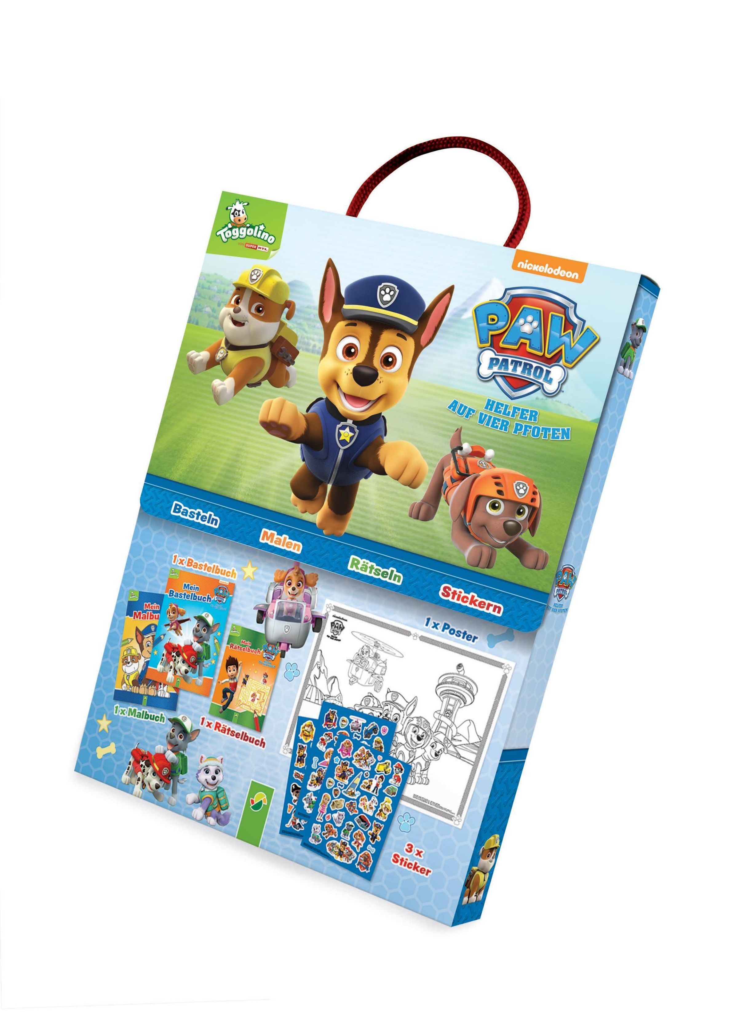 Es ist ein sonniger Tag in Adventure Bay -- und dein nächstes Abenteuer mit der PAW Patrol wartet schon! Begleite Chase, Marshall, Skye und ihre Freunde und tauche ein in eine bunte Welt voller Spaß, Kreativität und kniffliger Aufgaben. Mit diesem liebevoll gestalteten PAW-Patrol-Beschäftigungs-Set bist du bestens ausgerüstet. In der praktischen Box findest du ein Malbuch mit 32 tollen Motiven, ein spannendes Rätselbuch mit Labyrinthen, Suchbildern und Denkaufgaben sowie ein Bastelbuch mit einfachen Anleitungen für Stiftebecher, Bilderrahmen, Lesezeichen, Girlanden und ein Memo-Spiel. Drei farbige Stickerbögen und ein großes Poster zum Ausmalen sorgen für extra Abwechslung. Ob auf Reisen, im Restaurant oder zuhause -- dieses Set bietet dir stundenlange Beschäftigung und jede Menge PAW-Patrol-Spaß. Ein ideales Geschenk für alle kleinen Fans ab 4 Jahren!