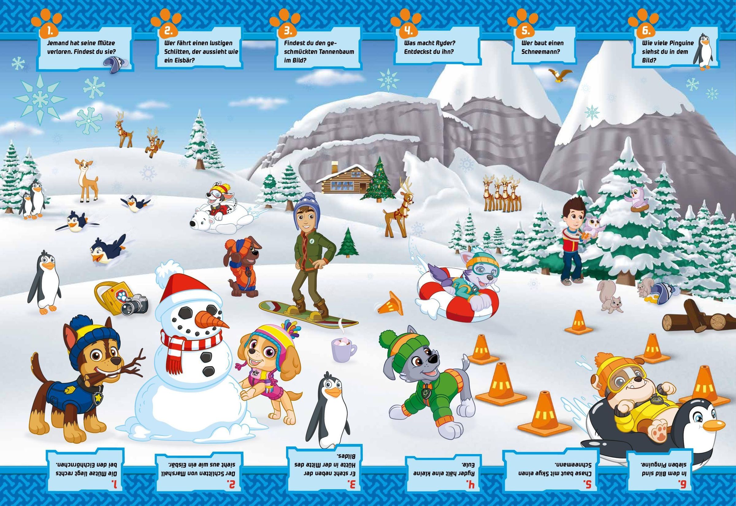 Ab 3 Jahren, Wimmelbuch, Mit Rätselspaß. Illustration von animierten Hundewelpen in bunten Uniformen vor einer Bergkulisse., Buch