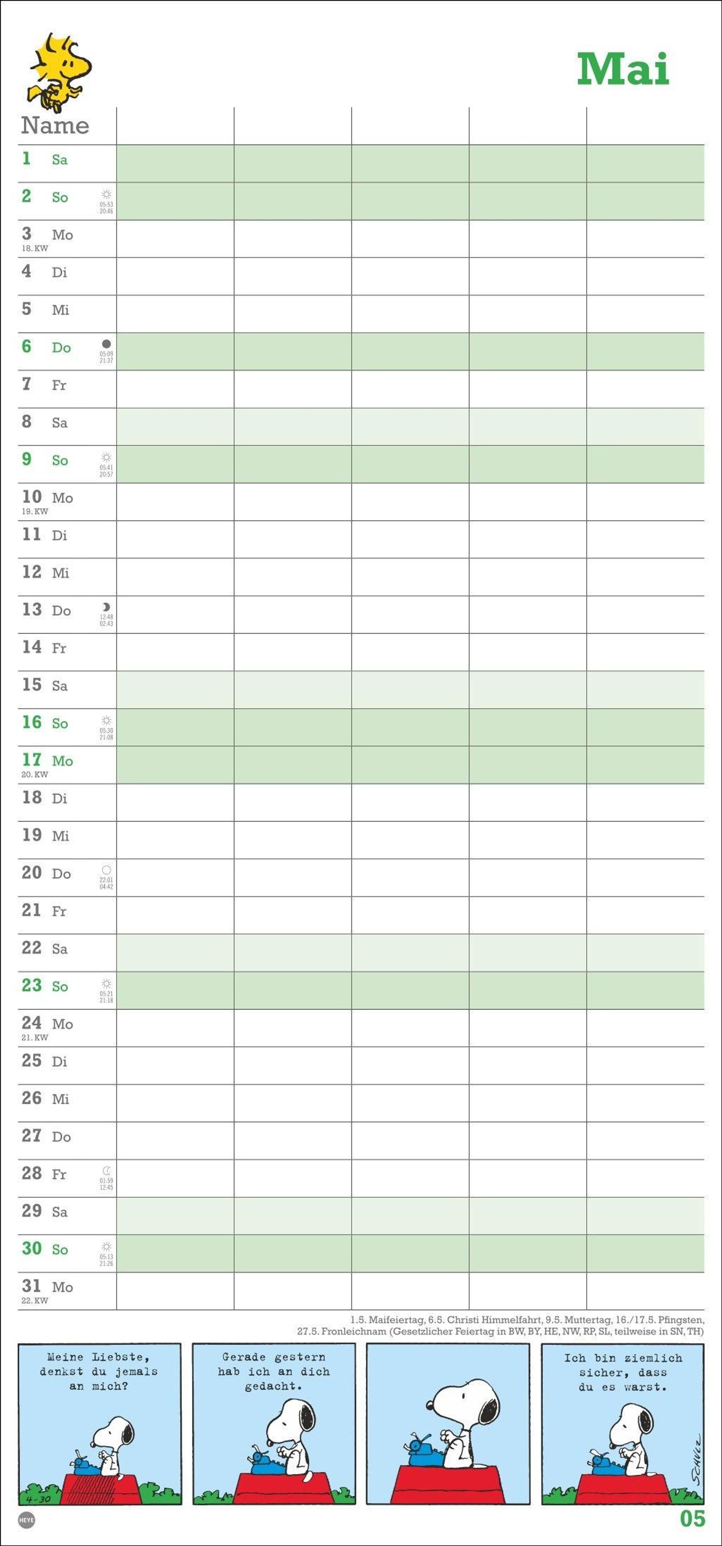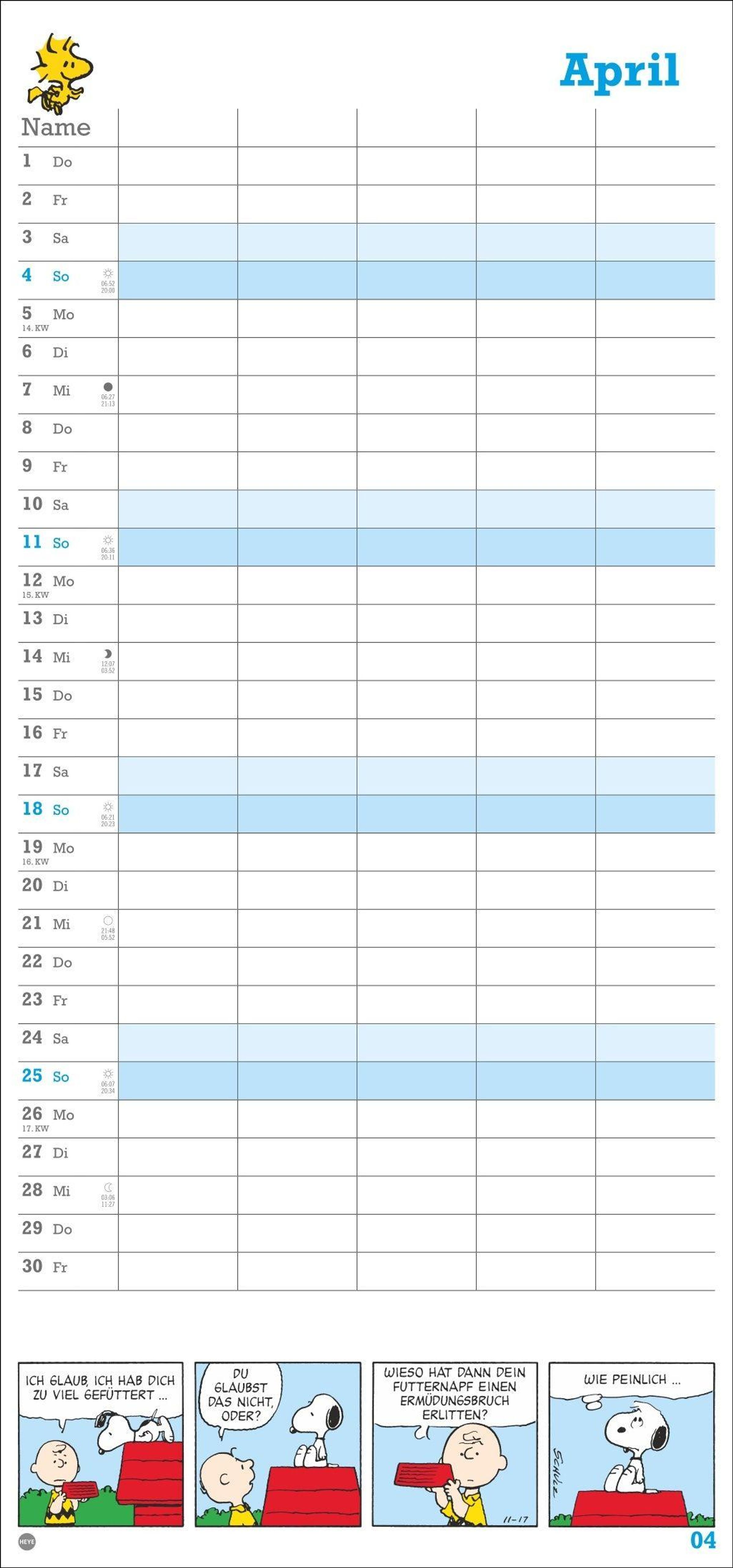 - Kalender für Familien mit 5 Spalten. Humorvoll illustrierter Familien-Wandkalender mit Snoopy, Charlie Brown und Co.
