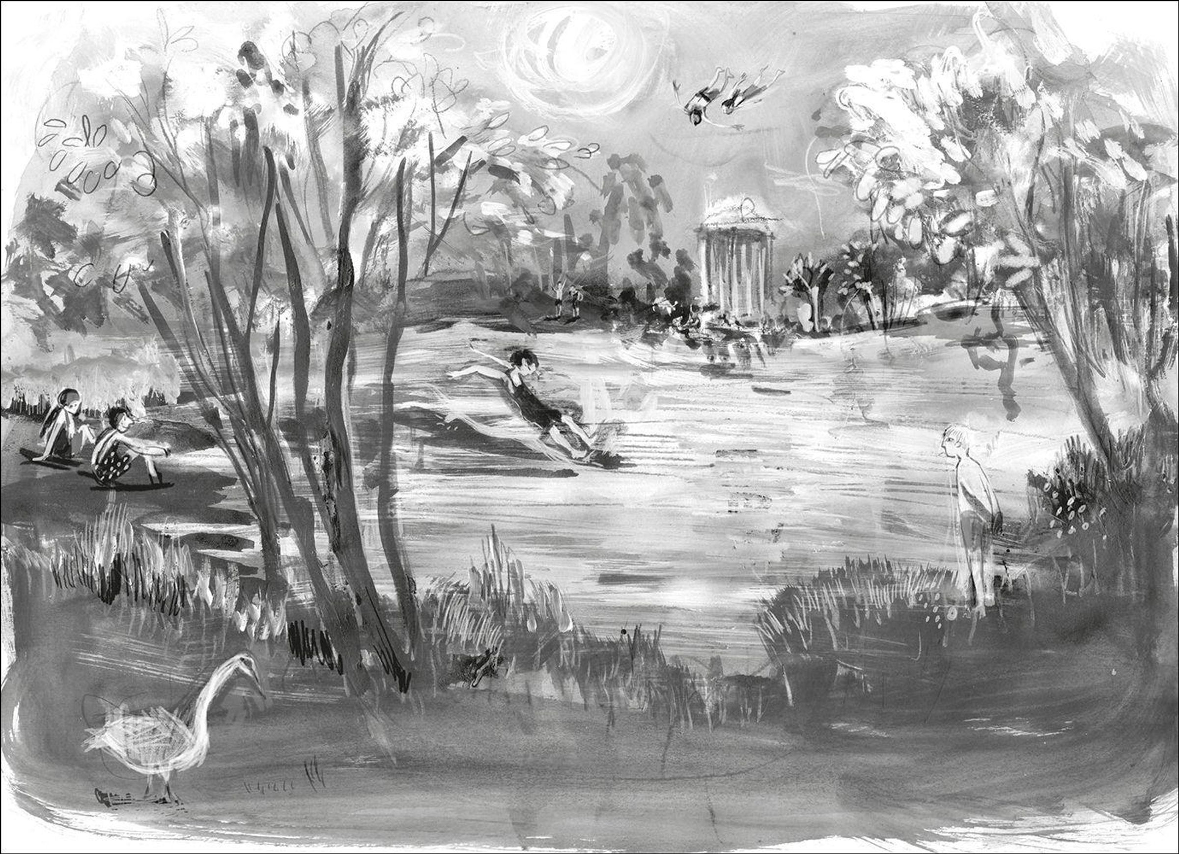 "Sie flogen einen Sommer lang", Penelope Farmer, illustriert von Barbara Yelin. Kinder spielen fröhlich in einer grünen Landschaft., Buch
