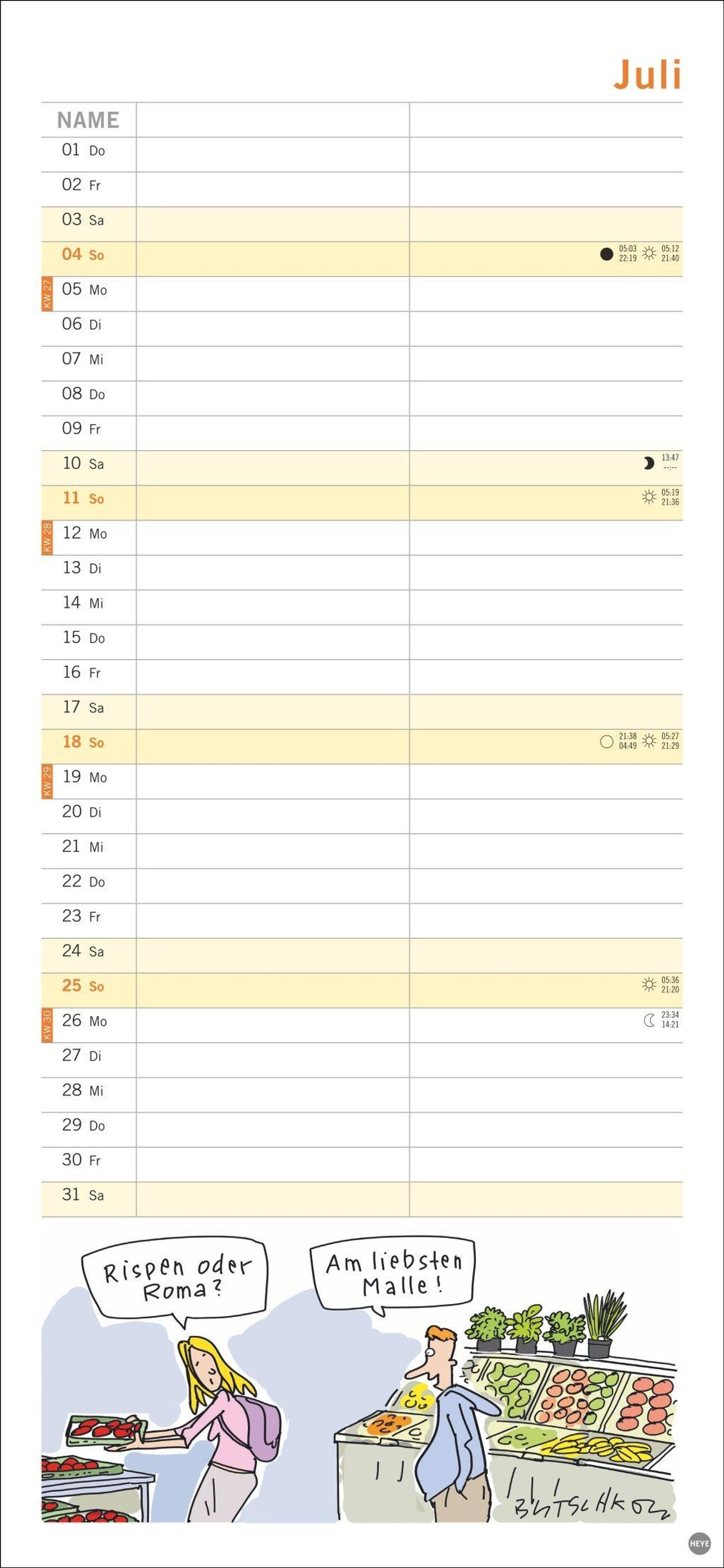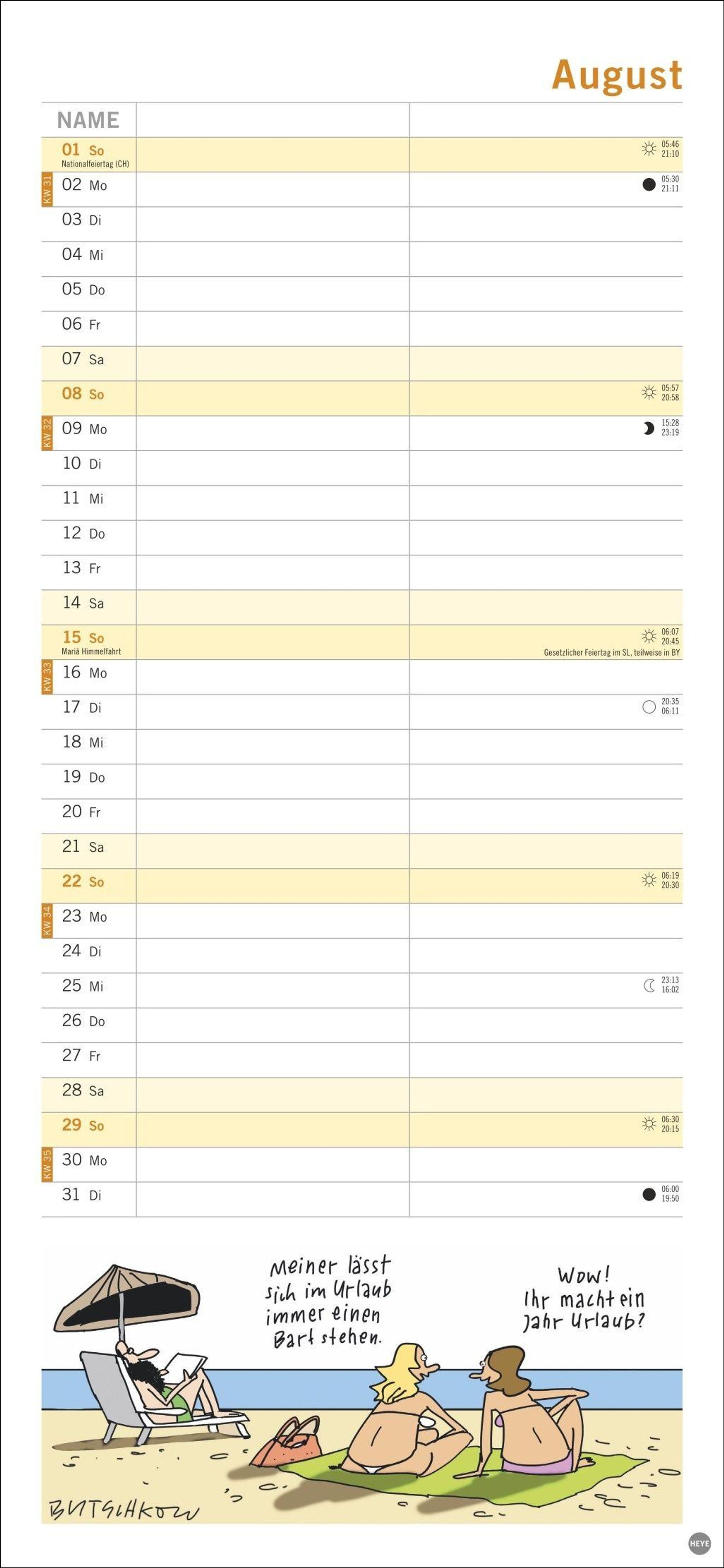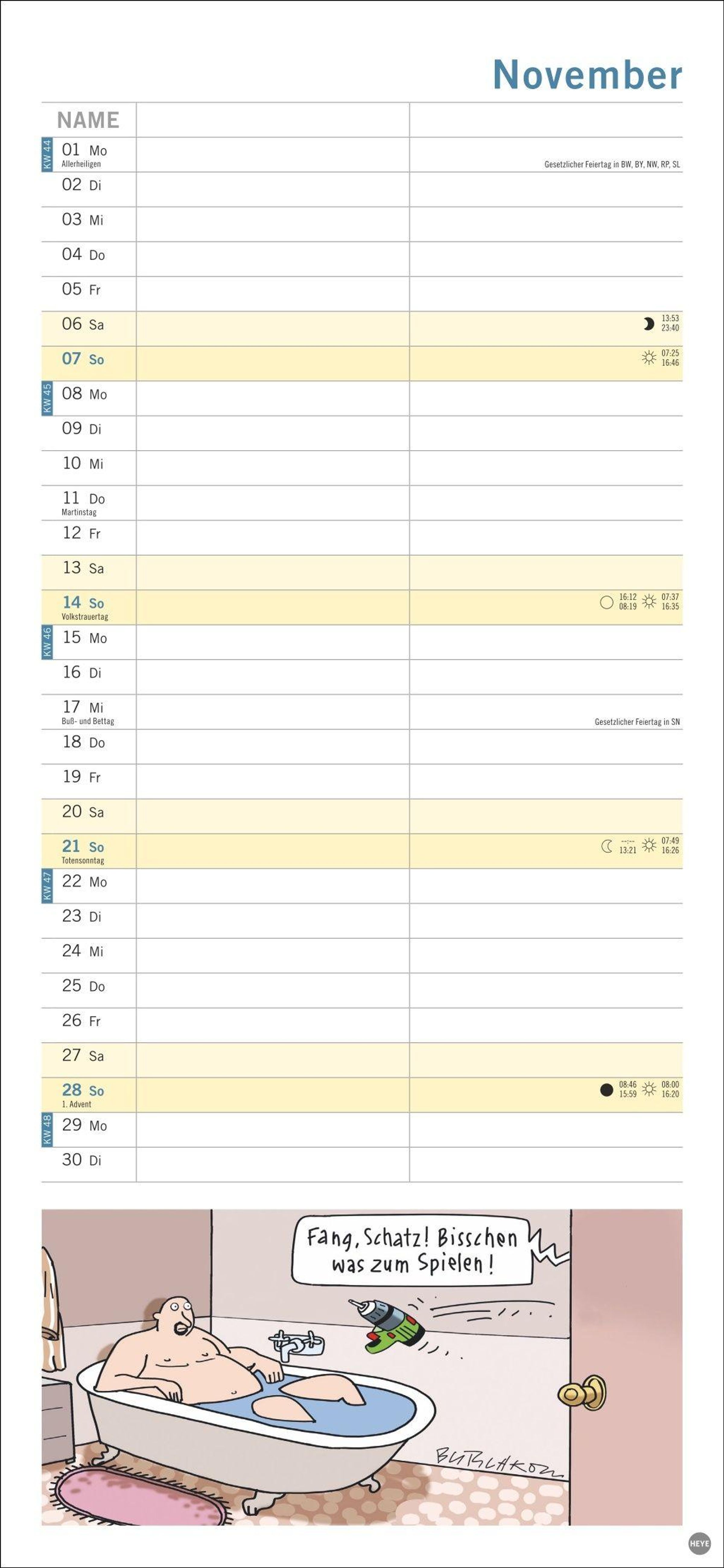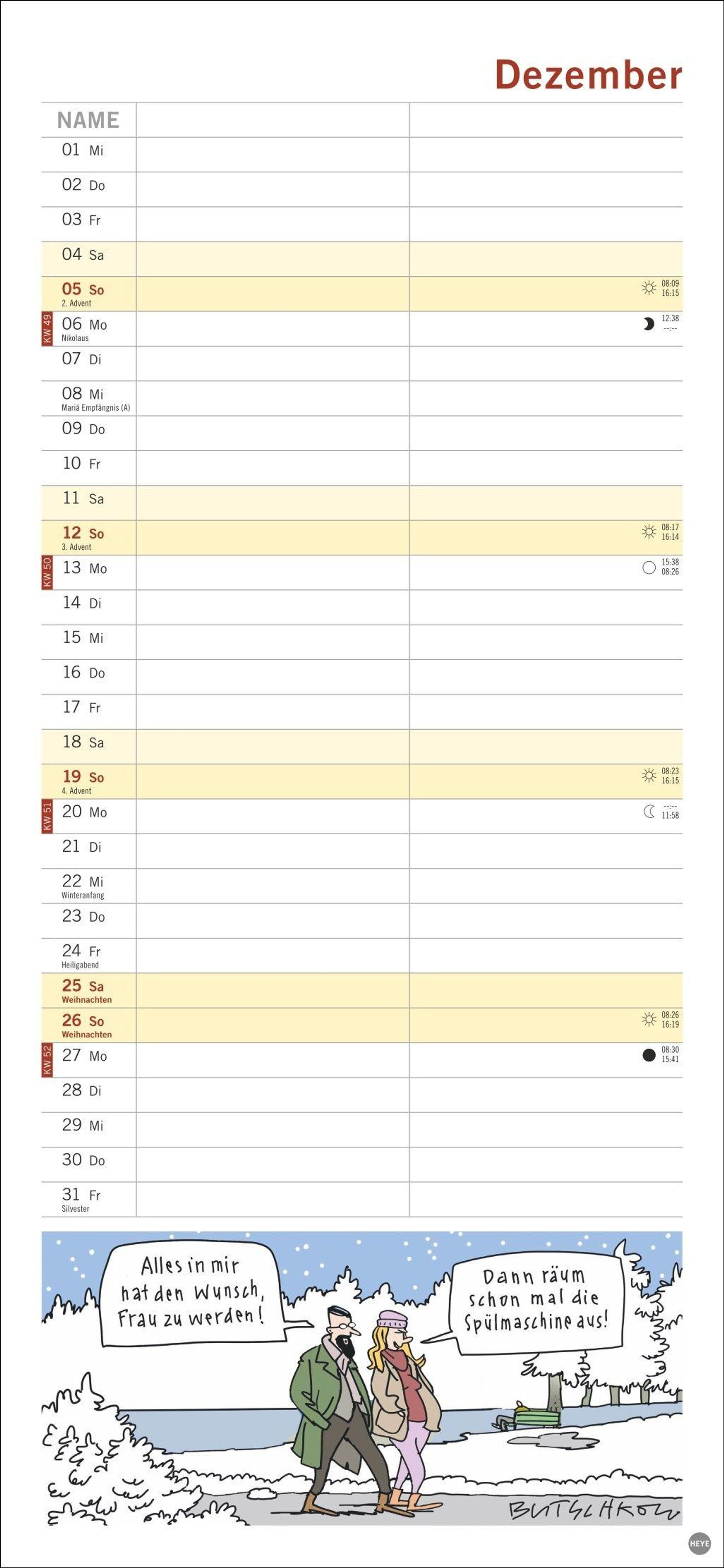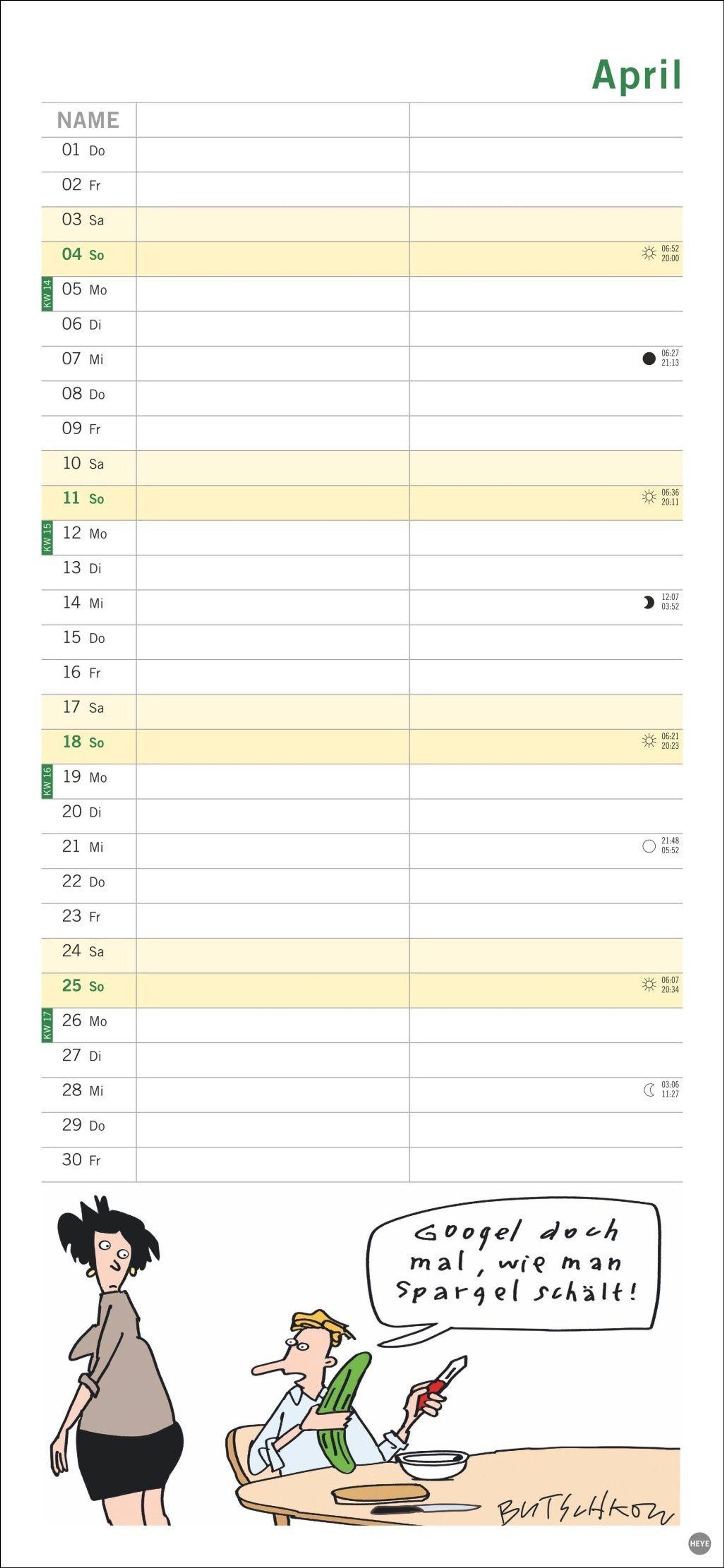 Macht die Planung zum Vergnügen: Das Kalenderformat 16 x 34, 7 cm bietet viel Platz für Eintragungen und für Butschkows witzige Cartoons